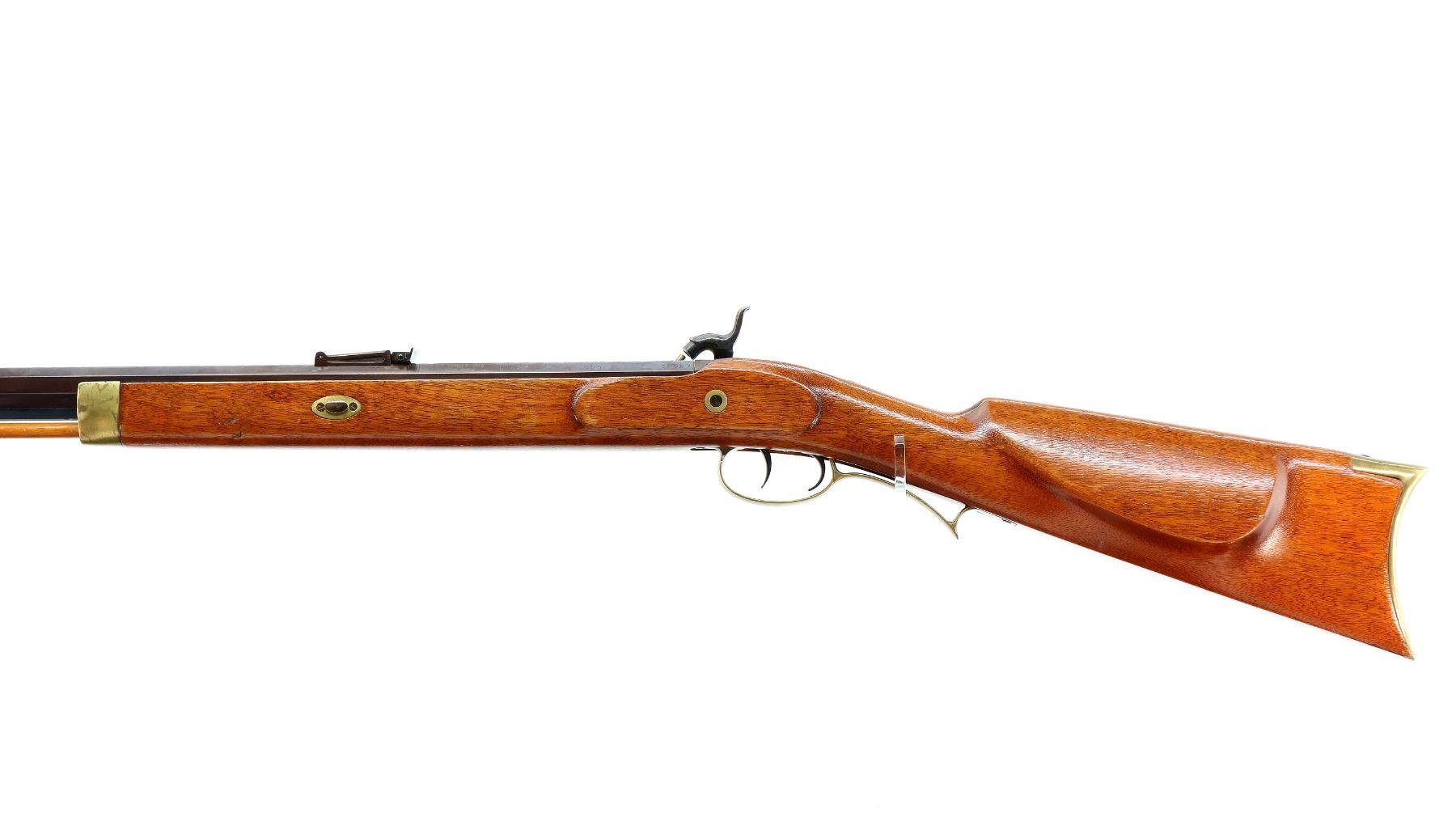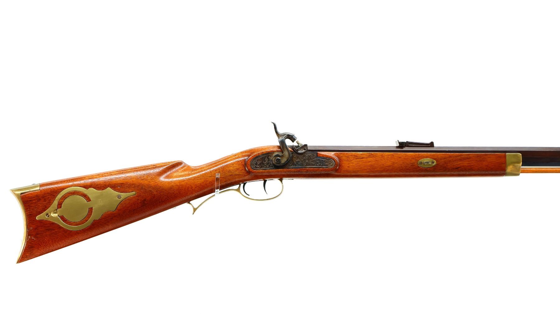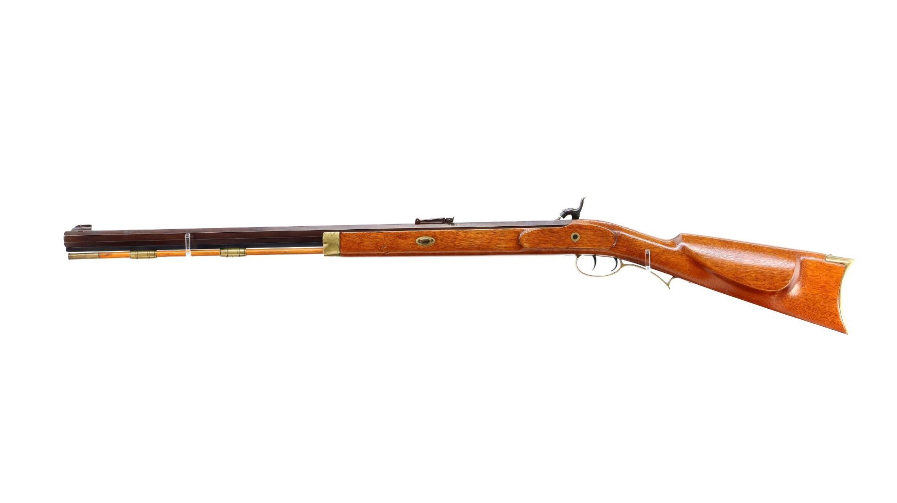 Main Description: Blade front sight, adjustable u notched rear sight with replaced screw, octagon barrel, engraved colour case hardened lock and grooved spur hammer that functions, double set triggers. One piece half length wood stock, single forearm wedge, straight grip, smooth curved brass butt plate, patch box with jags, finger rest trigger guard and nose cap. Wood ramrod with brass tip.