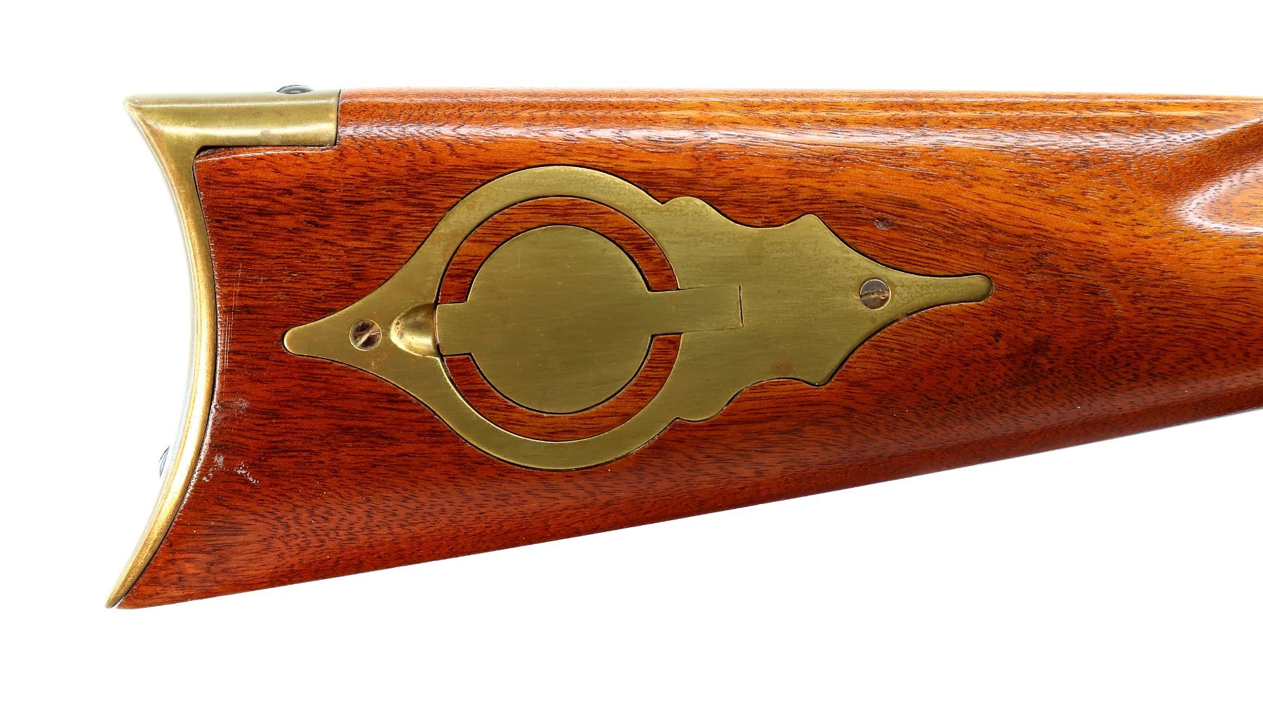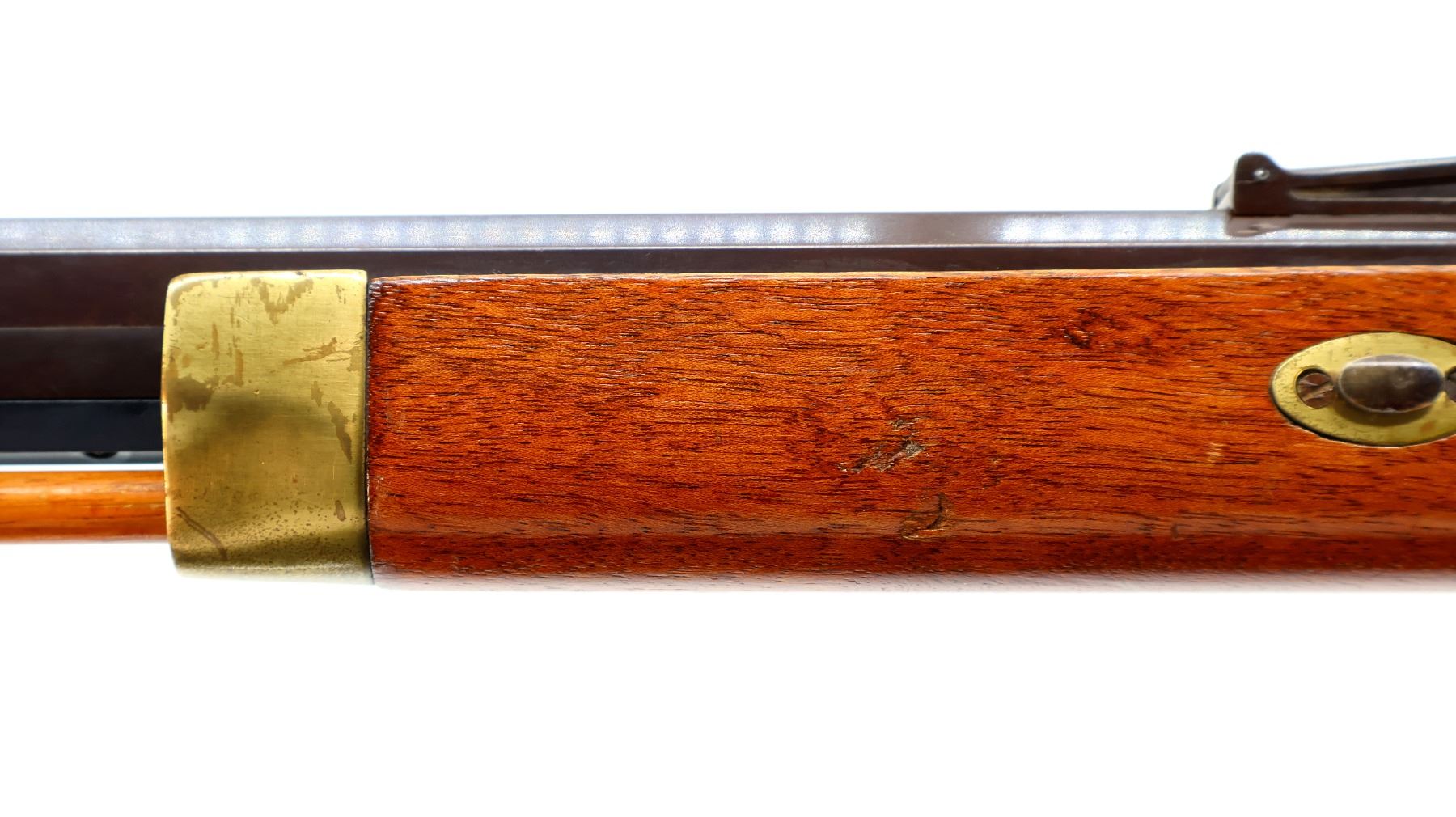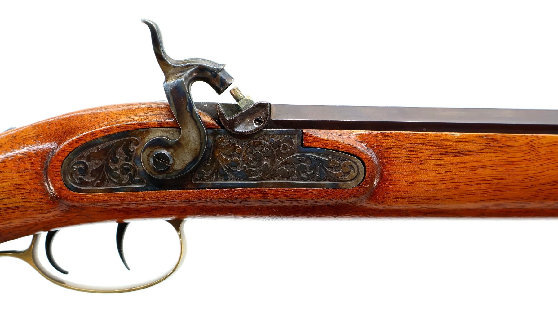 Main Description: Blade front sight, adjustable u notched rear sight with replaced screw, octagon barrel, engraved colour case hardened lock and grooved spur hammer that functions, double set triggers. One piece half length wood stock, single forearm wedge, straight grip, smooth curved brass butt plate, patch box with jags, finger rest trigger guard and nose cap. Wood ramrod with brass tip.