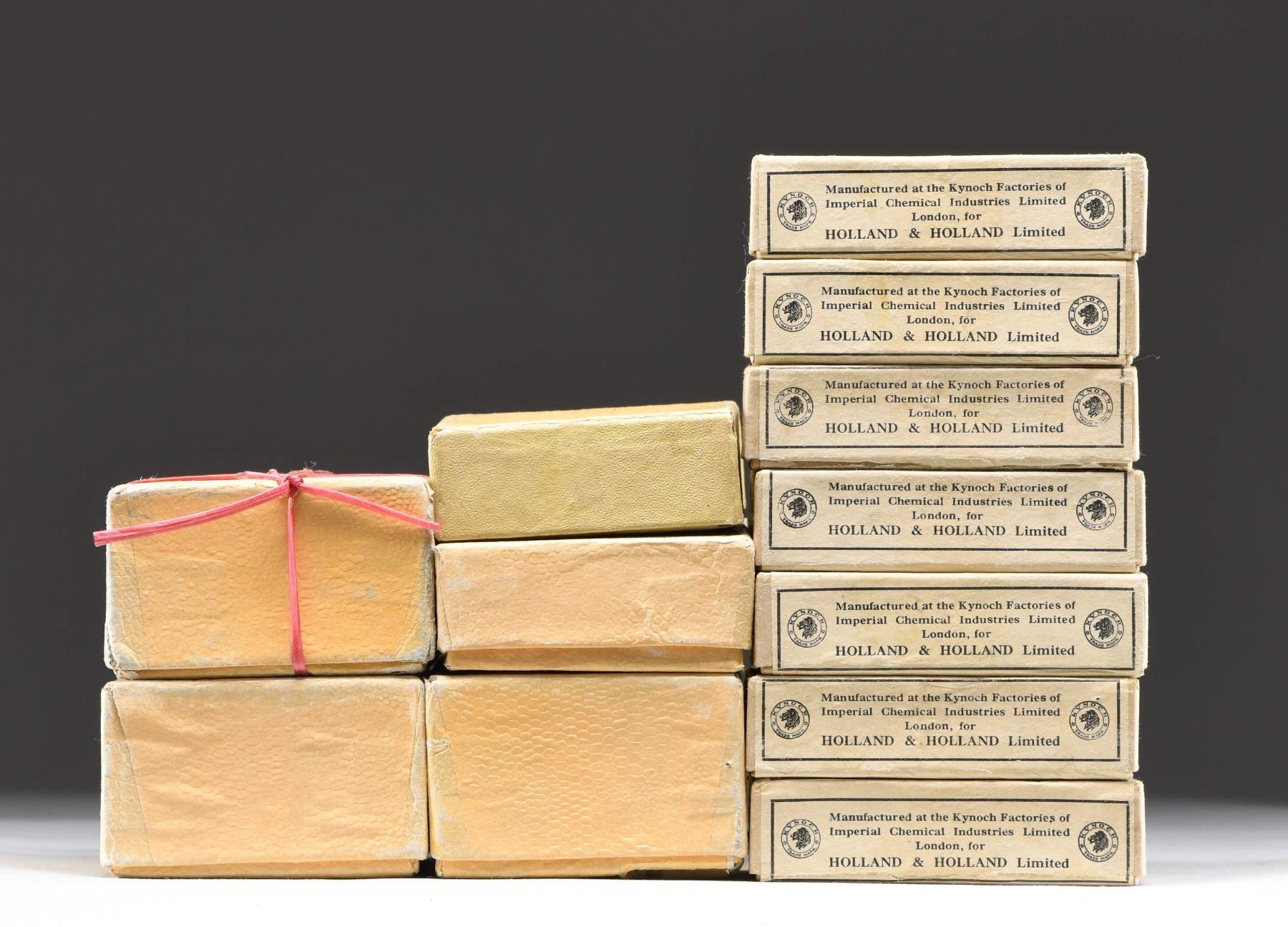 SPORTING AMMUNITION FOR DOUBLE RIFLES. Ammunition loaded by Kynoch Factories of Imperial Chemical Industries for Holland & Holland LTD. There are 7boxes of 10 cartridges each. The white boxes have a diagonal red stripe and are labeled for double barrel rifles. The cartridges are loaded with a 150 gr. semi-pointed soft nose bullet. There are approximately 74 rds. contained in 5 separate boxes unlabled and packed loose. These cartridges appear to be the same loading as previously mentioned. CONDITION: the 7 sealed boxes have light handling wear and staining. The loose cartridges may have light oxidation and patina. PROVENANCE: from the renowned collection of quality sporting arms from Lewis Drake together with inventory of Lewis Drake Associates. (02-23571-2/RW). AMMO. $ 300-500.