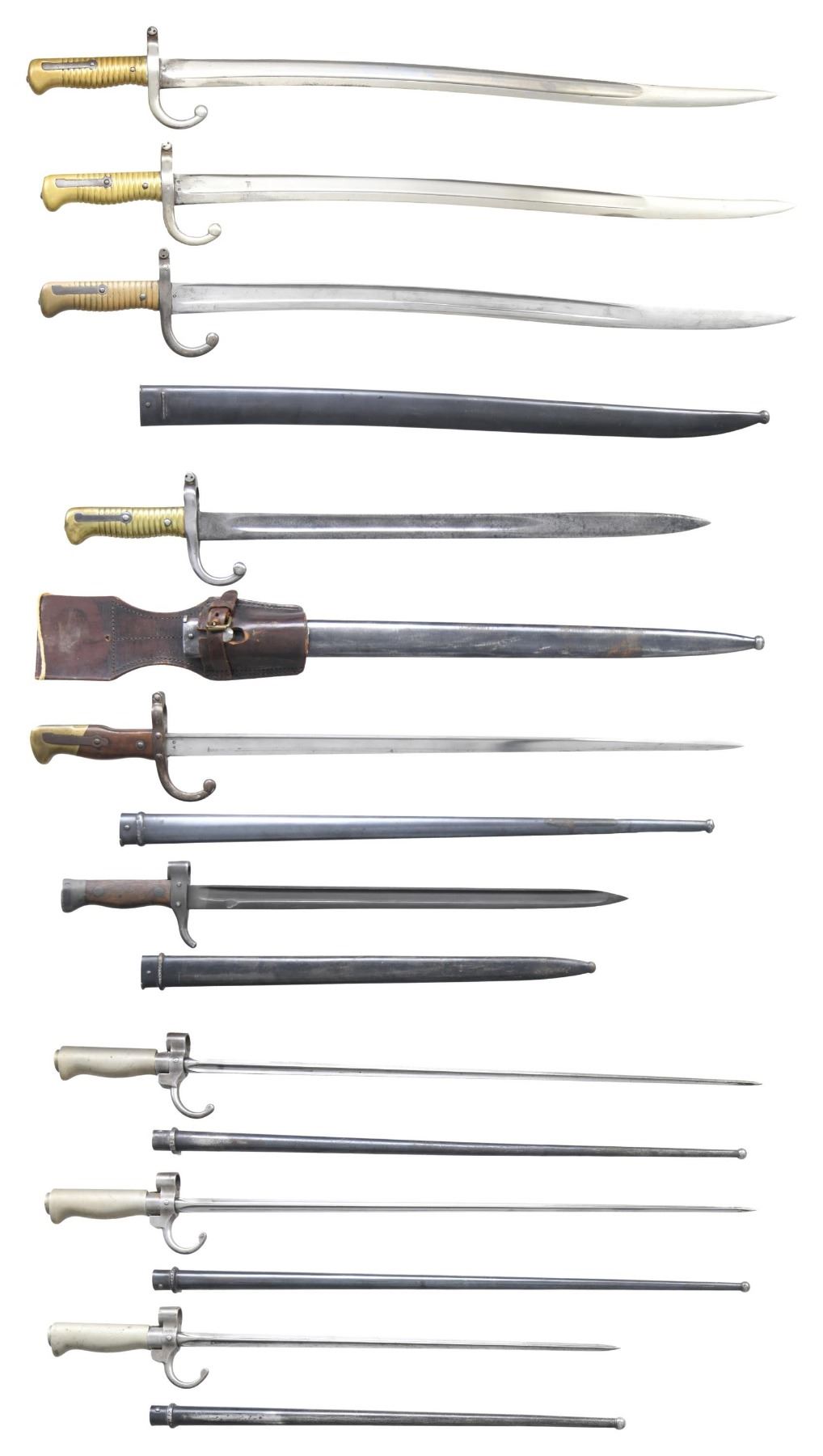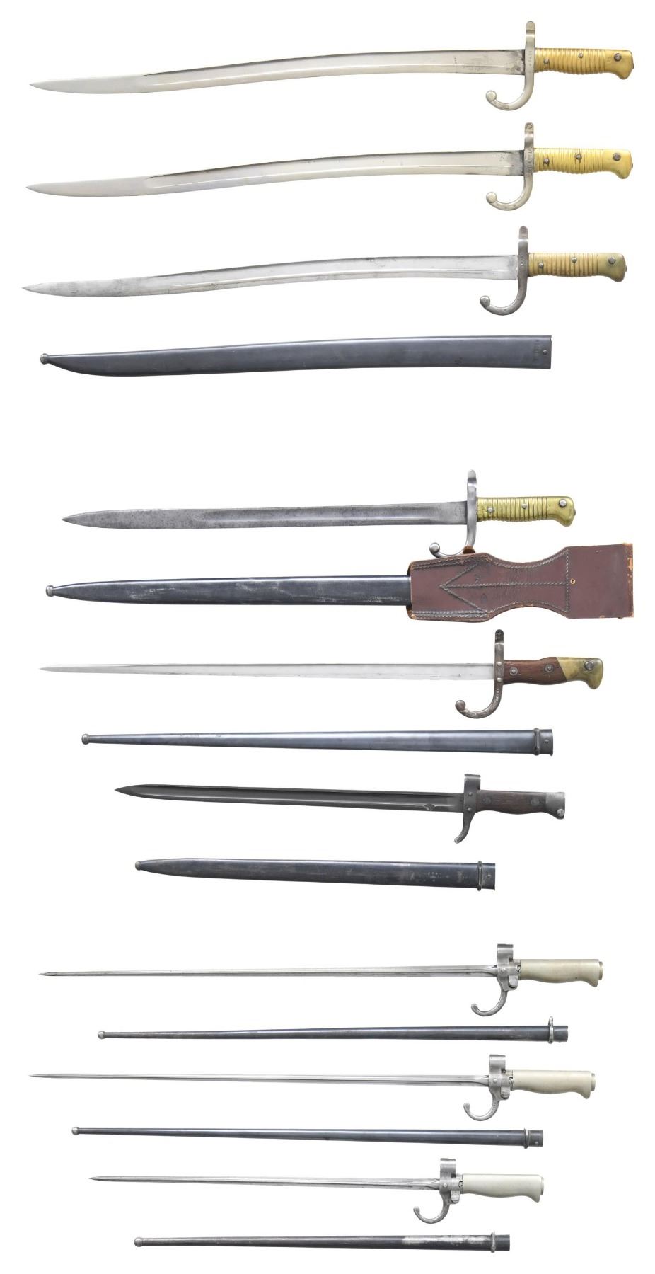 CHASSEPOT, GRAS, LEBEL AND BERTHIER RIFLES. No.1: Model 1892 Berthier Bayonet. Scarce bayonet has a 15 3/4" fullered blade. The fuller extends nearly through the tip. Grooved on the top forward end. Blade also has retaining notches forward of the crossguard. Crossguard is the second pattern w/ the rear wood extending muzzle ring. Smooth walnut grips retained by two rivets. Blued steel scabbard w/ ball finial. CONDITION: bayonet & scabbard have moderate wear & handling marks, but retains a large degree of original finish. No.2: Three Model 1886 Lebel Bayonets. Quadrangular blades. Two have 20 1/4" blades, one having a 15 3/4" blade. All have curved quillons & silver covered alloy grips. Blued steel scabbards. CONDITION: all in similar worn, but serviceable condition. Scabbards retain a good percentage of original blue finish. No.3: Model 1874 Gras Bayonet. 20 1/2" "T back" blade. Numbers match on scabbard & crossguard. Blade is marked on back in script "ST. STEVEN / MARCH 1878". Curved quillon w/ adjustable muzzle ring. Smooth hardwood grips w/ brass pommel. Blued steel scabbard. CONDITION: bright blade has light staining. Grips are worn w/ small crack on left side. Crossguard turning patina. Pommel is pleasing dark patina. Scabbard retains 70% original blued finish w/ area of oxidation near tip. No.4: Model 1866 Chassepot Bayonet. 18 3/8" fullered blade. Blade is marked on left ricasso "R. KIRSCHBAUM SOLINGEN". Bayonet likely manufactured in Germany for use w/ captured Chassepot rifles. Blade has notably straighter profile than French examples. Curved quillon. Adjustable ring. Grooved brass grip. Blued steel scabbard equipped w/ brown leather period frog. Frog markings on back include "PORTE" in oval & oval cartouche in wreath w/ "EA". CONDITION: worn bayonet & grip have been heavily cleaned over light pitting. Scabbard retains 50% of its blued finish w/ thinning wear & areas of oxidation. Frog is in good serviceable condition w/ tight stitching. No.5: Model 1866 Chassepot Bayonet. 22 1/2" fullered curved blade. Bayonet is unmarked except for French acceptance marks & S# on left side of the curved quillon. Grooved brass handle. Scabbard is not present. Metal has been cleaned over fine pitting. Brass handle returning to its patina'd appearance. No.6: Model 1866 Chassepot Bayonet. 22 5/8" fullered curved blade. Bayonet is unmarked except for French acceptance marks & S# on left side of the curved quillon. Grooved brass handle. Scabbard is not present. Metal has been cleaned over fine pitting. Brass handle returning to its patina'd appearance. No.7: Model 1866 Chassepot Bayonet. 22 3/4" curved fullered blade. Blade is marked on top w/ "TULLE" & "FEBRUARY 1877". Curved quillon w/ adjustable muzzle ring. Ribbed brass handle. Matching blued steel scabbard is present. CONDITION: bright blade turning gray. Handle has pleasing patina. Scabbard w/ light wear & small dents retains most of its original blue finish. (02-24261-6/RW). NON-GUN. $600-800.
