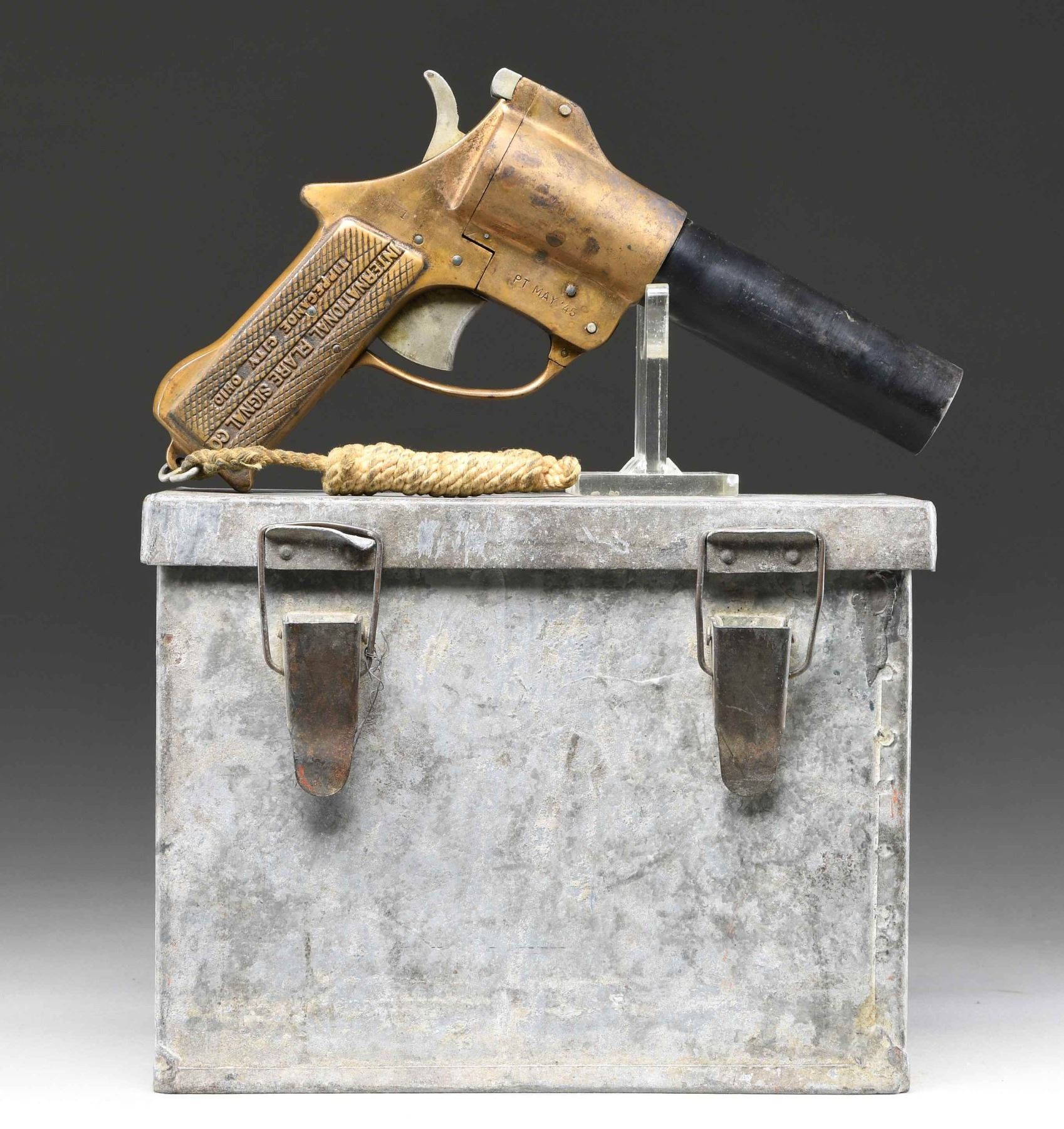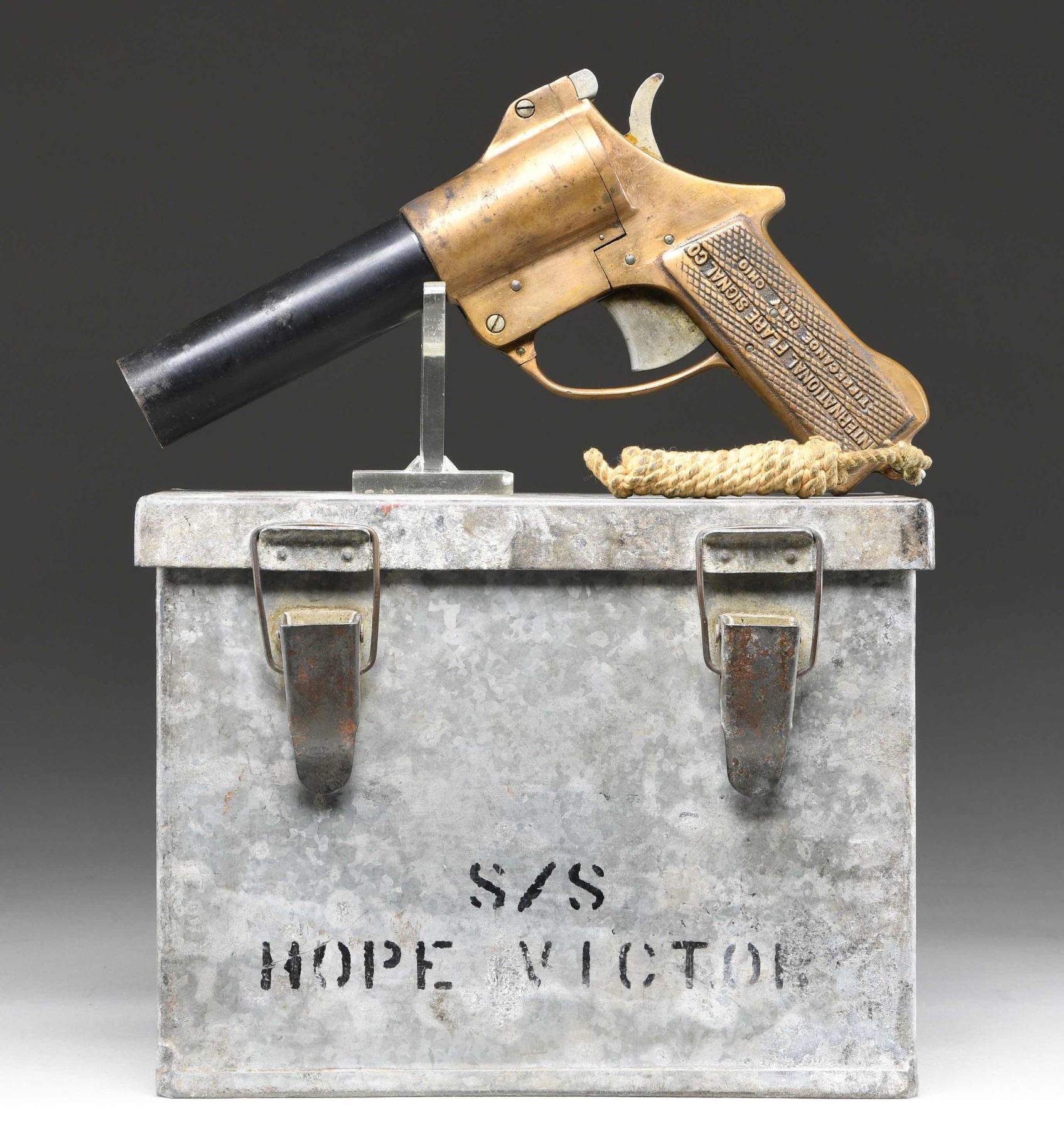 GUN. Cal. 37MM. S# 31551. Bbl. 8 1/8" smoothbore. Gun is accompanied by a galvanized steel box stenciled with "S/S HOPE VICTORY. The HOPE VICTORY was a general cargo ship of 7607 gross tons built in 1945. The gun is of brass construction with a blued steel barrel. Both sides of the grip have " INTERNATIONAL FLARE SIGNAL CO/ TIPPECANOE CITY OHIO". Marked on right side of frame" PT MAY '45". Lanyard loop on butt w/ cotton lanyard. UNATTACHED ACCESSORIES: 12"X6 1/4" X 9 1/4" Galvanized storage box. Empty cardboard flare carton marked for red parachute flares dated 1968. CONDITION: Gun has moderate wear and staining turning patina. Steel barrel has most of its blue finish. Box has wear and oxidation commensurate with extended service at sea. Flare carton has legible markings. PROVENANCE: from the renowned collection of quality sporting arms from Lewis Drake together with inventory of Lewis Drake Associates. (02-23530/RW). Non-Gun. $200-400.