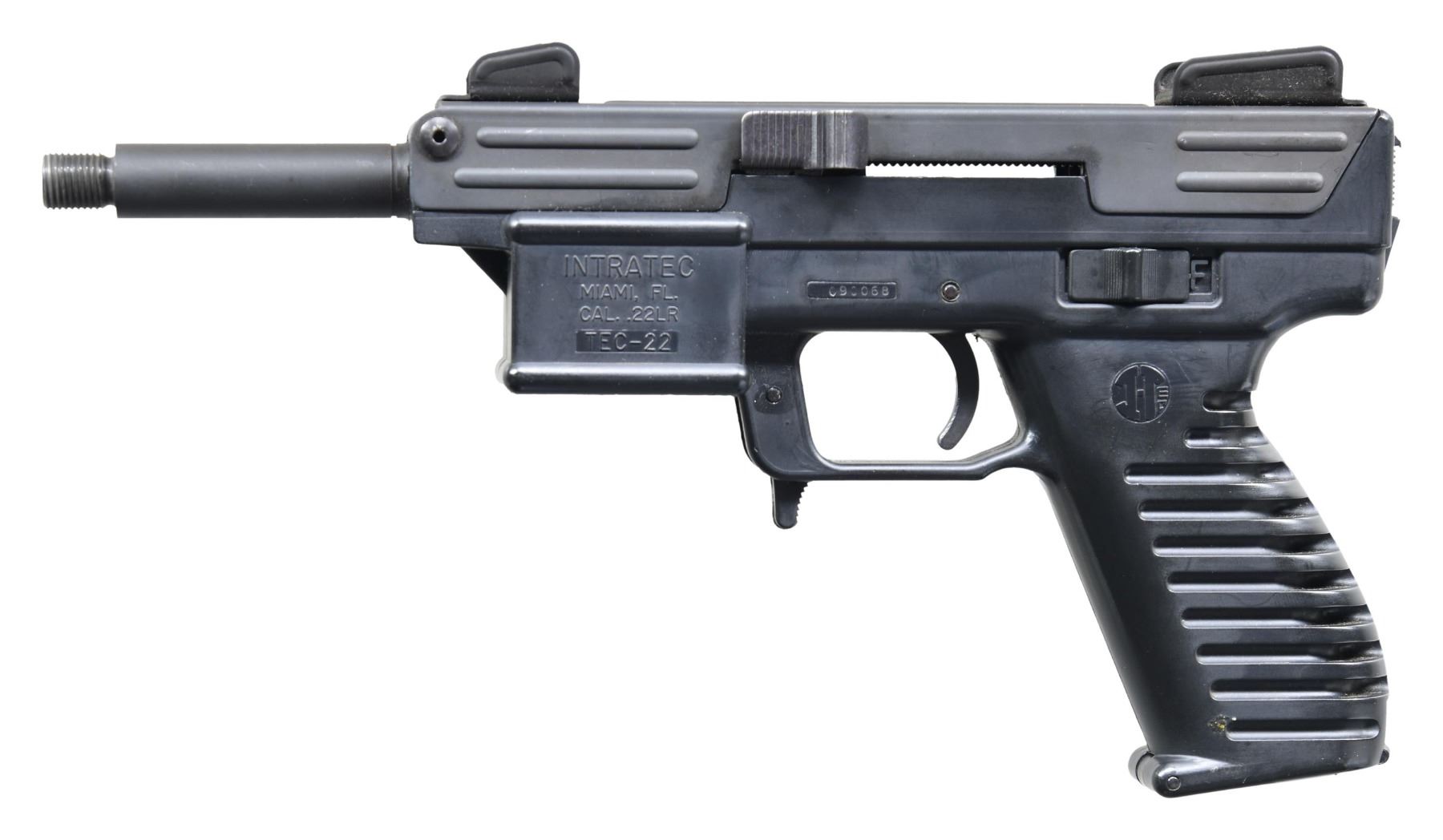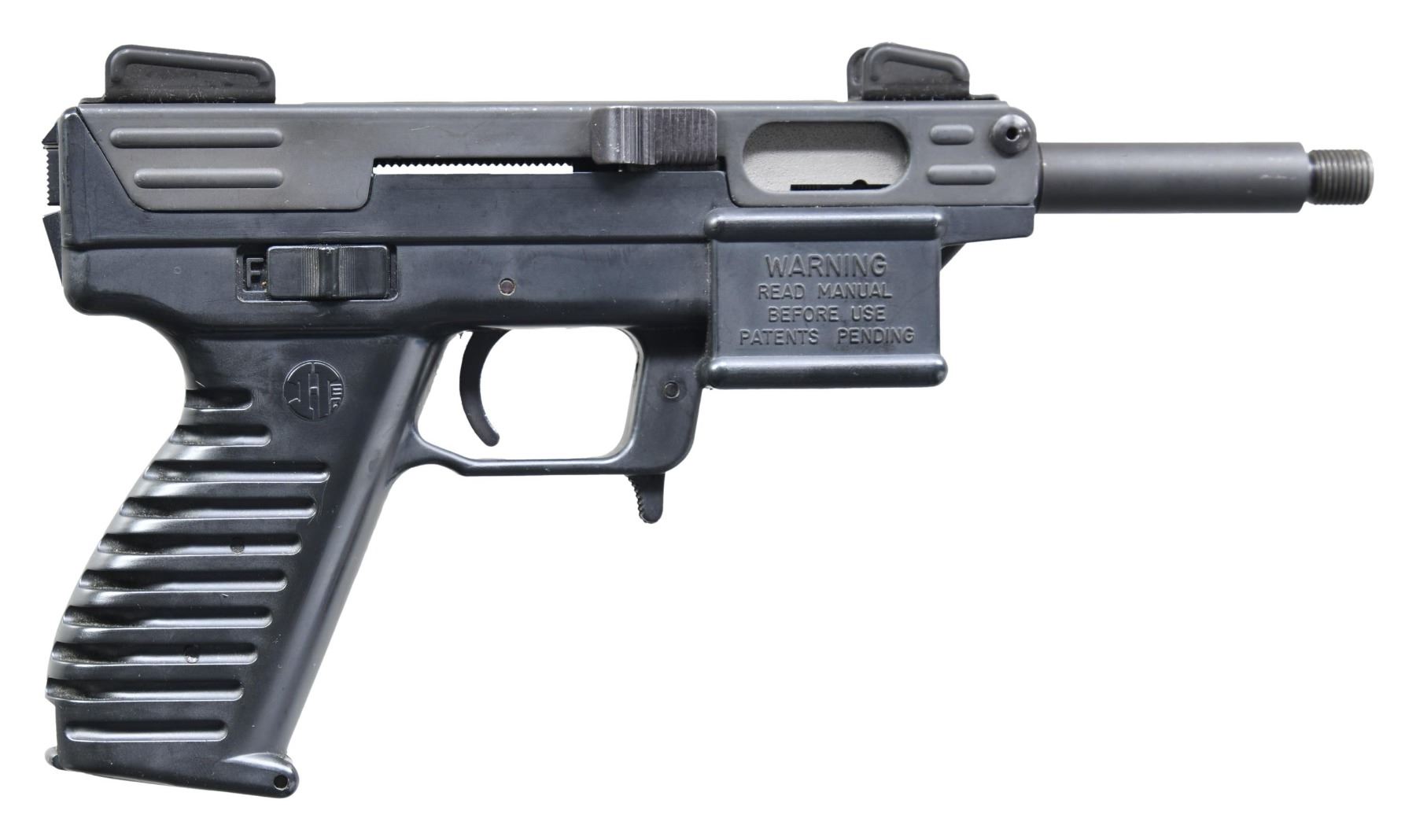 Cal. 22 LR. S# 090068. Mfg. 1991-1994 in Miami, FL. Designed to utilize Ruger 10/22 rotary mags. Threaded 4" bbl. Post front sight painted red with protective ears. Adjustable square-notch rear sight. Matte black finish. Black polymer frame with grip grooves. MAGS: NONE. CONDITION: very good to near excellent appearance with minor handling wear. Very good bore. (25-2404/MD). MODERN. $200-400.