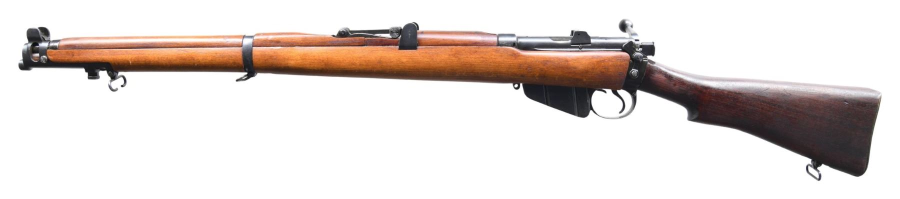 Cal. 303 Brit. S# F18833. Bbl. 25 1/2" dated 1938. Blade front sight with protective ears. Tangent rear sight graduated to 2000m. Matching numbers on receiver, bolt, bbl & nosecap. Forend is unnumbered & rear sight has two sets of numbers that do not match receiver. Receiver ring has two sets of serial numbers one of which is struck through. Receiver top has "303 Brit" import marking. Bbl. shank & top of receiver both have circled "FF" marking denoting Fianna Fail use by Free state of Ireland. Right rear of receiver has Samco import marking. Right side of socket has Enfield & SHTLE III* markings with 1918 date. Suncorite finish. Hardwood stock set with butt having a notably darker appearance than forend. Buttstock has a "D" over Broad Arrow marking. Bottom mounted sling swivels. MAGS: 1-10 rd. detachable & unnumbered. CONDITION: stock set appears arsenal refinished with two armorer reinforcements on rear of handguard, some dings & handling wear. Metal retains 95% arsenal rework blue with some pitting beneath the finish, edge & handling wear. Action functions properly when hand cycled. Bright very good bore with strong rifling. (25-2212/MJC). CURIO. $300-500.