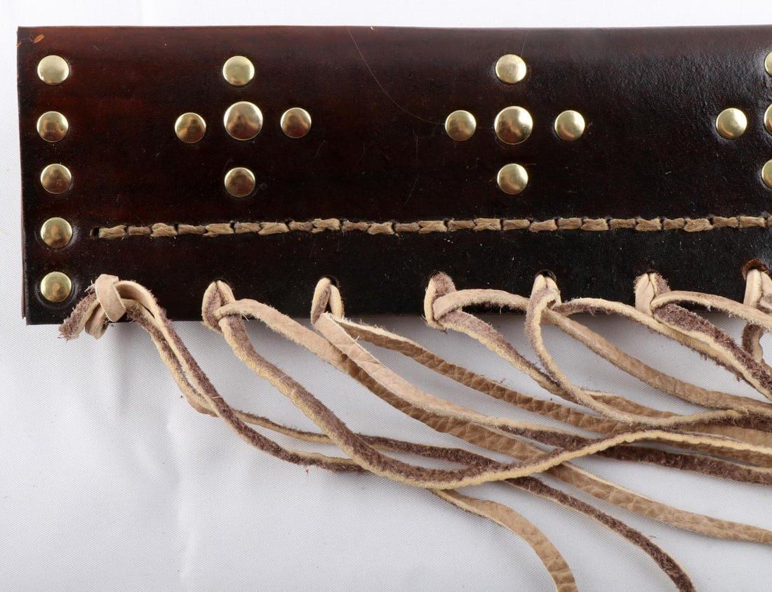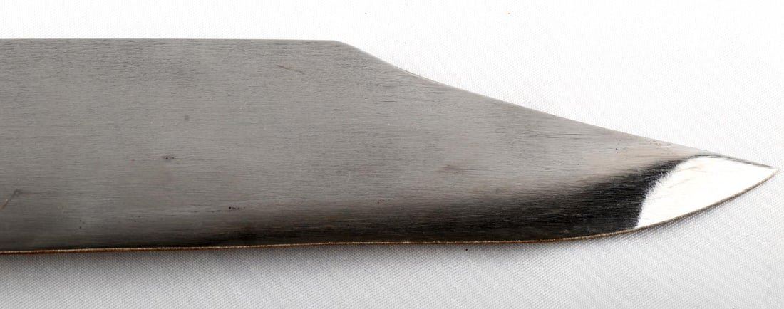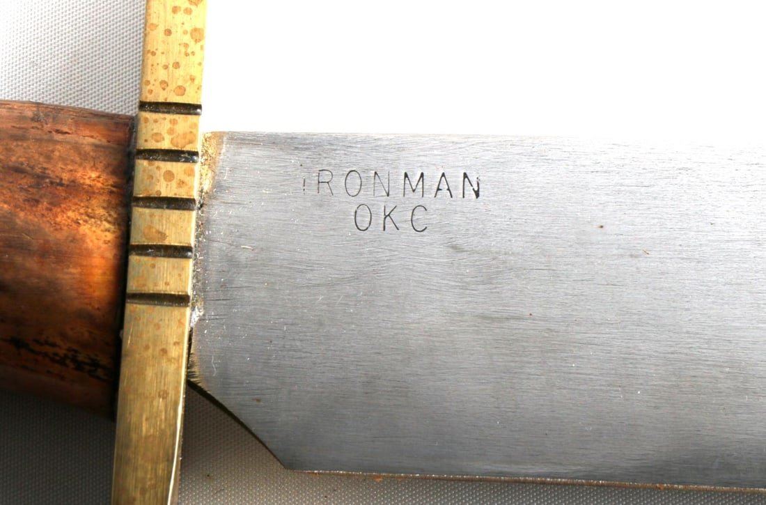 Large bowie knife with 5 inch antler handle, brass cross guard and 9 inch blade. Blade is very clean and stamped Ironman OKC. Leather sheath appears new. Total length with sheath is 15 inches.