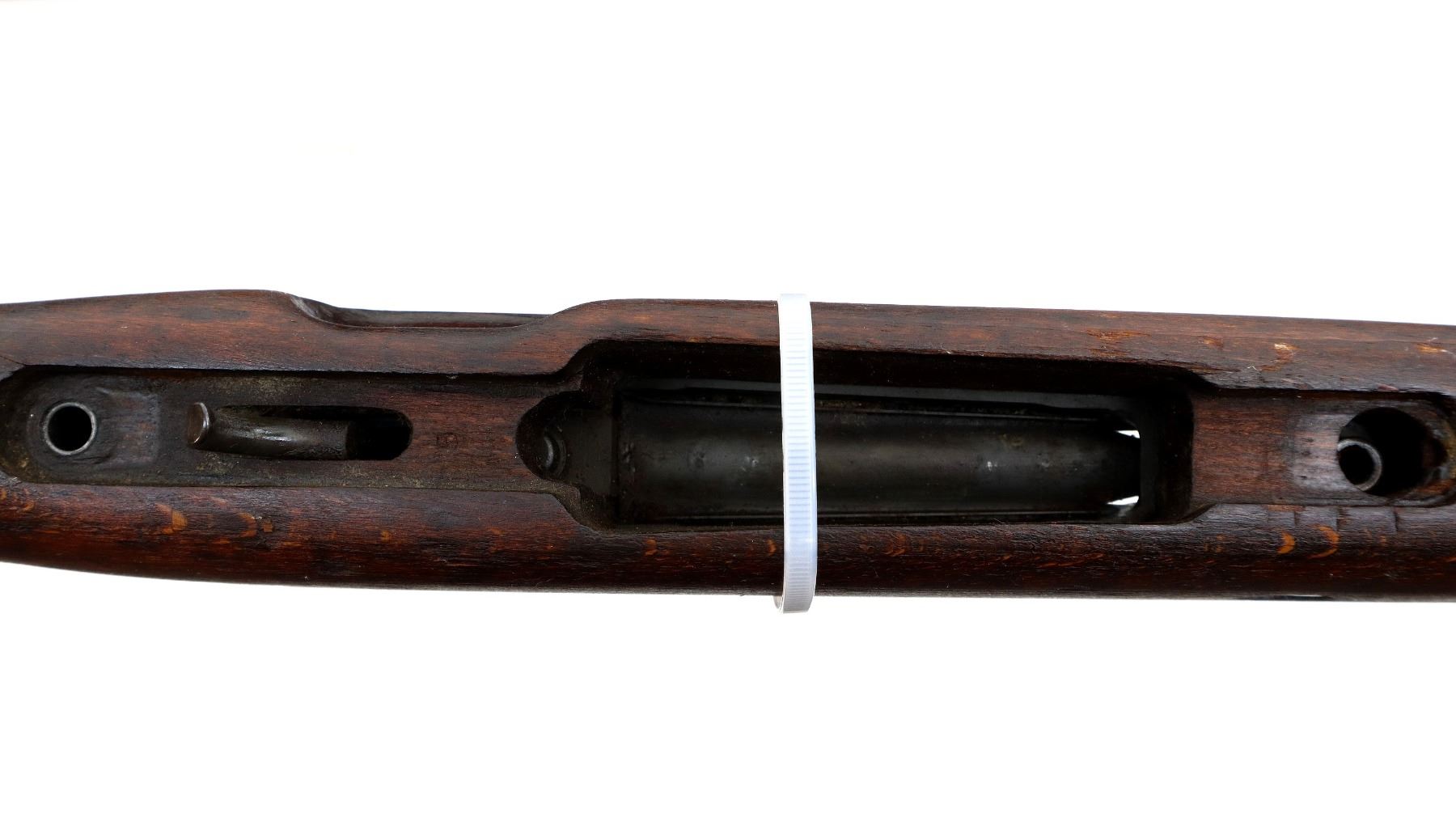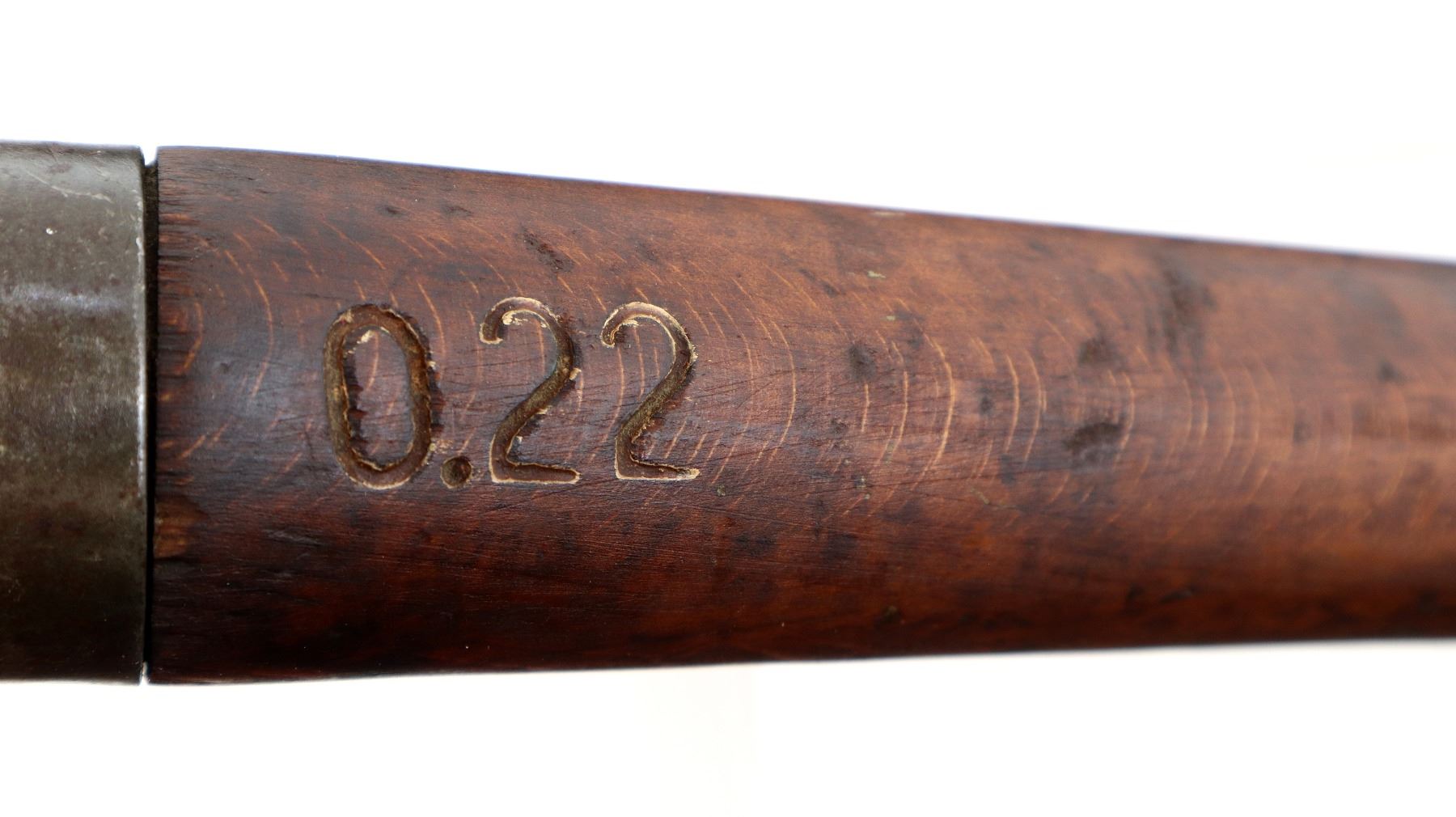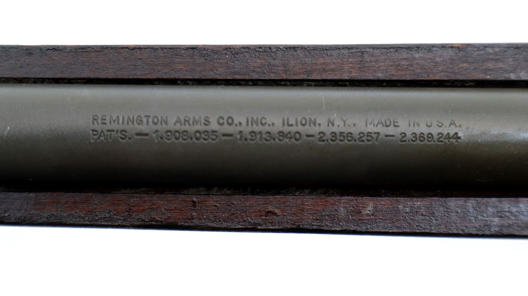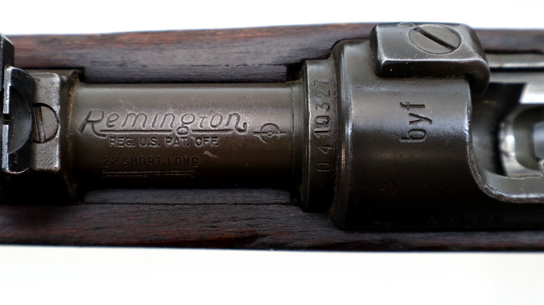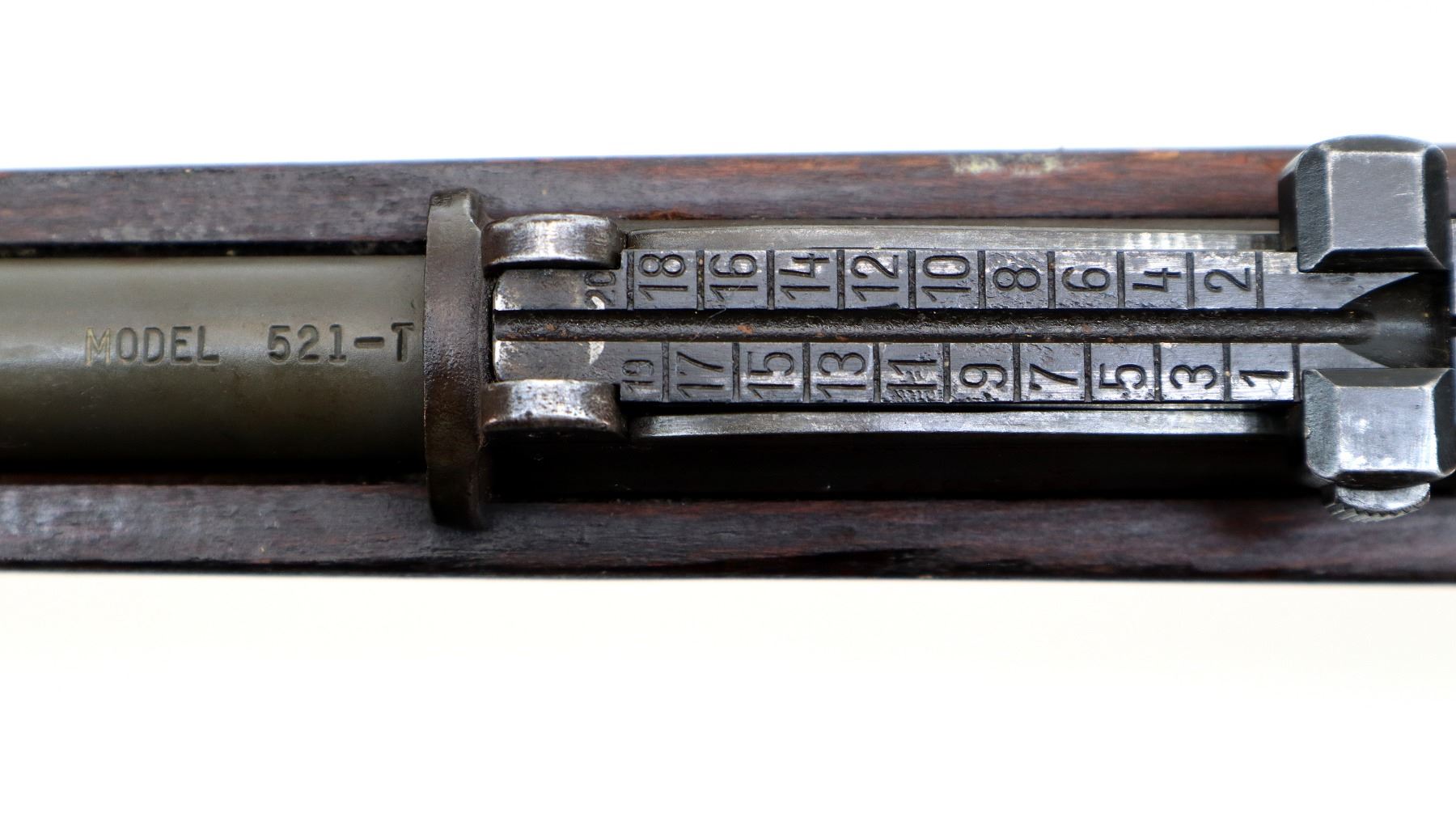 Main Description: Receiver manufactured by BYF, Barley corn front sight with ramp, adjustable u notched rear sight, Parkerized metal finish, barrel is marked Remington 521-T, Includes bolt stop, trigger and sear. Missing bolt assembly, trigger guard, action screws, top handguard, barrel bands and associated parts. Has one piece full military wood stock, finger grooved forearm, pistol grip, smooth cupped steel butt plate, rear sling slot.
