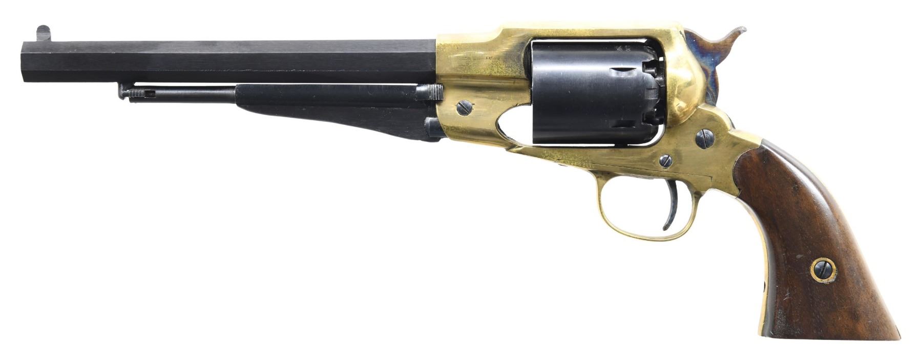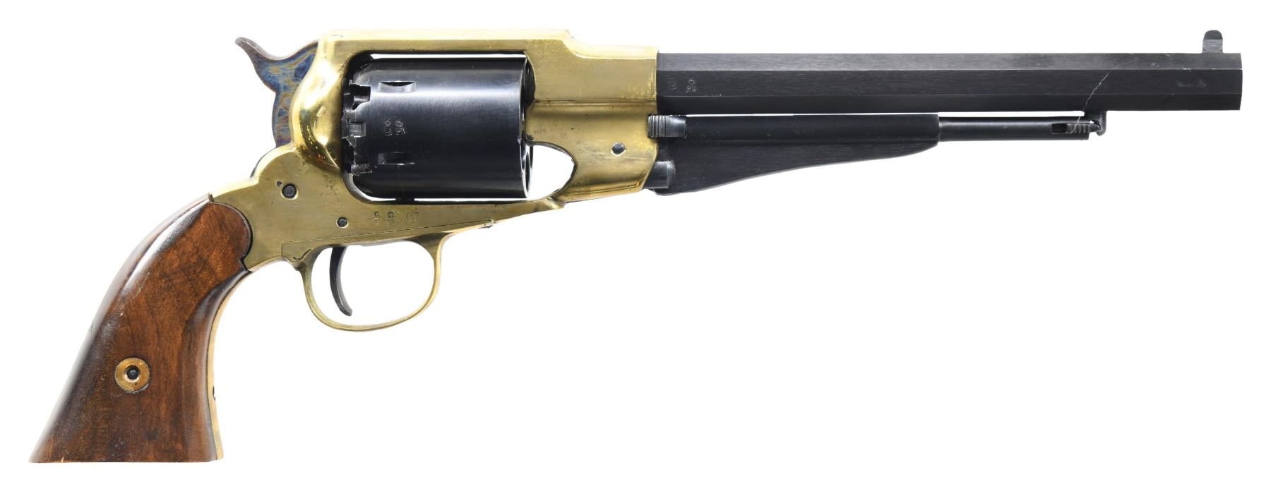 Cal. 44. S# 2759. Italian "XX7" proof indicates 1971 mfg. Blued oct. 8" bbl., lever & 6 shot cyl. Blade front sight. Brass frame. 2 Piece wood grips. CONDITION: good blue. Brass acquiring patina. Good grips. Very good bore. (01-27366/MD). ANTIQUE. $75-150.