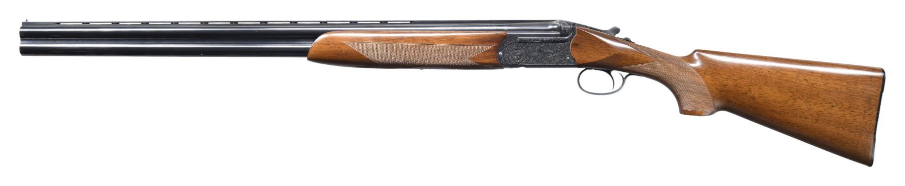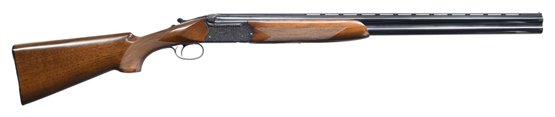 Cal. 12 Ga., 2 3/4". S# 16681. Bbl. code "XX9" indicates 1973 mfg. VR 27 5/8" bbls. w/ brass bead. Bore chokes measure Full. Blued action w/ generous coverage of scroll engraving along w/ "PEDERSON" on sides. Action features SST & ejectors. Checkered walnut stock set w/ hard rubber buttplate. CONDITION: all aspects very good to near excellent with light handling marks. Shiny bores with light fouling. (25-3204/MD). CURIO. $400-600.