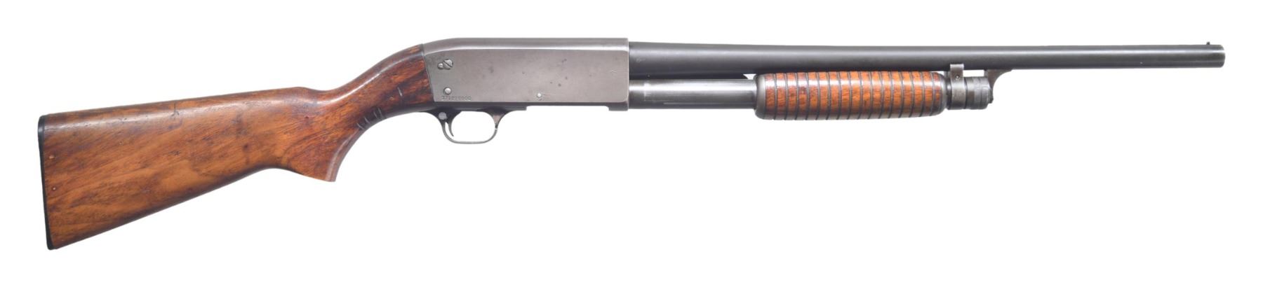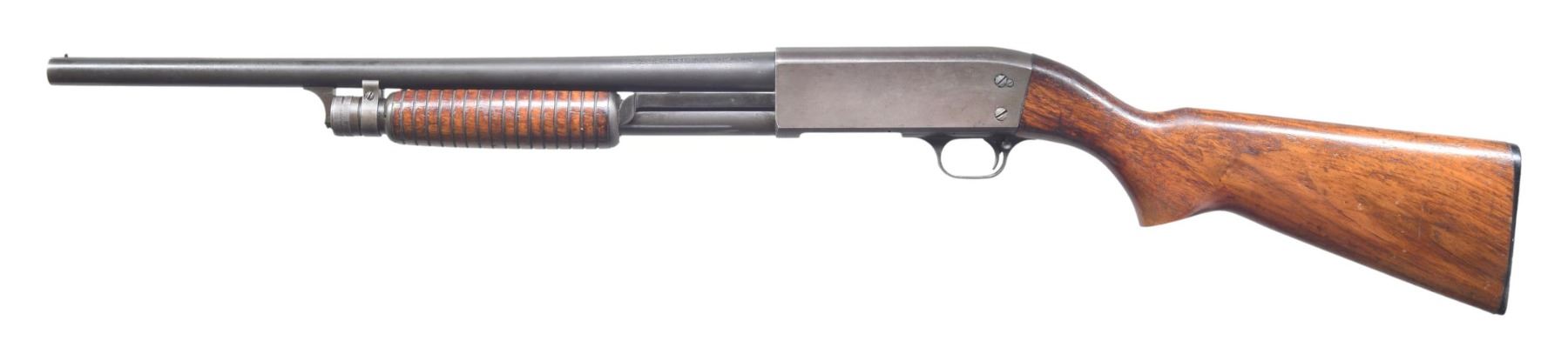 SHOTGUN. Cal. 12 GA, 2 3/4". S# 371215060. Bbl. plain, shortened to 20", with Cyl. bore and brass bead. Original choke marking was "MOD.". Added parkerized type metal finish. Small rnd. grooved forearm and pistol grip walnut stock, with original buttplate. Grip area of stock has 4 intentionally cut "kill" notches. CONDITION: 60% dull worn parkerized type metal finish. Wood has worn original finish, showing spots of darkening, with numerous scratches and marks. Right side of stock has 2 small holes, with plastic wood filler near the buttplate. Head of stock has small cracks extending from both sides of the action. Functioning action. Bore is generally bright. (25-2768/DS). MODERN. $200-300.