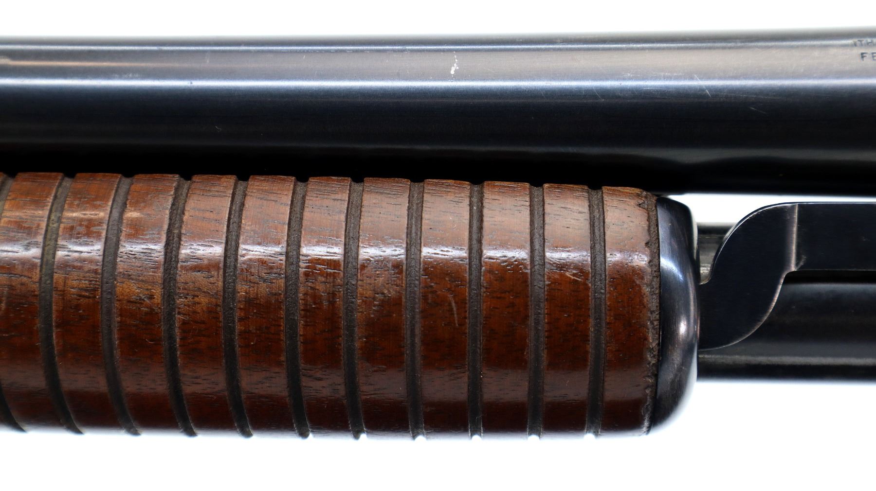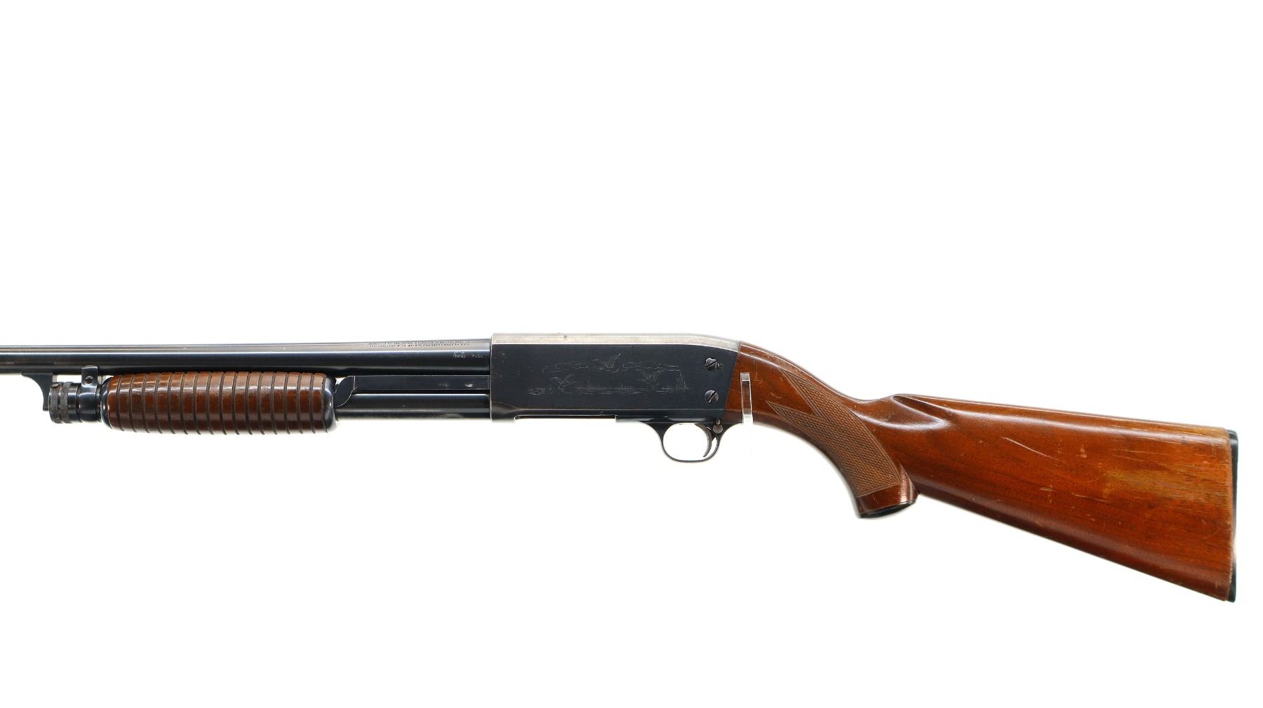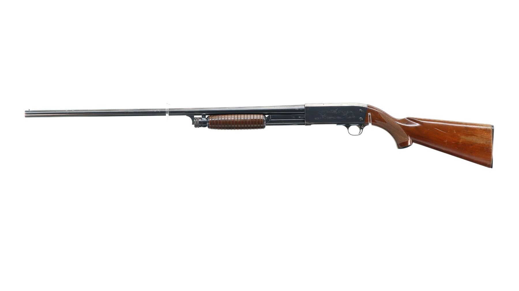 Main Description: Brass bead, blued finish, round barrel, engraved receiver. Two piece wood stocks, grooved forearm, checkered pistol grip cracked behind receiver, grooved black polymer butt plate, grip cap.