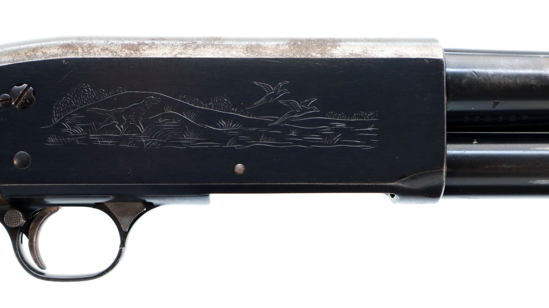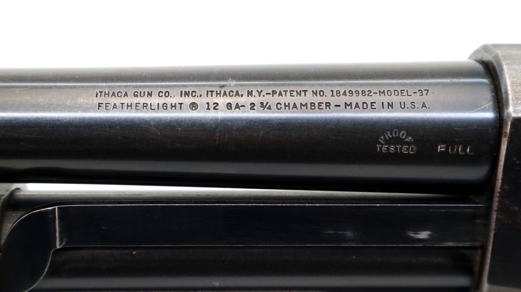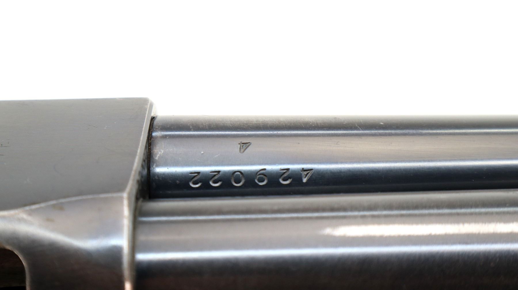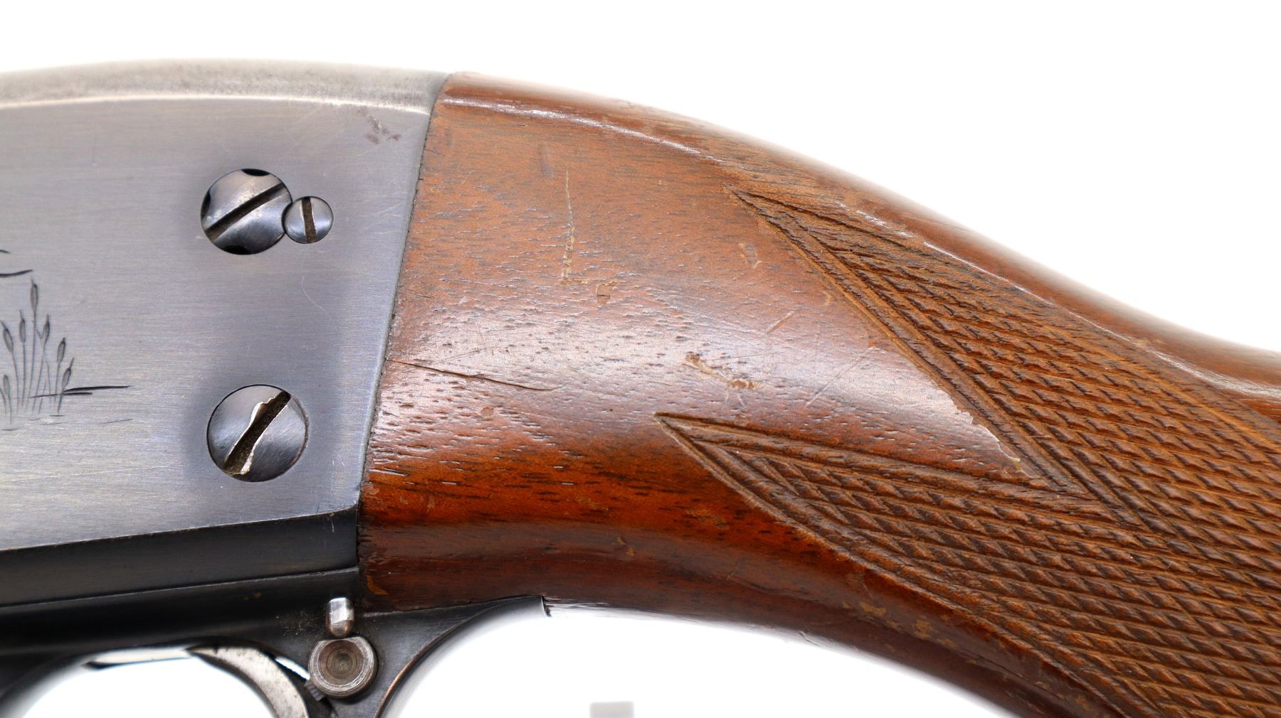 Main Description: Brass bead, blued finish, round barrel, engraved receiver. Two piece wood stocks, grooved forearm, checkered pistol grip cracked behind receiver, grooved black polymer butt plate, grip cap.