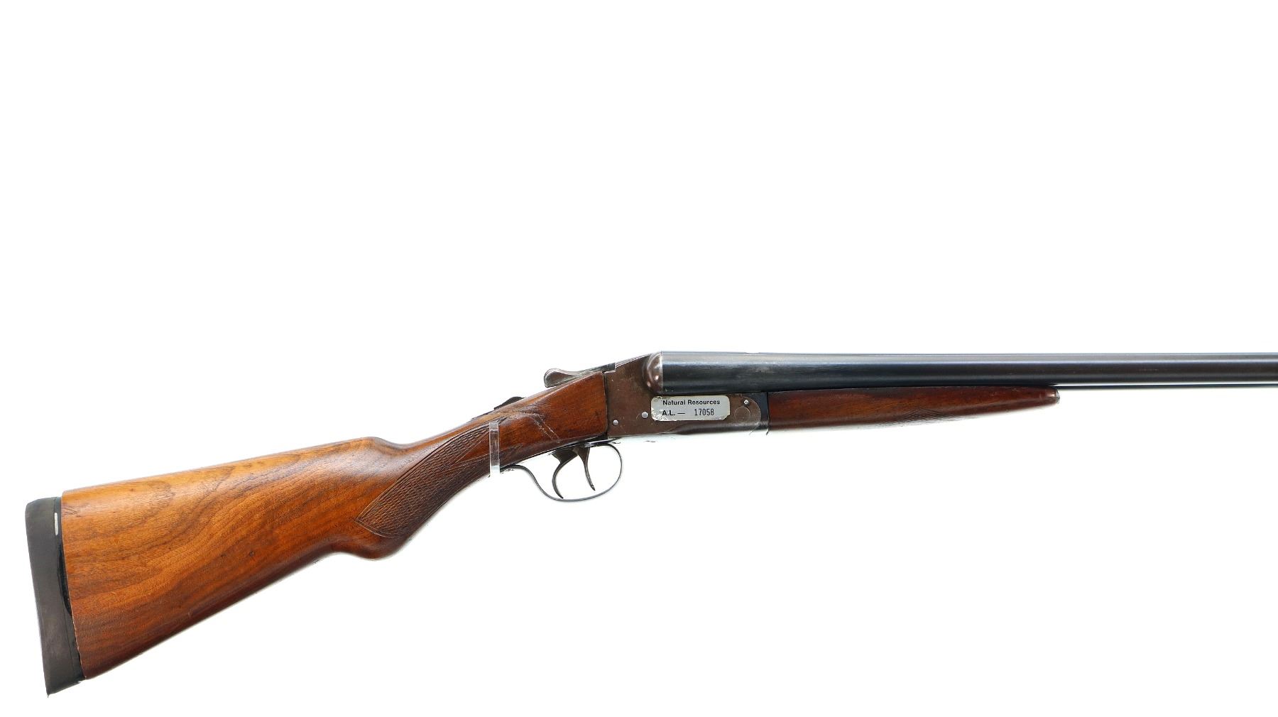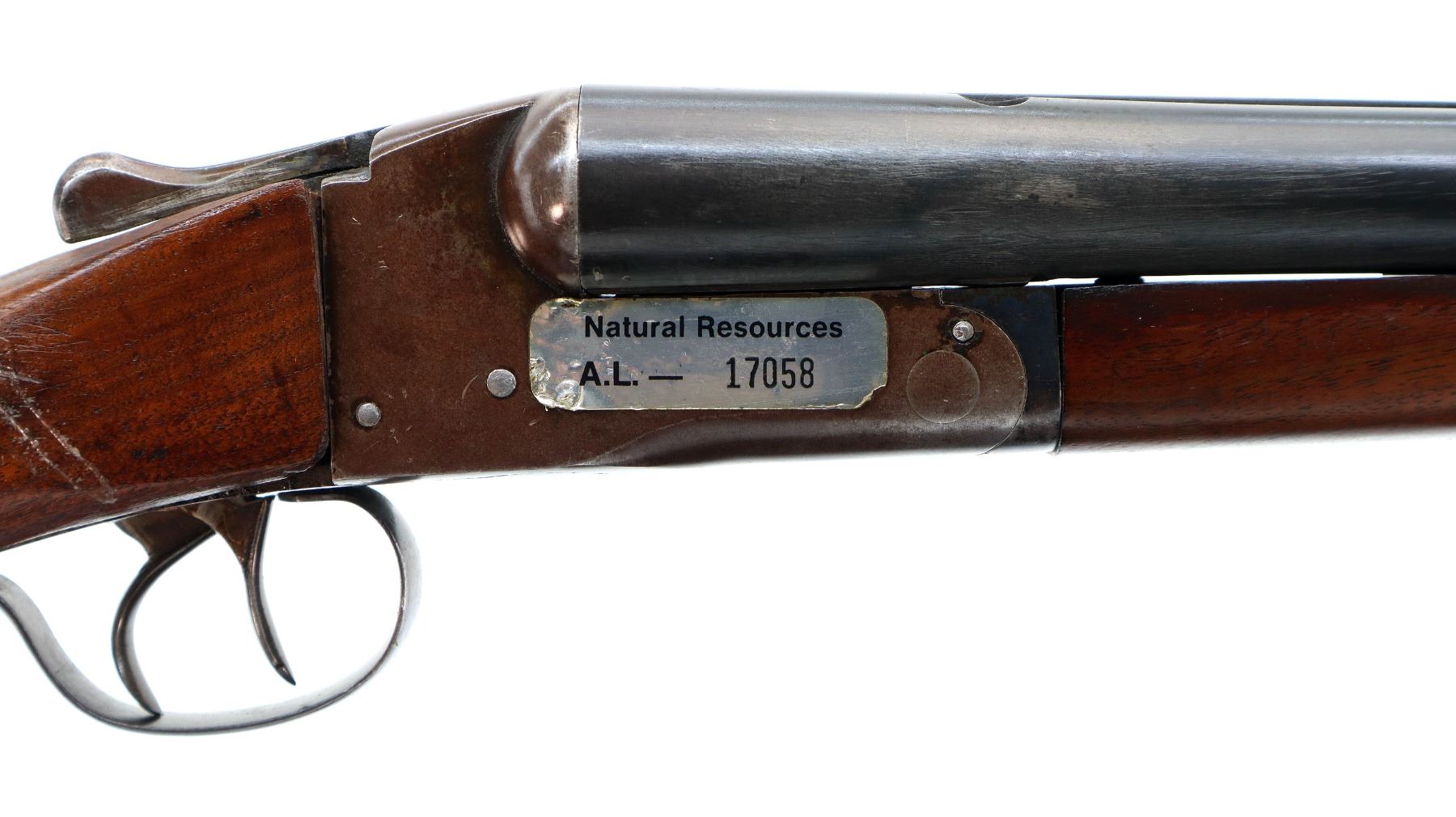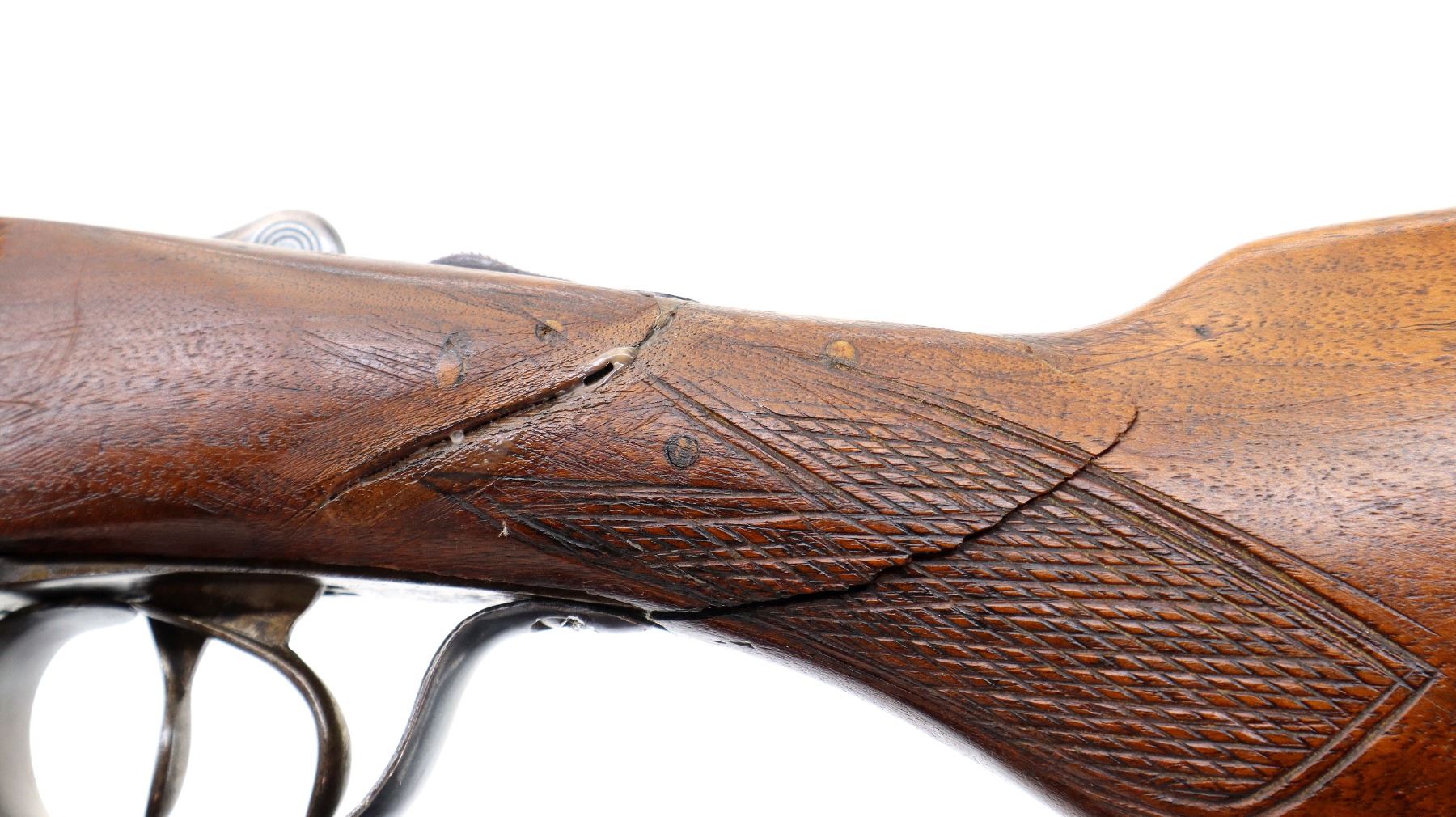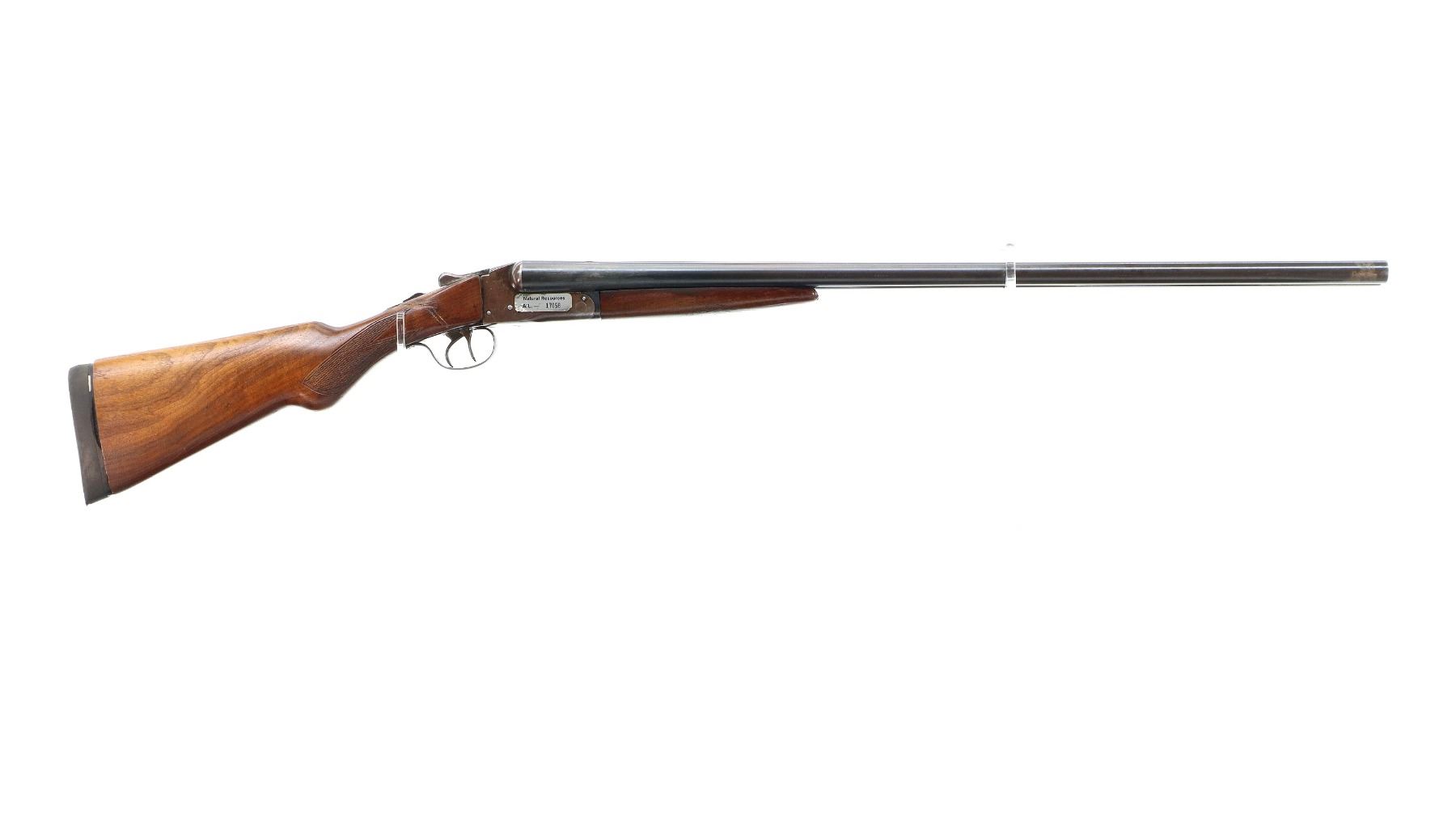 Main Description: Missing front bead, hole present, blued barrels with raised rib, holes drilled into chambers not fireable, automatic safety, action does not function, missing parts. Has extractor, double triggers. Two piece wood stocks, checkered forearm and pistol grip, chipped, cracked and broken behind receiver. Black rubber recoil pad
