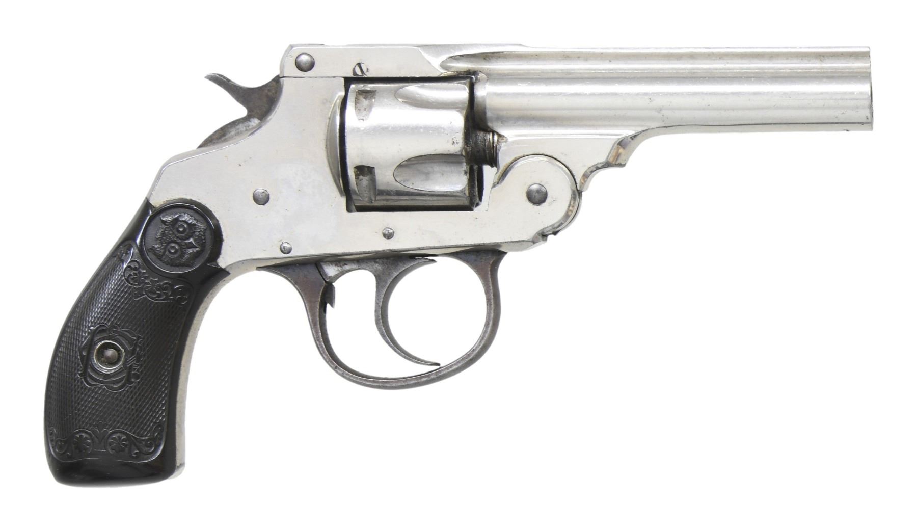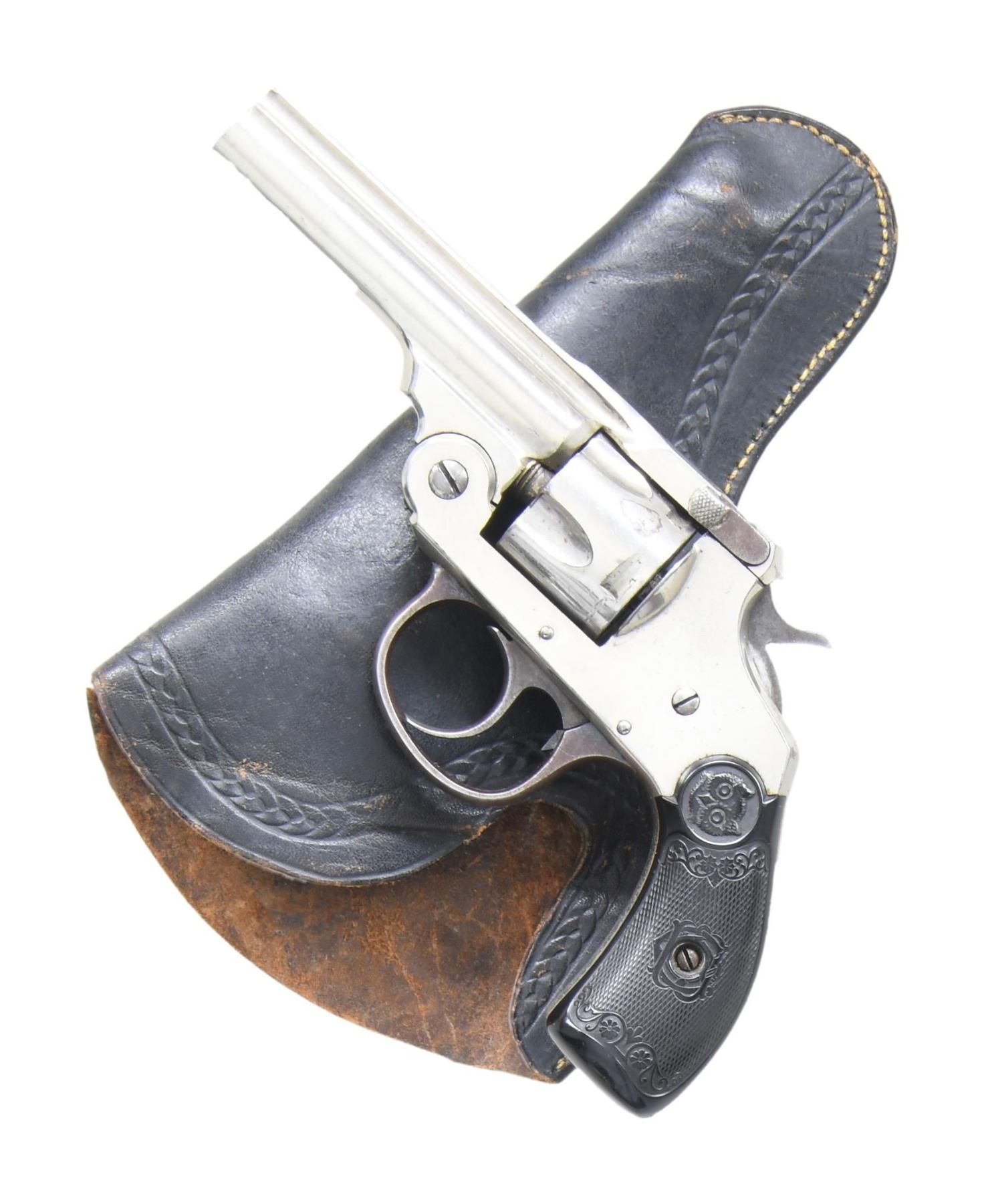 Cal. 32 S# 39045. Bbl. 3 1/2" that appears shortened. Both sights not present. Nickel finish with case colored hammer & trigger. Checkered black hard rubber grips with Owl monograms. UNATTACHED ACCESSORIES: vintage right handed black leather holster. CONDITION: grips show some handling marks. Trigger & hammer are mostly gray with some traces of case colors & light oxidation. Balance of metal retains 85% nickel with scattered oxidation, flaking & handling marks. Cyl. is loose when hammer is cocked & may need attention to fix timing issue. Dark oxidized bore. (25-2408/MJC). CURIO. $100-200.