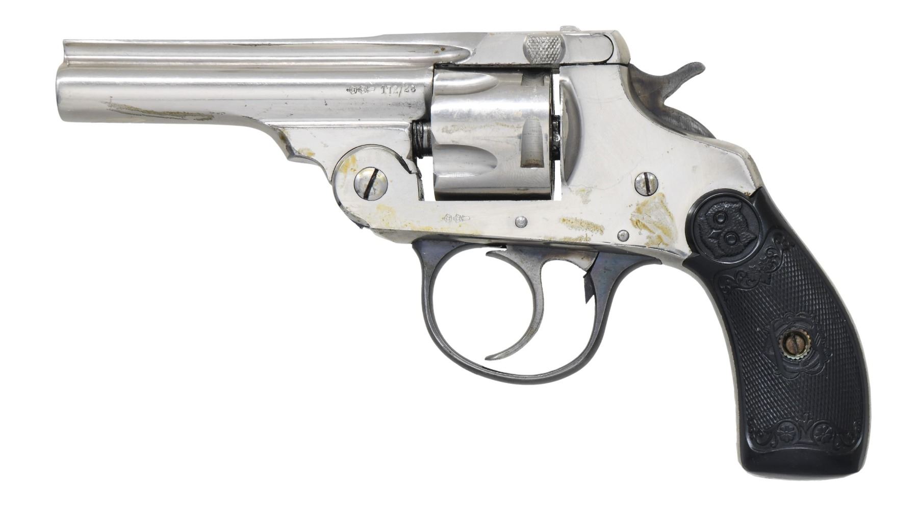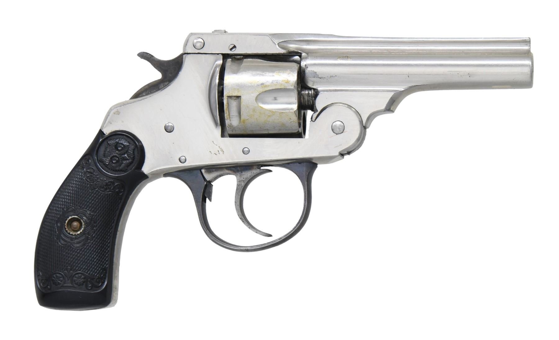 HAMMER DA REVOLVER WITH GERMAN PROOFS. Cal. 32 S&W. S# A25868 (under grips). Mfg. 1896 as 2nd Variation. Bbl. 3". Rib has maker's address & patent dates; front sight missing. 5 Shot fluted cyl. Nickel finish on frame w/ blued triggerguard. Left side of revolver has German "Crown U" proof & "172/28" gauge proof. Two piece hard rubber grips. CONDITION: very good nickel finish wear along grip straps. Good blue on sides with wear along bore. Good grips. Good bore with strong rifling. (01-26258/MD). ANTIQUE. $200-300.