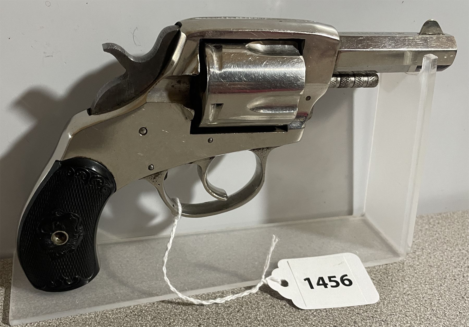 CONDITION: VG OVERALL FOR AGE. MINOR PITTING ON BARREL. SPECS: 5 SHOT REVOLVER. 64 MM OCTAGON BARREL. EMBOSSED GRIP SHOWING HUNTING DOG IMAGE. EXTRAS: NONE. S/N: 9519.