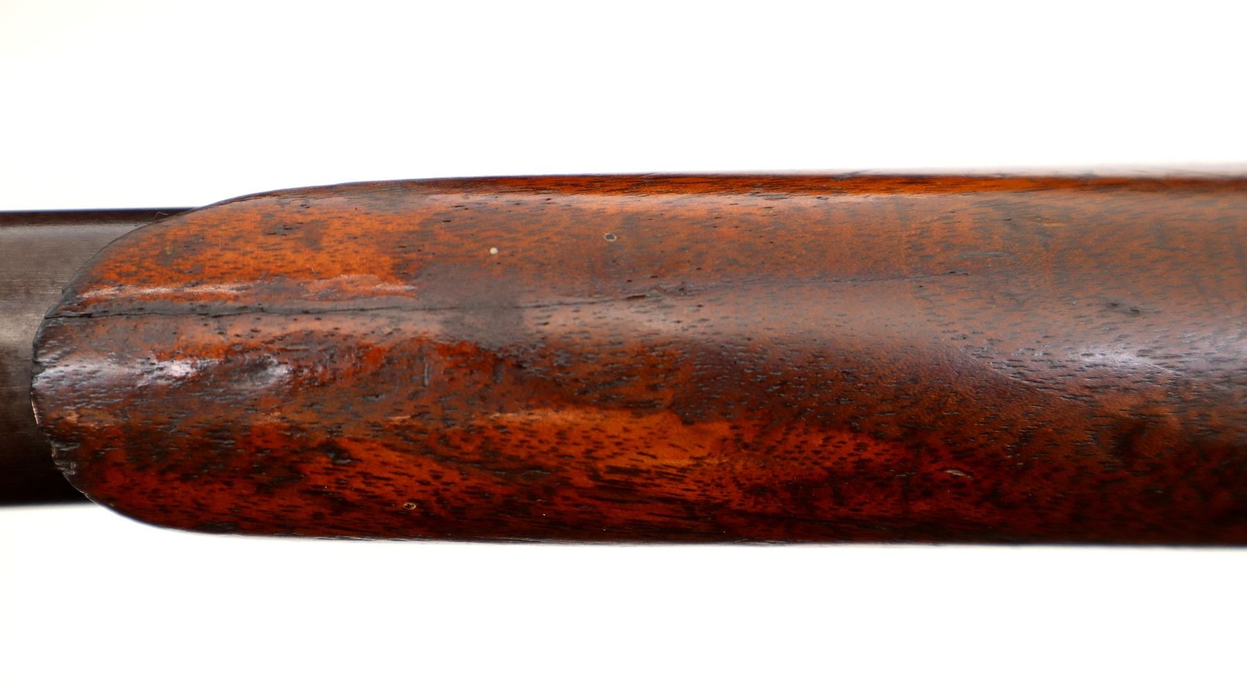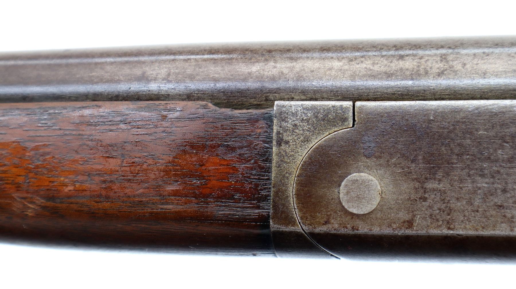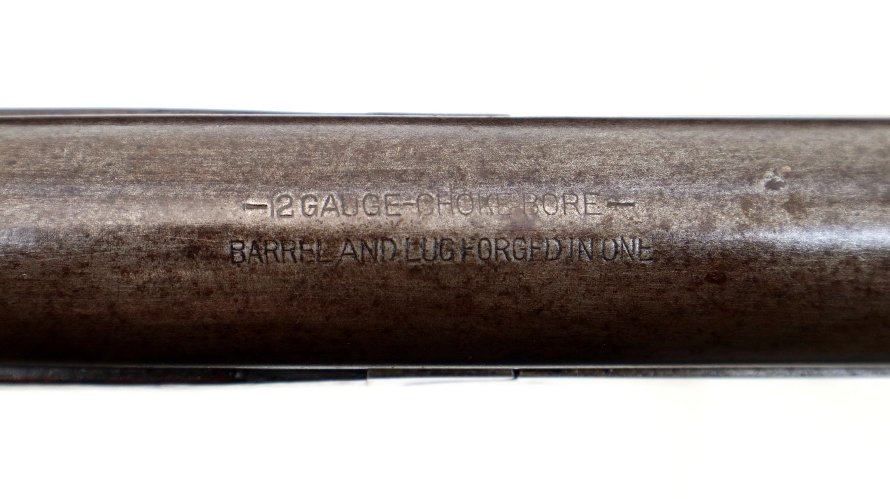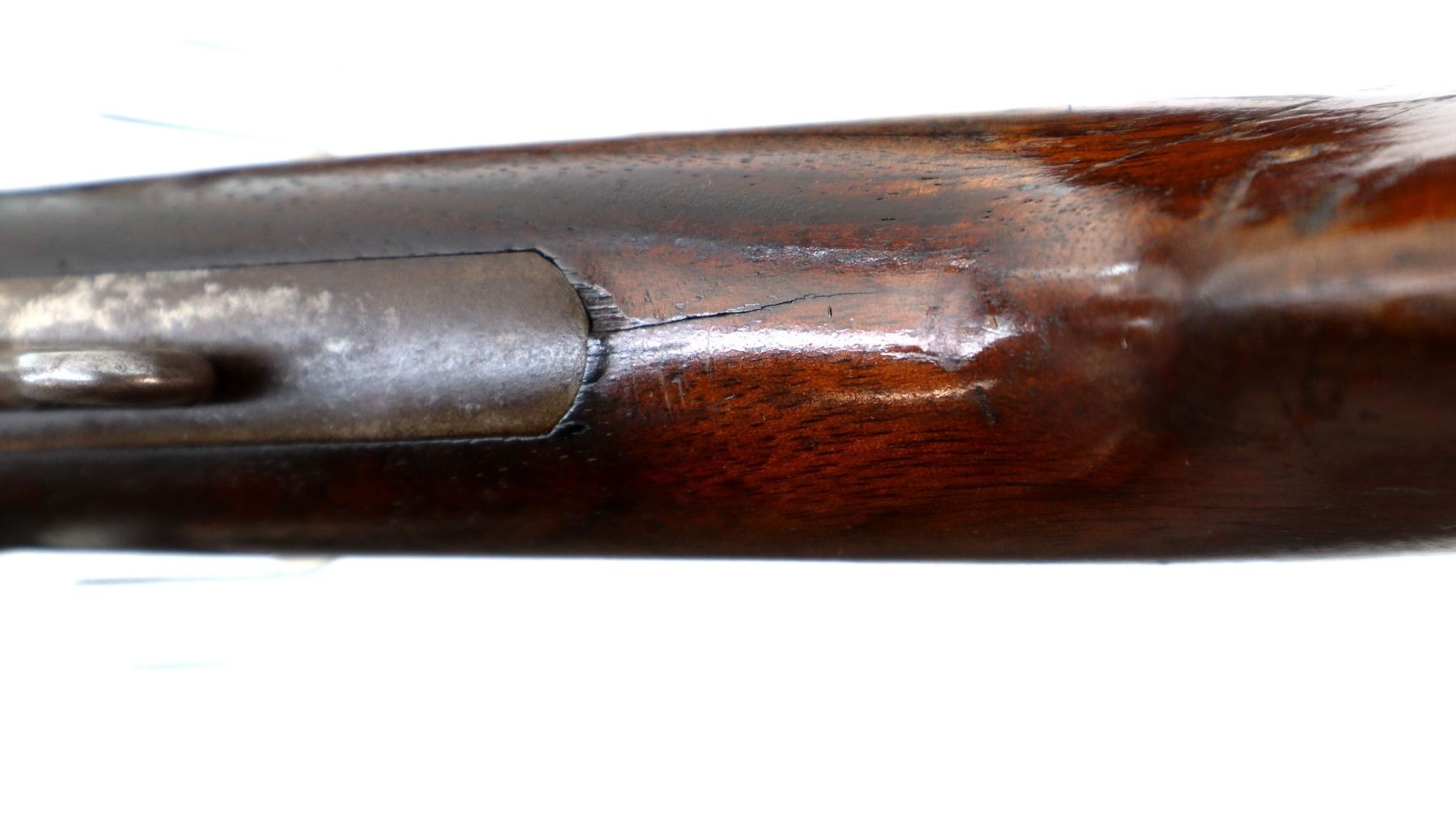Main Description: Brass bead, round barrel, checkered spur hammer, extractor does not function. Two piece wood stocks, forearm is chipped and cracked, pistol grip chipped and cracked behind receiver, grooved black polymer butt plate chipped and cracked fixed with various screws, hole in toe of stock.