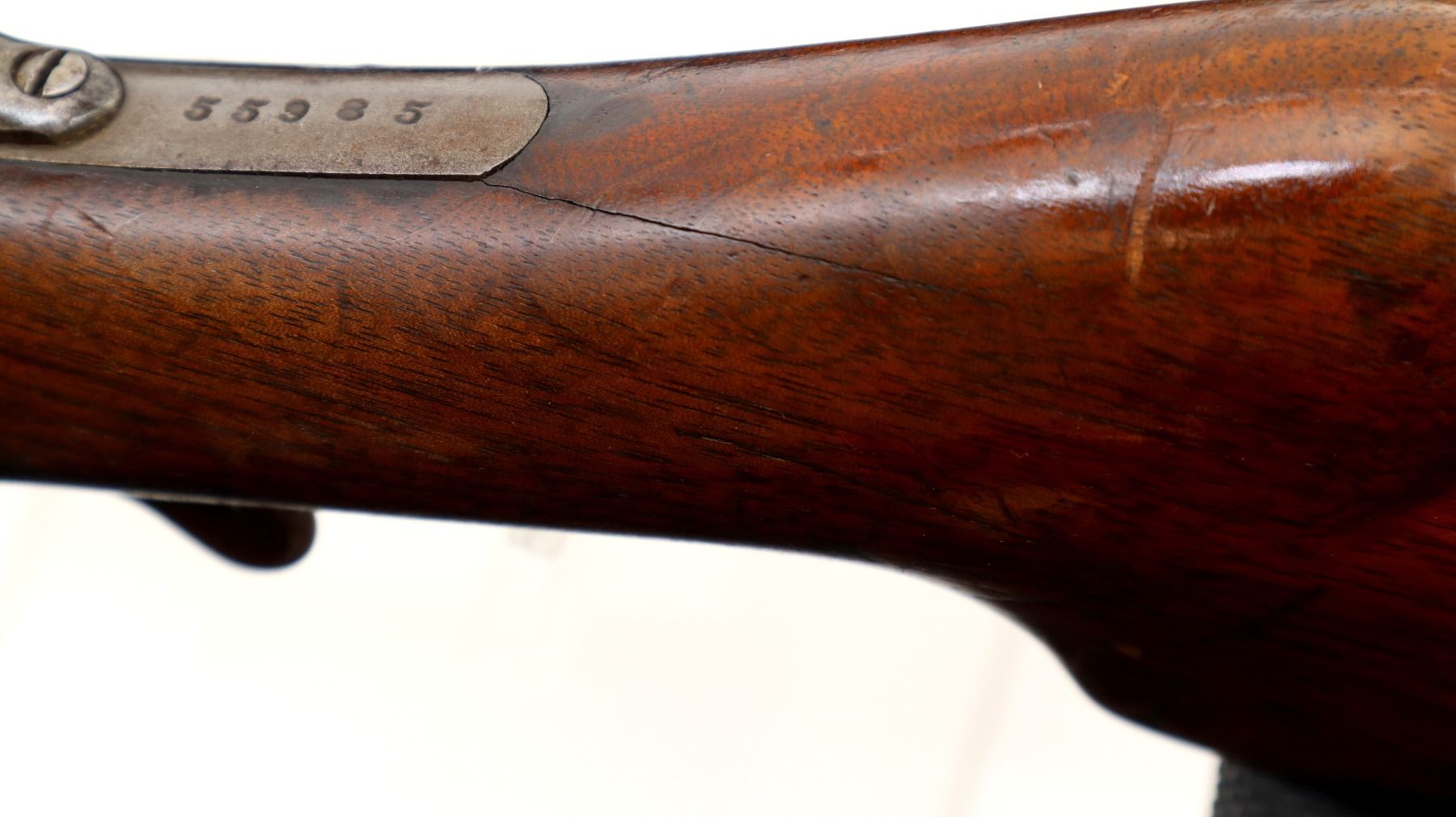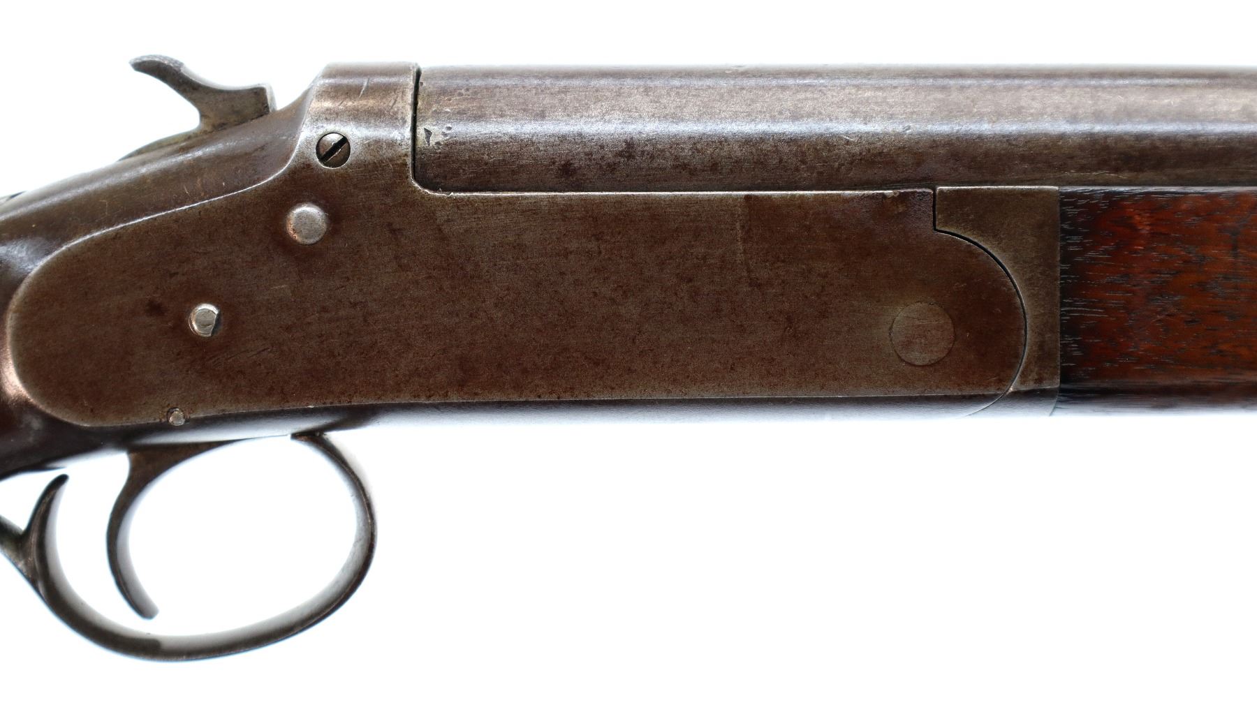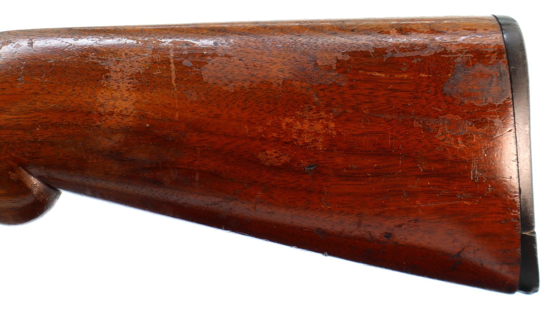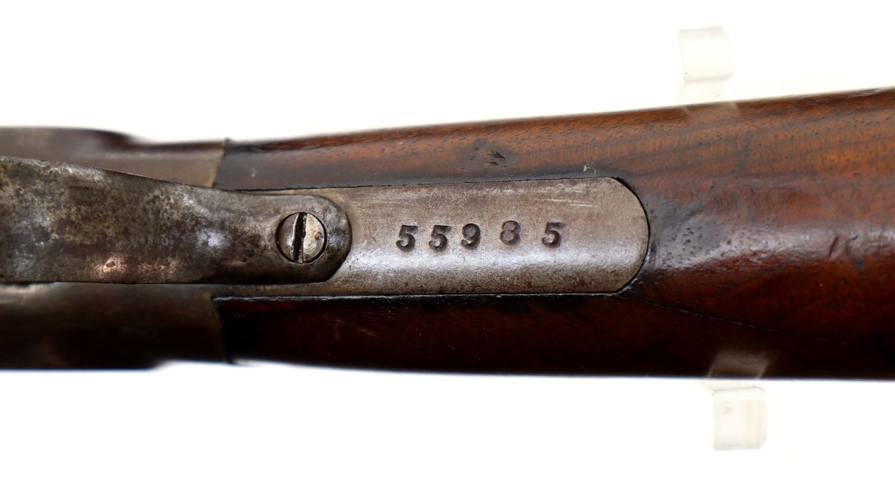 Main Description: Brass bead, round barrel, checkered spur hammer, extractor does not function. Two piece wood stocks, forearm is chipped and cracked, pistol grip chipped and cracked behind receiver, grooved black polymer butt plate chipped and cracked fixed with various screws, hole in toe of stock.