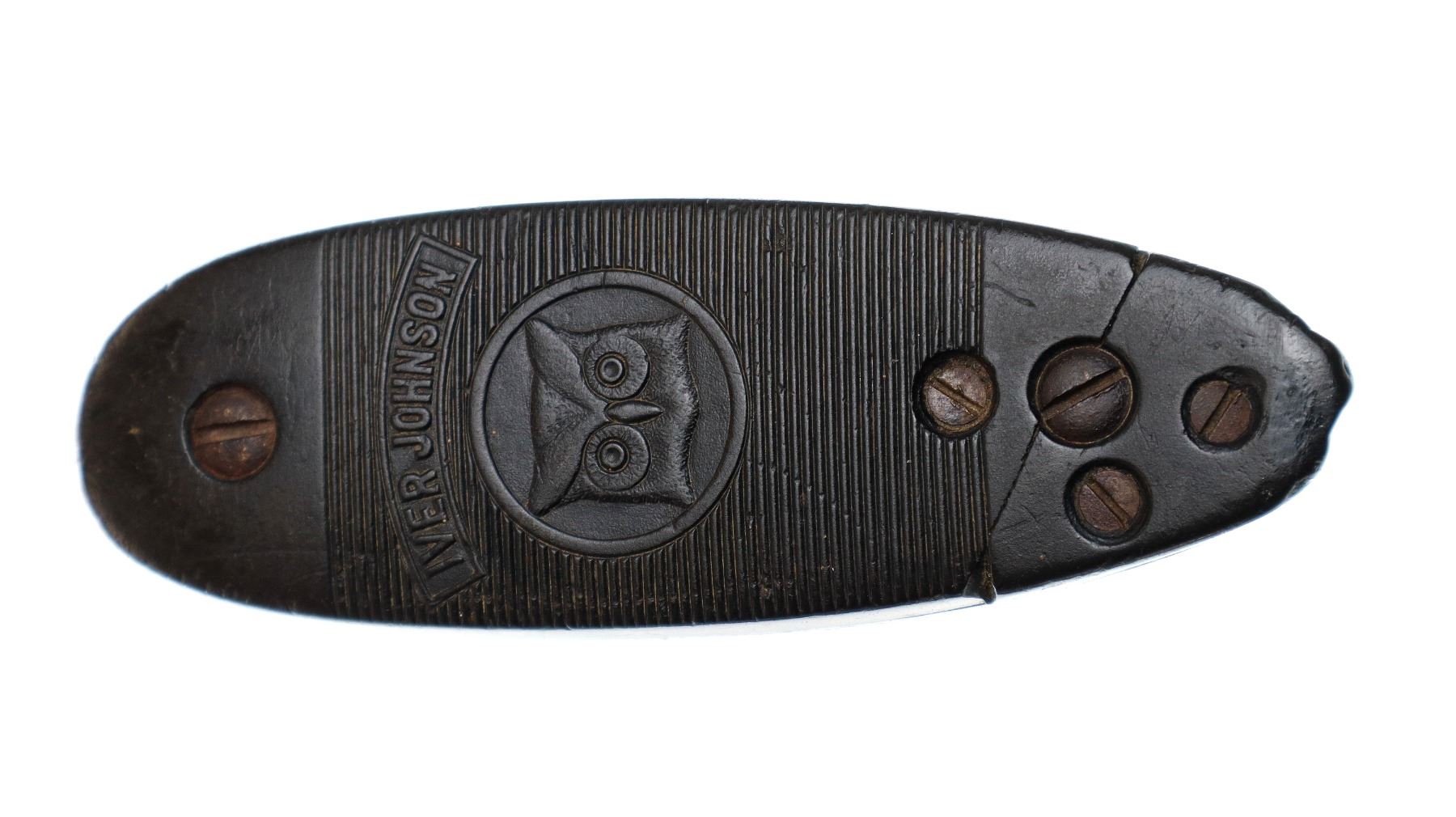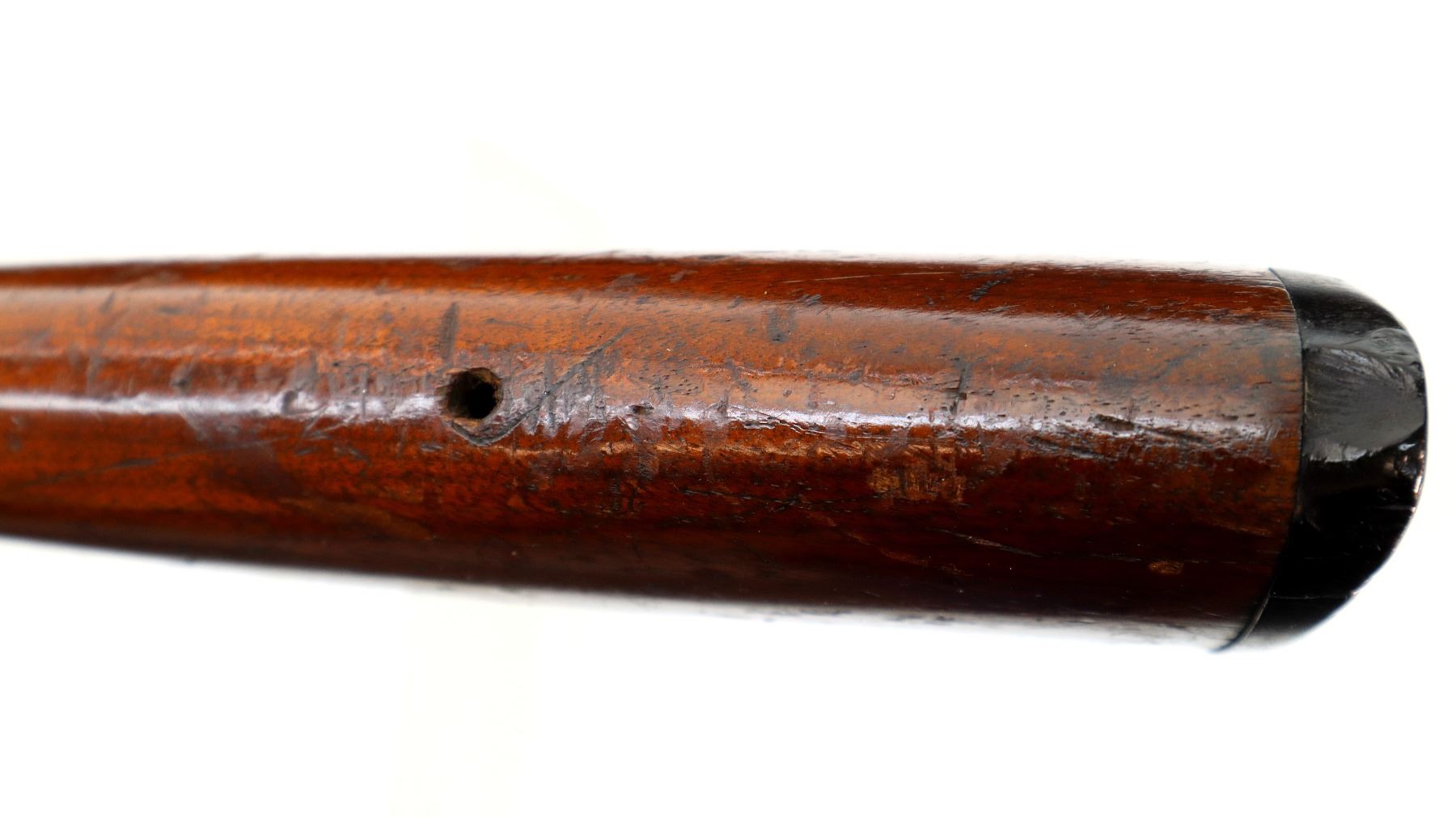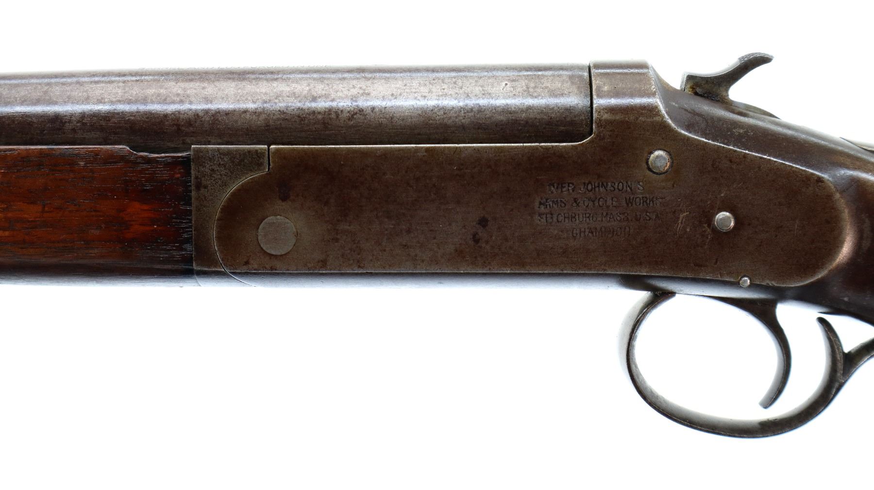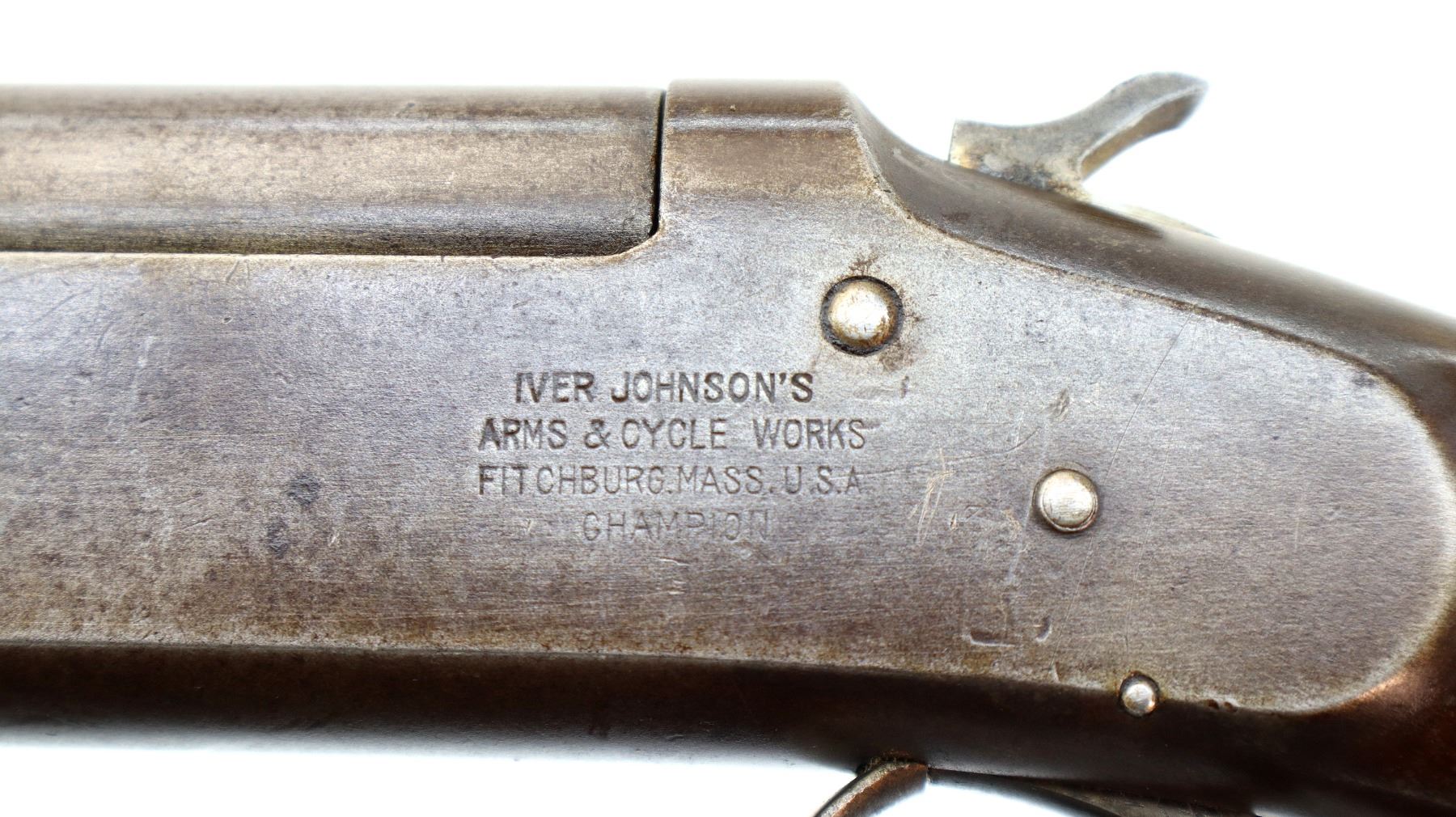 Main Description: Brass bead, round barrel, checkered spur hammer, extractor does not function. Two piece wood stocks, forearm is chipped and cracked, pistol grip chipped and cracked behind receiver, grooved black polymer butt plate chipped and cracked fixed with various screws, hole in toe of stock.