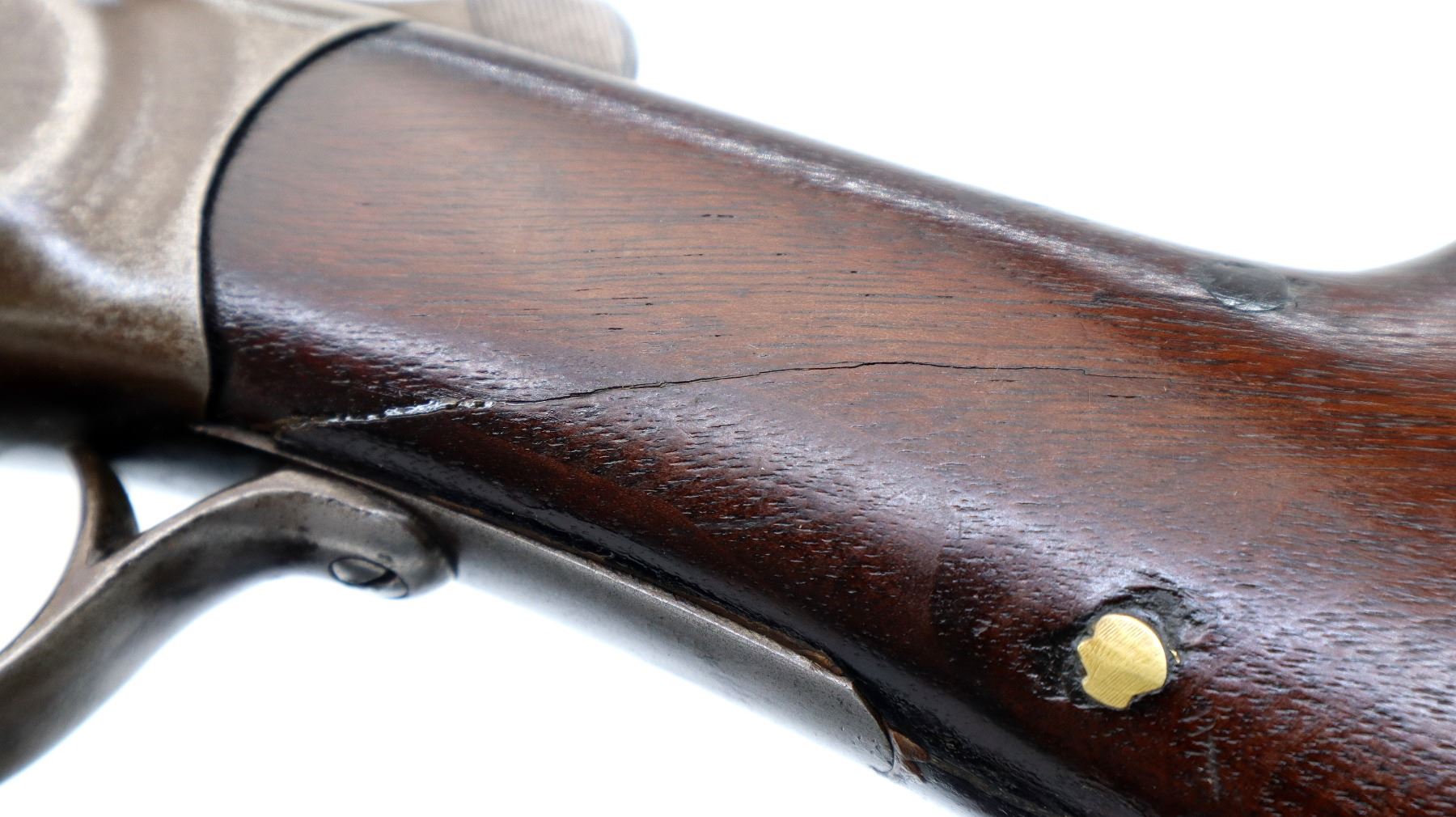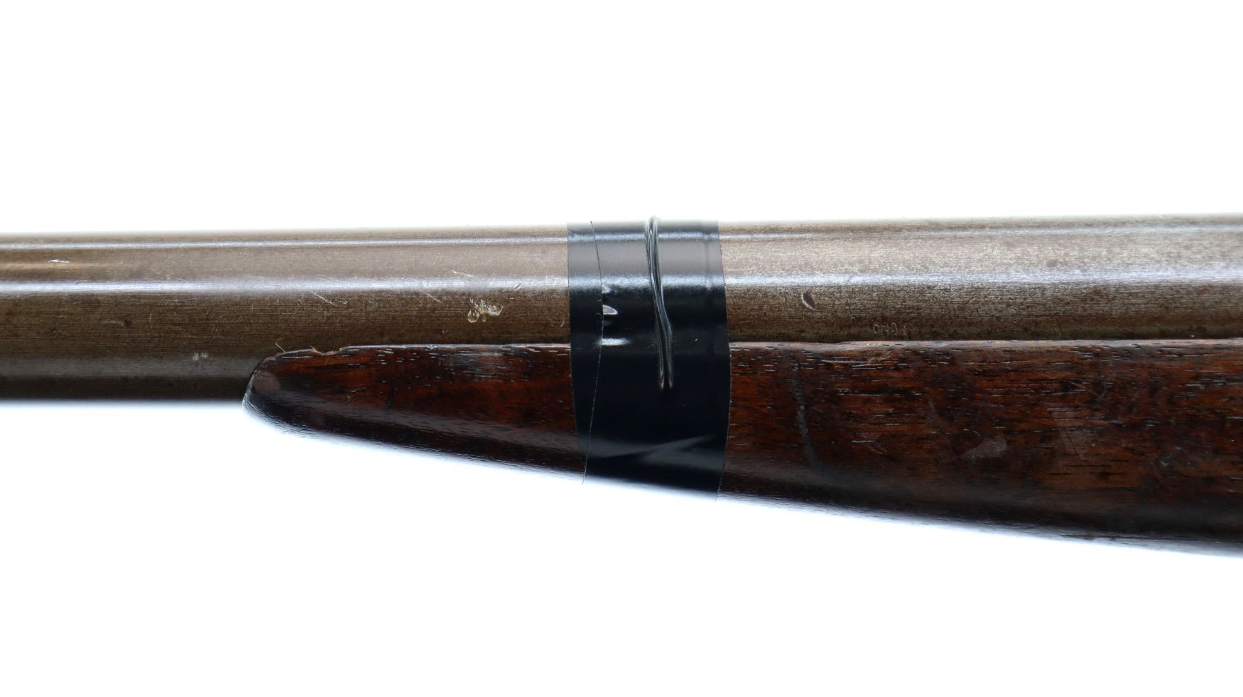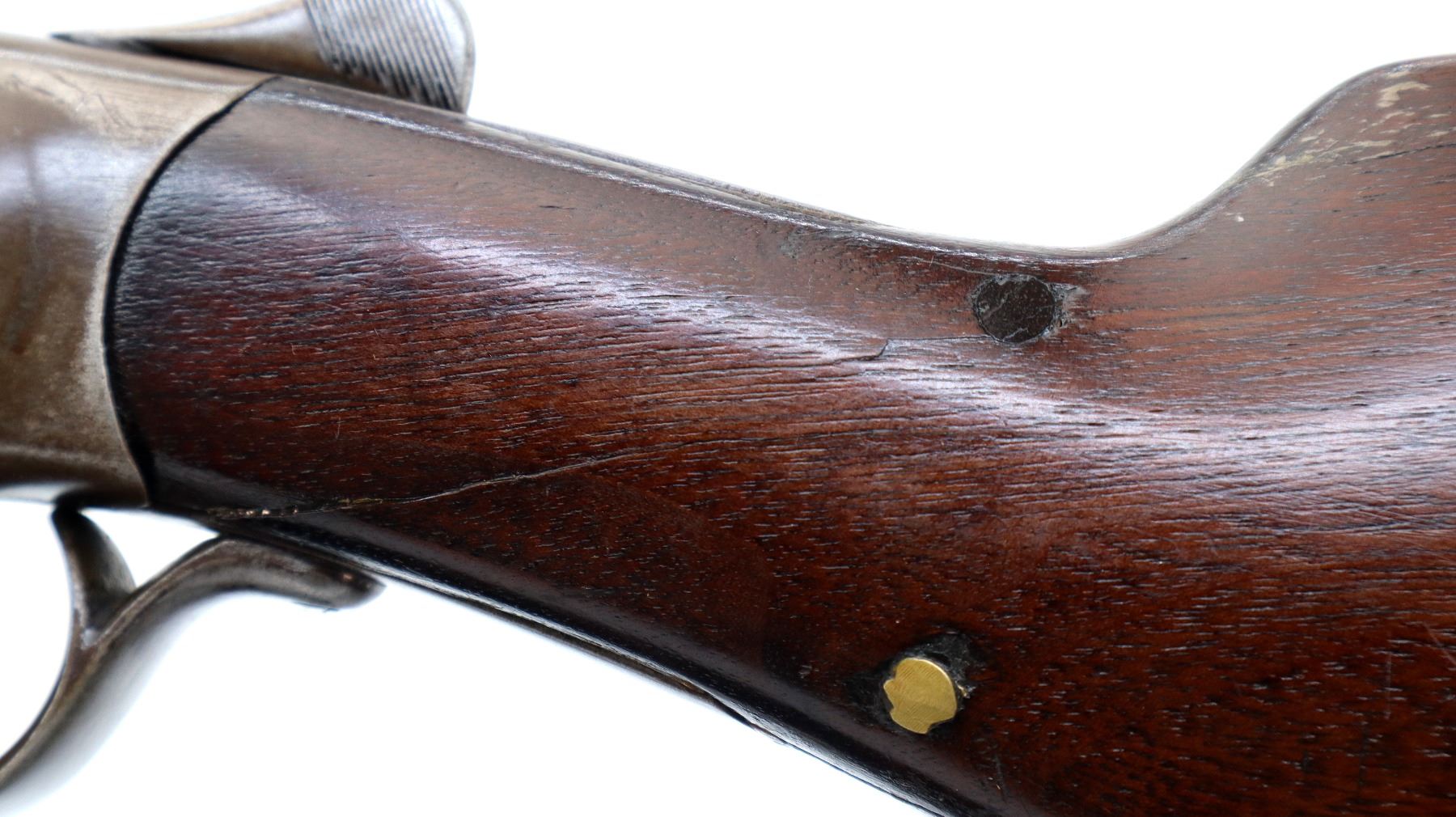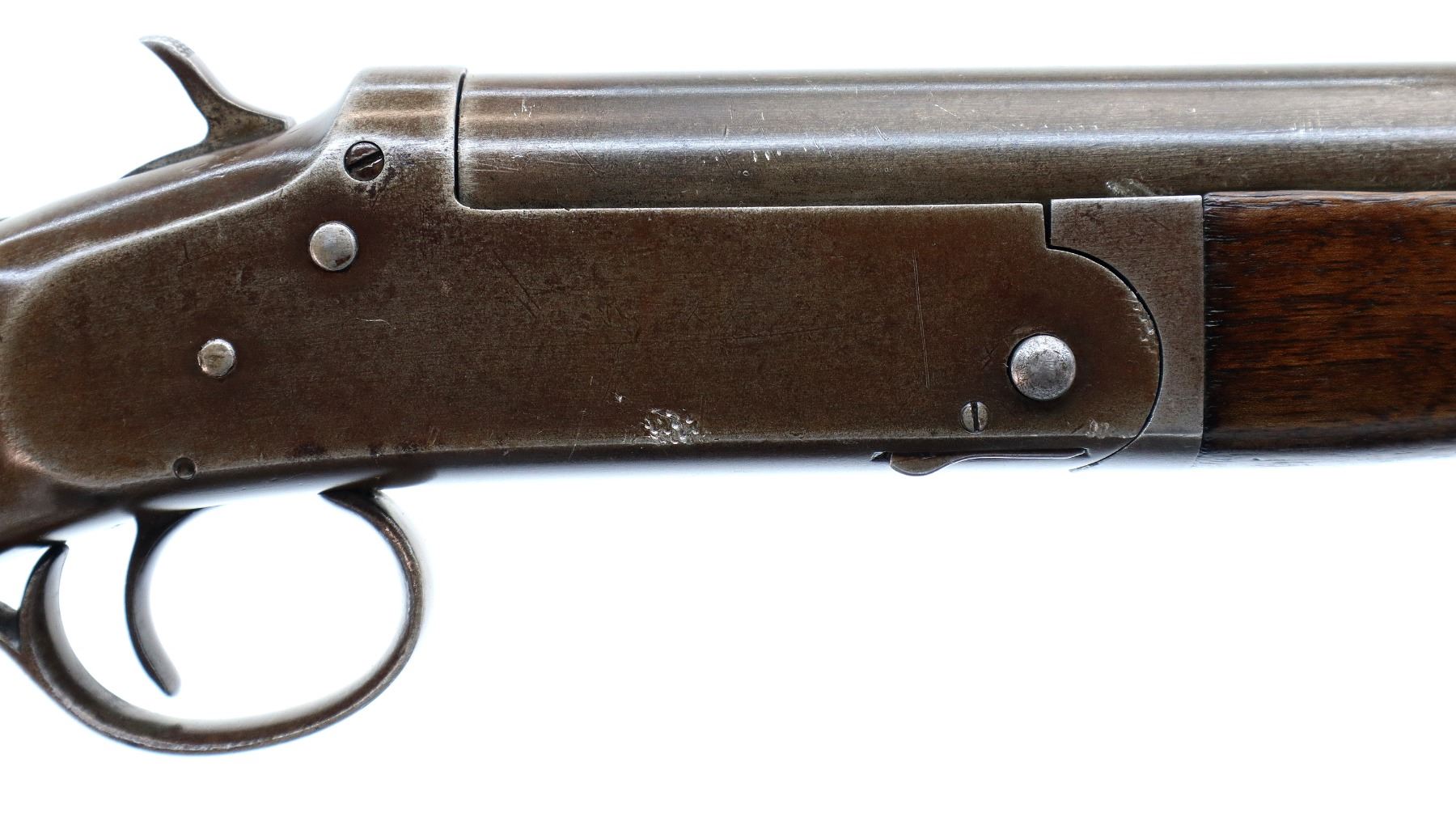 Main Description: Brass bead, round barrel which is loose on face, checkered spur hammer, missing extractor assembly, opening lever spring is broken requires parts and repair. Two piece wood stocks, forearm missing the mounting screw attached with tape, pistol grip, chipped cracked and broken behind receiver, red rubber recoil pad