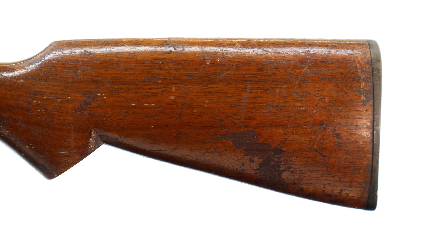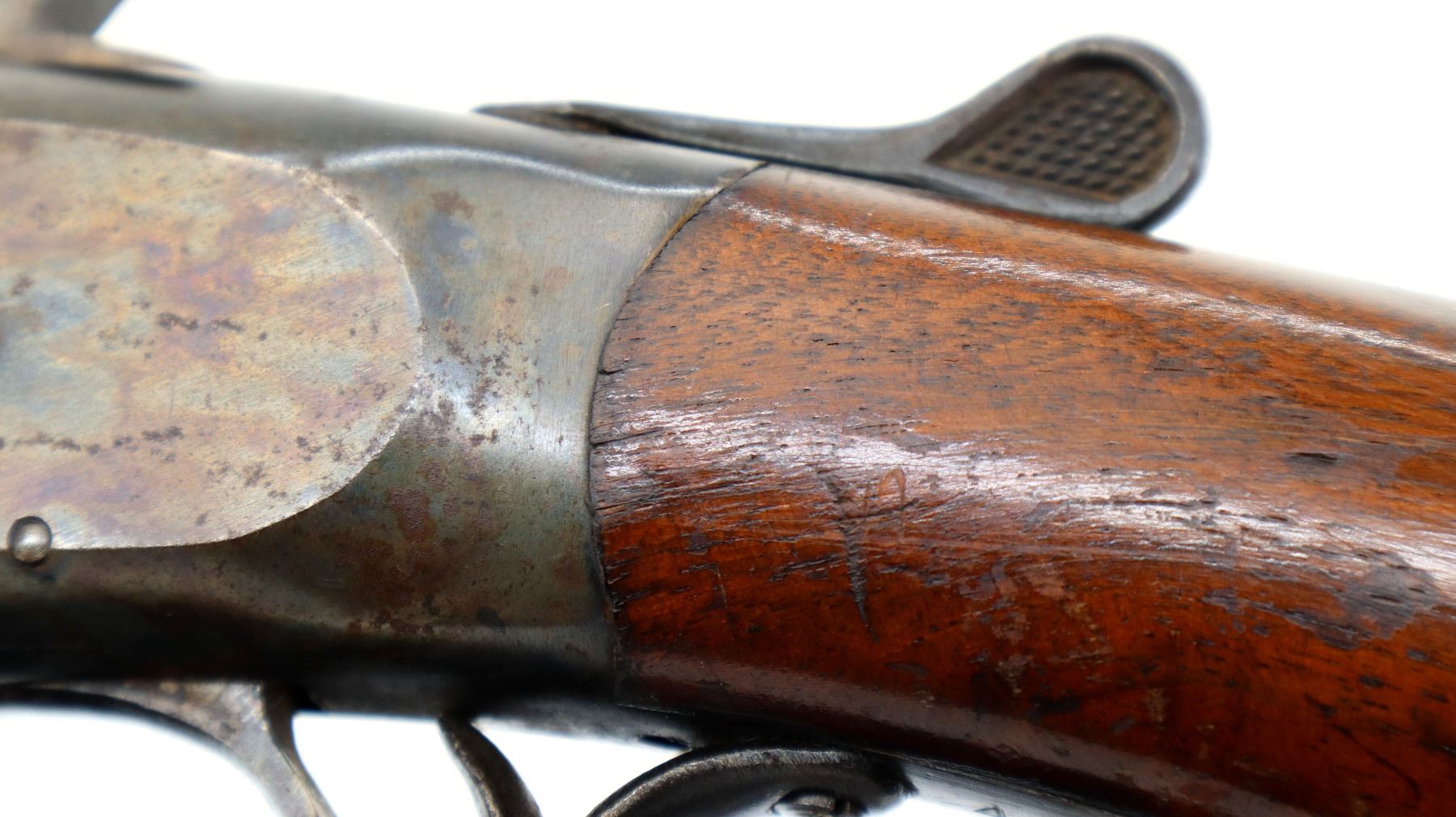Main Description: Brass bead, blued round barrel, colour case hardened receiver, checkered spur hammer, ejector. Two piece wood stocks, pistol grip, grooved brown polymer butt plate