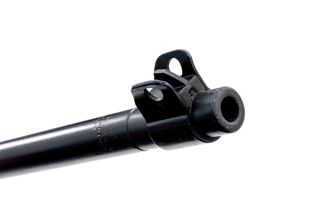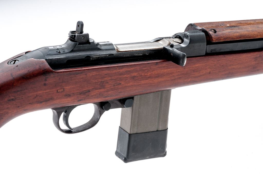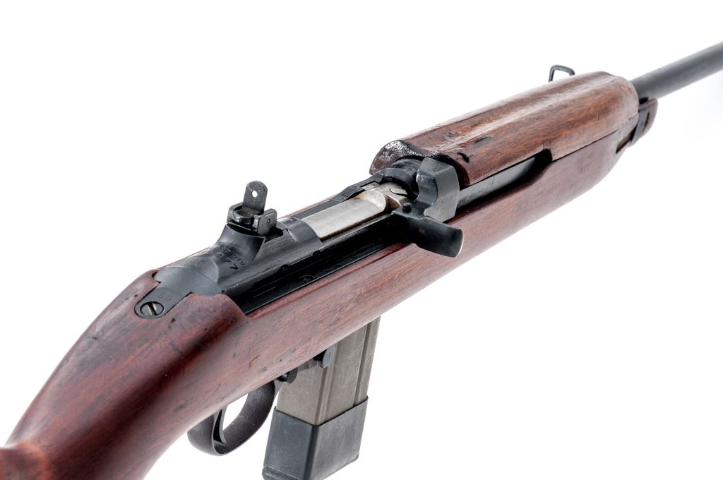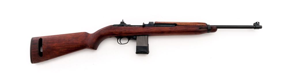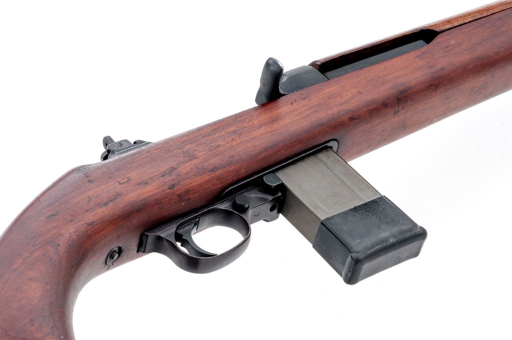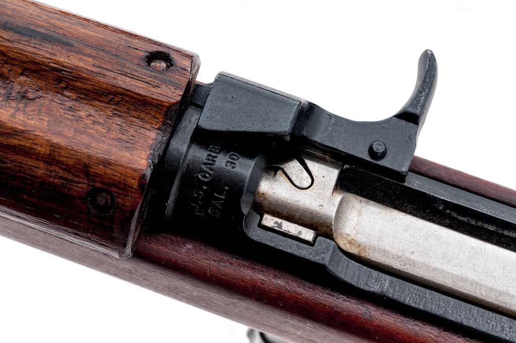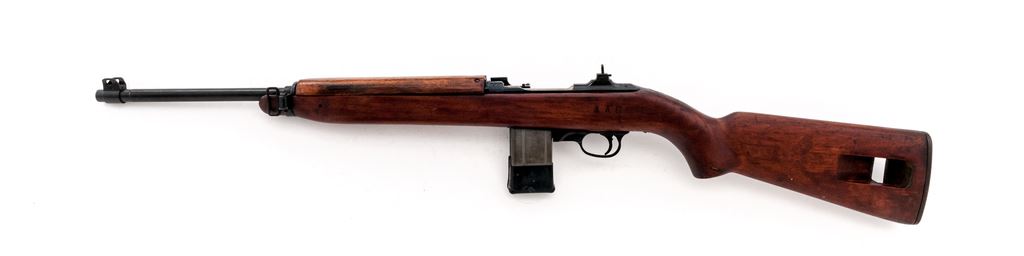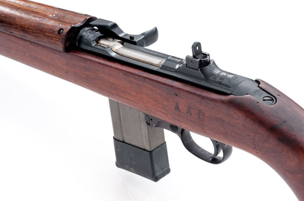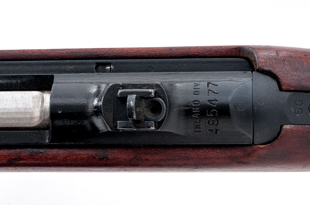 Inland M1 Semi-Automatic Carbine, #485477, .30 Carbine cal., 18'' barrel, black-painted/blued finish, flat bolt, walnut stock, blade front sight with protectors and two-position flip rear sight, with one 15-rd. magazine and rubber dustcover. Marked on receiver ring ''U.S.CARBINE CAL. 30 M1'', and on receiver tang ''INLAND DIV.''. Barrel behind the front sight is marked ''INLAND MFG.DIV. GENERAL MOTORS 6-43''. Left side of buttstock is stamped ''A.A.G''. There is a ''(circle)/P'' firing proof on the underside of the stock wrist. Condition overall is good to very good with metal surfaces retaining approx. 95% of its applied black-painted/reblued finish. Stock is very good with an even finish and light handling marks. Handguard has a gloss varnish refinish now with dark areas. Action is smooth, bore is poor with darkening and fair rifling. No visible import marks. Est.: $700-$1,000. (C&R)(High-cap mag not available to Calif. residents.)