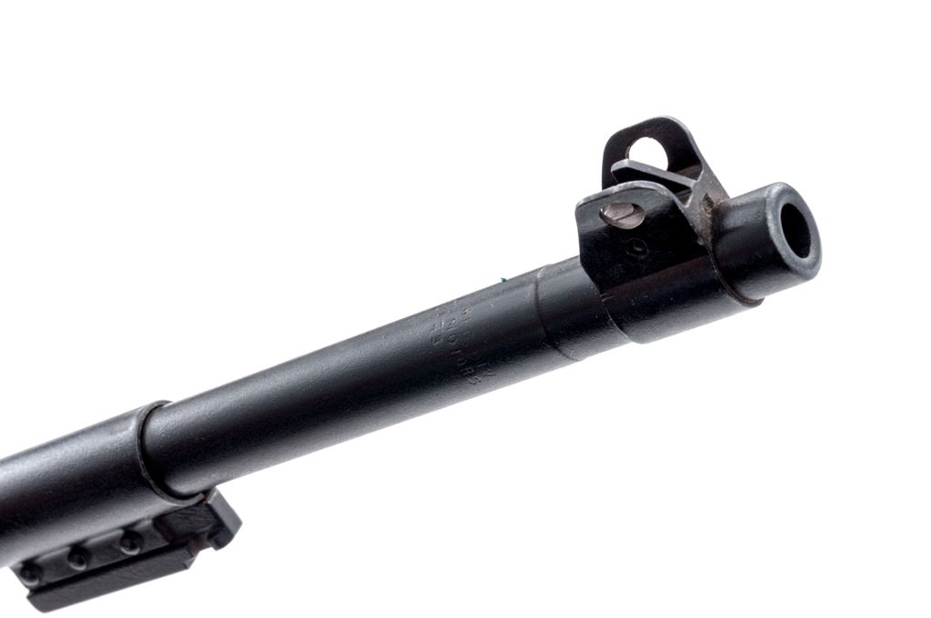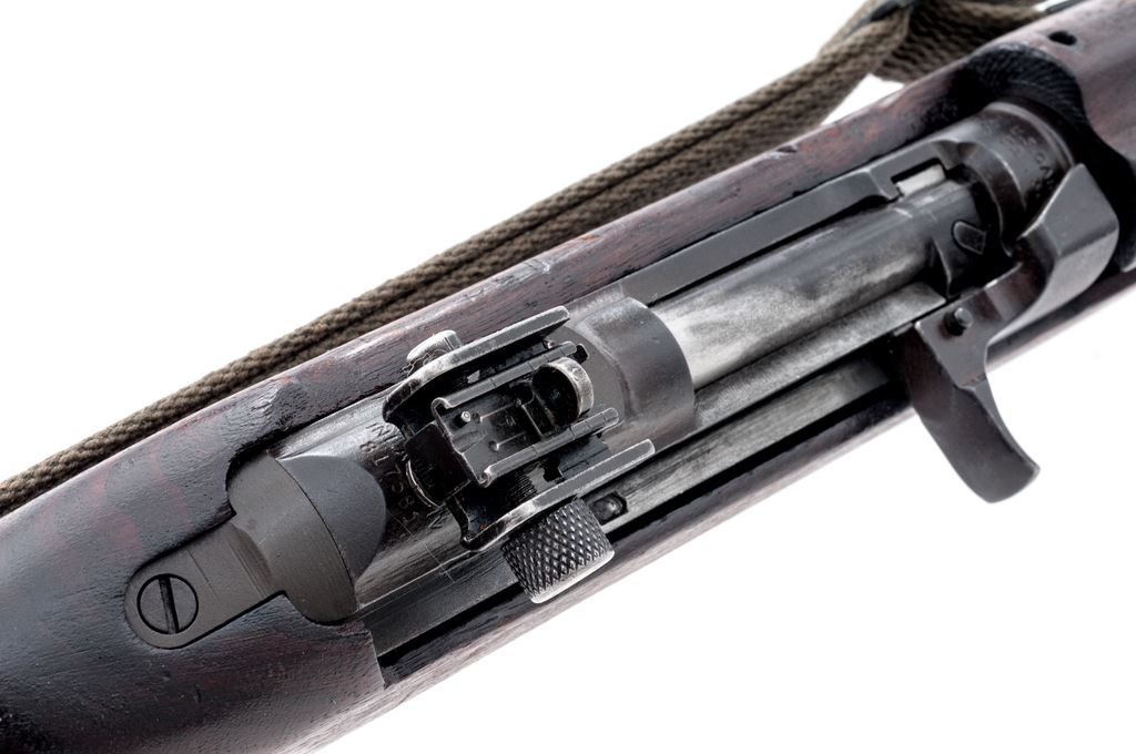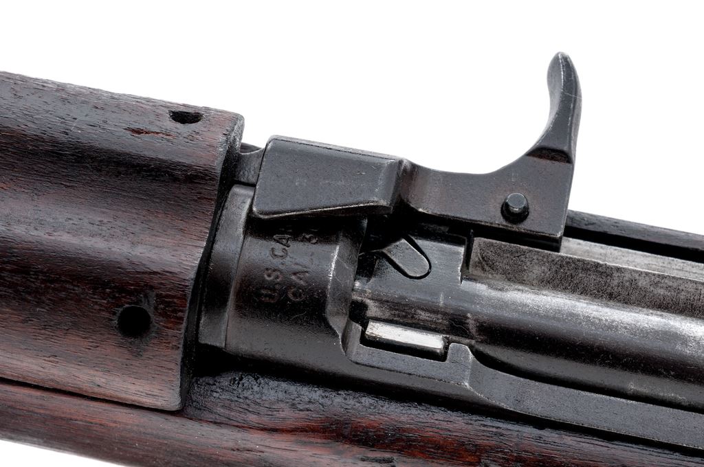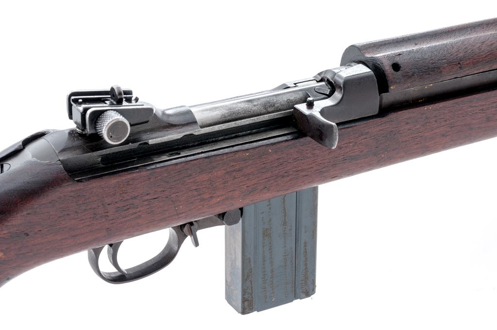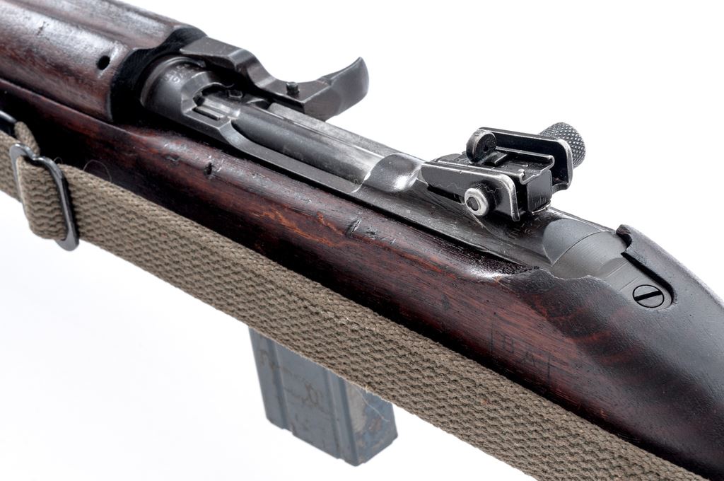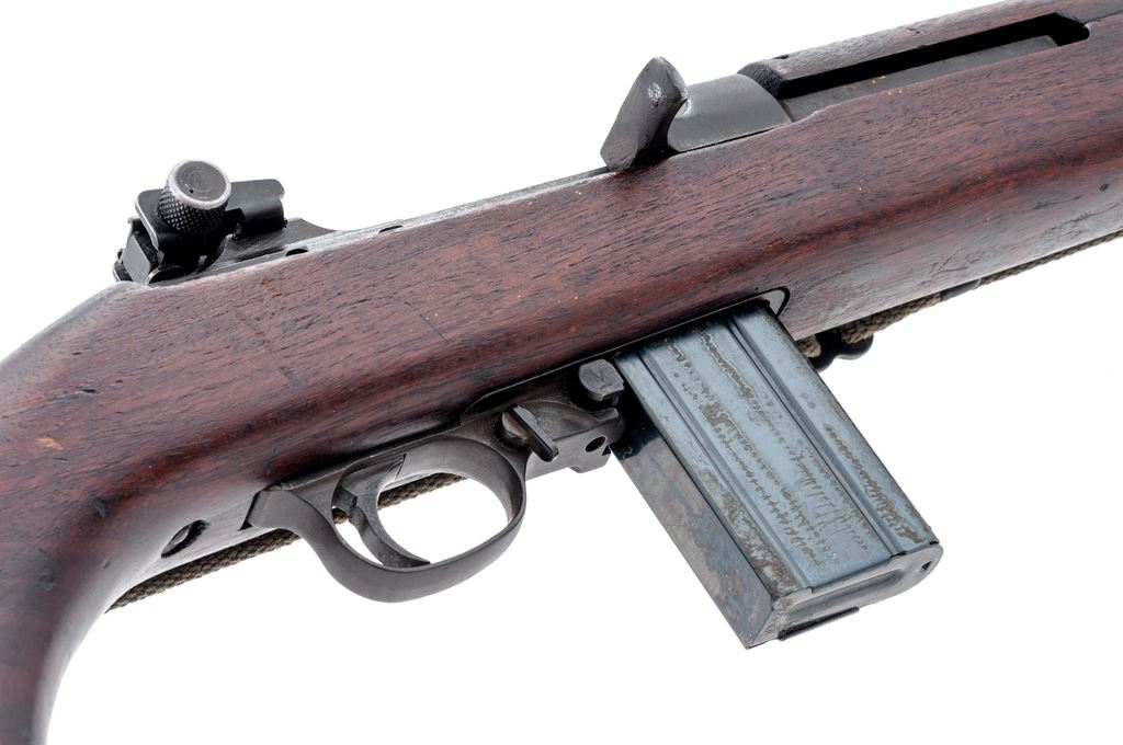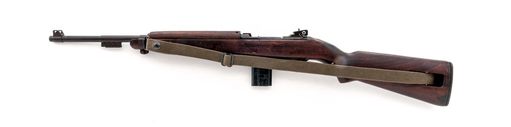 Inland M1 Semi-Automatic Carbine, #817581, .30 Carbine cal., 18'' barrel, parkerized finish, round bolt, walnut stock, blade front sight with protecting ears and adjustable aperture on ramp rear sight, and U.S.G.I. 15-rd. magazine marked on spine ''CT-B''. Marked on top of receiver ring ''U.S.CARBINE CAL..30 M1''. Rear receiver bridge is marked ''INLAND DIV.'', and barrel behind the front sight is faintly marked ''INLAND MFG.DIV.GENERAL MOTORS 10-43''. There is a boxed ''BA/JPL'' cartouche on the left side of the stock at the wrist and a ''circle P'' firing proof on the underside of the pistol grip. A later stamped ''CCPD 7'' has been added to the right side of the buttstock. Condition overall is very good with metal surfaces retaining approx. 80% finish, which is thinning or browning across much of the surface. Wood is very good with darkening showing scratches and handling marks. Action is smooth, bright bore is very good. Est.: $800-$1,200. (C&R) (High-cap mag not available to Calif. residents.)