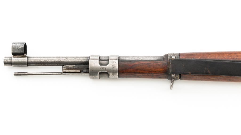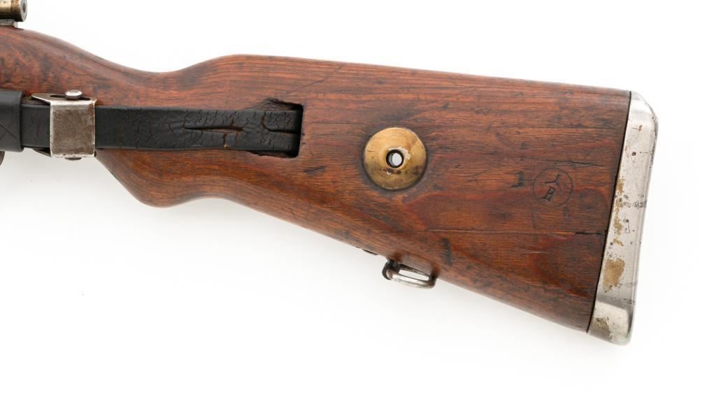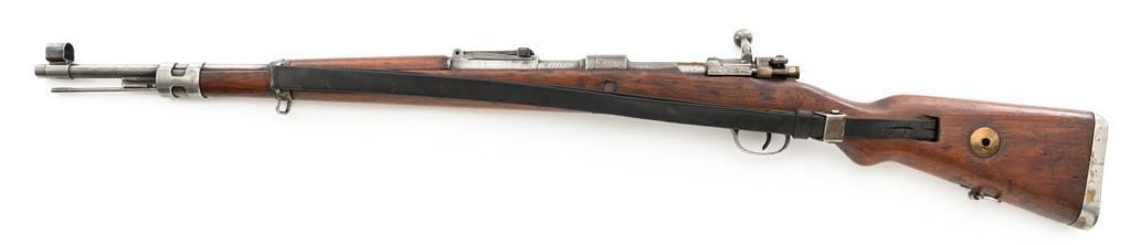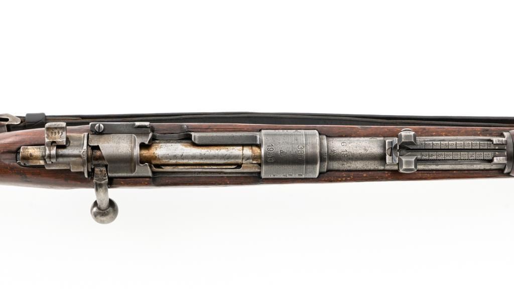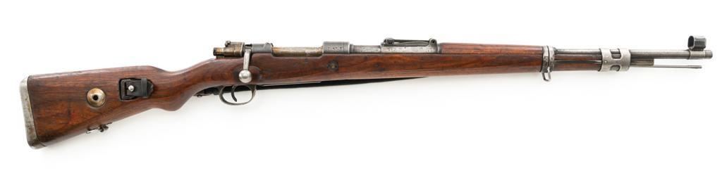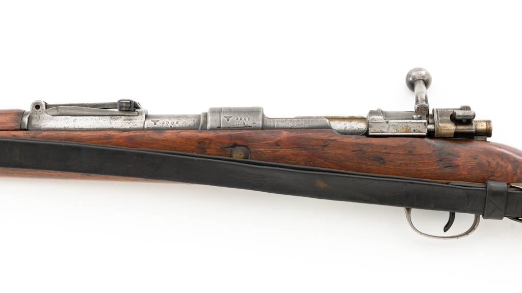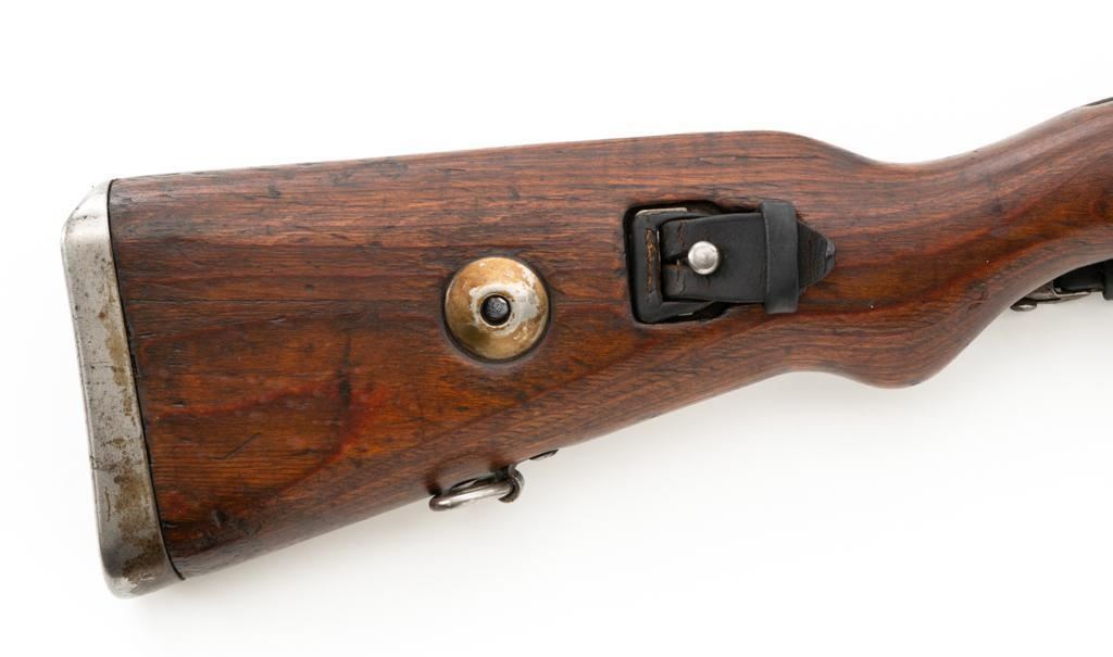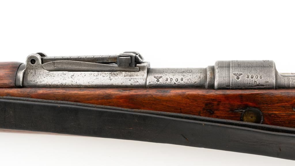 Iraq Marked Gustloff-Werke Kar 98k Mauser Bolt Action Rifle, #3006H, 8x57mm cal., 23.6" barrel, blued finish, laminated stock with handguard and cupped buttplate. Sights include a dovetailed inverted-"V" front with attached hood and adjustable tangent rear with "V"-notched groove, graduated to 2000 meters. Includes a steel cleaning rod and black leather sling. Sling is in fair condition, showing age and wear. Top of the receiver ring is marked "337/1940", right side is stamped with "(eagle)/749" inspection marks. There are intact "(eagle/swastika)" firing proofs on left side of the receiver and barrel. Top of the barrel is also stamped "G190". There are Iraqi triangle "Jeem" property marks stamped on top of the barrel shank and receiver and "RY" is stamped on left side of the buttstock. Numbers do not match. No visible import marks. An extra sling loop has been welded to the underside of the rear barrel band and an oversize sling loop fitted to the underside of the buttstock. Condition overall is good, with the metal mostly cleaned bright, showing areas of moderate pitting across the receiver and barrel. Wood has a few delamination cracks, typical marks from handling and use, with an old added coat of finish. Action operates smoothly. Bore rates fair overall with visible rifling. Est.: $500-$800. (C&R)