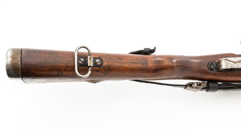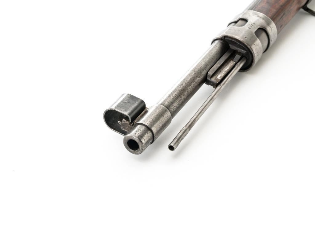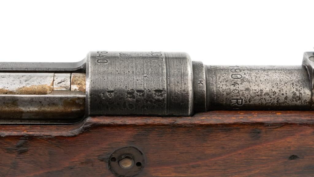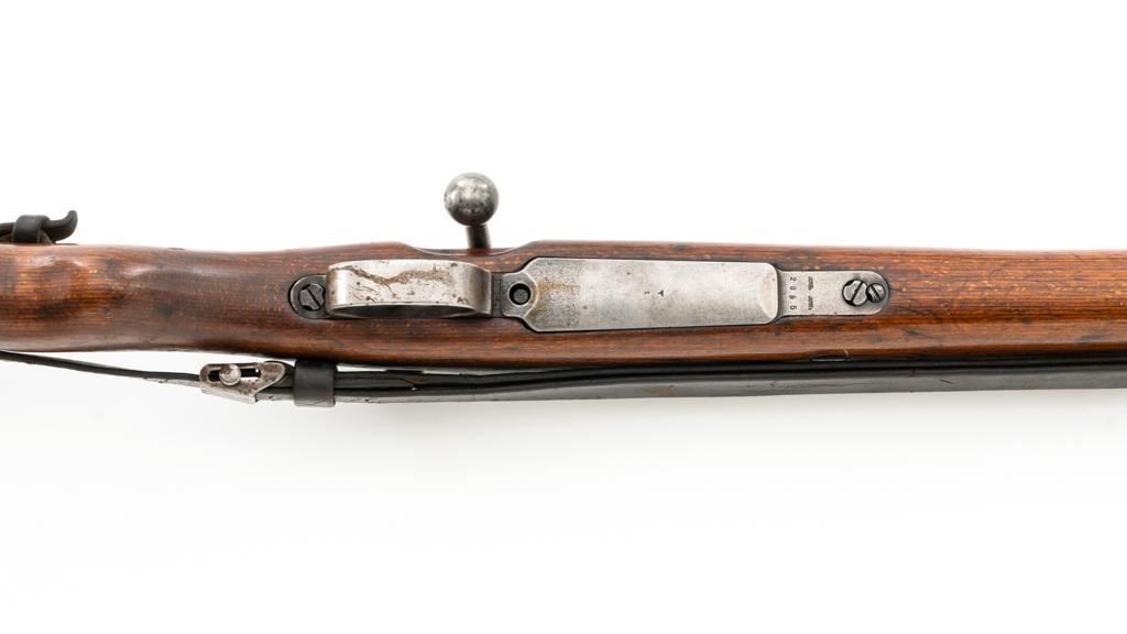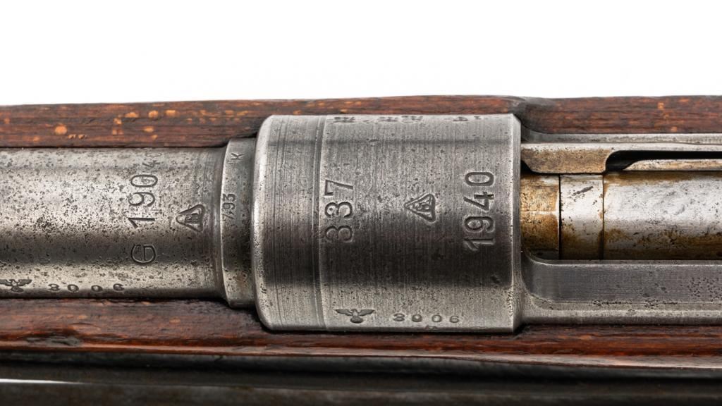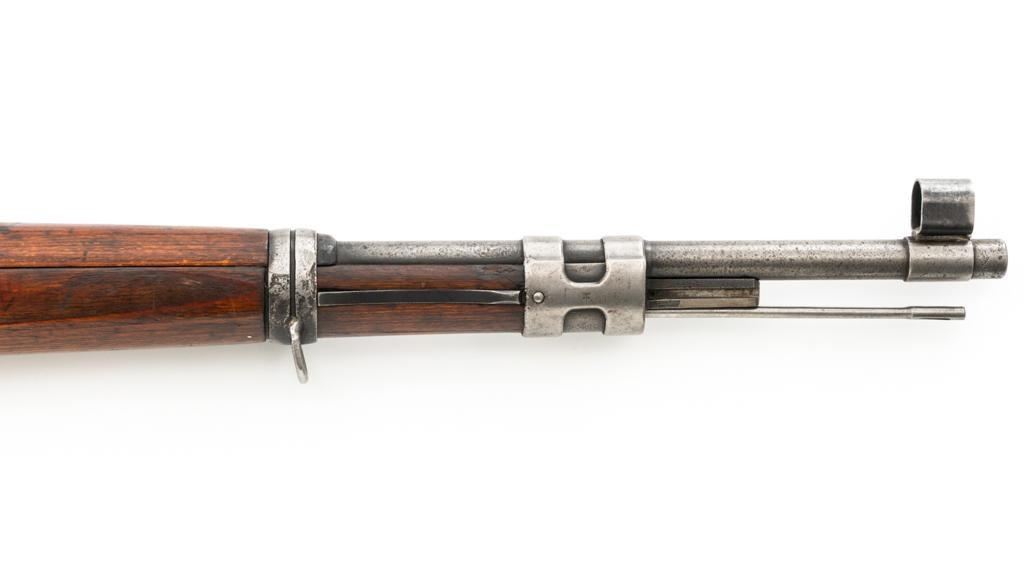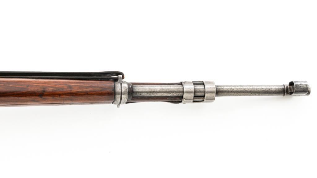 Iraq Marked Gustloff-Werke Kar 98k Mauser Bolt Action Rifle, #3006H, 8x57mm cal., 23.6" barrel, blued finish, laminated stock with handguard and cupped buttplate. Sights include a dovetailed inverted-"V" front with attached hood and adjustable tangent rear with "V"-notched groove, graduated to 2000 meters. Includes a steel cleaning rod and black leather sling. Sling is in fair condition, showing age and wear. Top of the receiver ring is marked "337/1940", right side is stamped with "(eagle)/749" inspection marks. There are intact "(eagle/swastika)" firing proofs on left side of the receiver and barrel. Top of the barrel is also stamped "G190". There are Iraqi triangle "Jeem" property marks stamped on top of the barrel shank and receiver and "RY" is stamped on left side of the buttstock. Numbers do not match. No visible import marks. An extra sling loop has been welded to the underside of the rear barrel band and an oversize sling loop fitted to the underside of the buttstock. Condition overall is good, with the metal mostly cleaned bright, showing areas of moderate pitting across the receiver and barrel. Wood has a few delamination cracks, typical marks from handling and use, with an old added coat of finish. Action operates smoothly. Bore rates fair overall with visible rifling. Est.: $500-$800. (C&R)