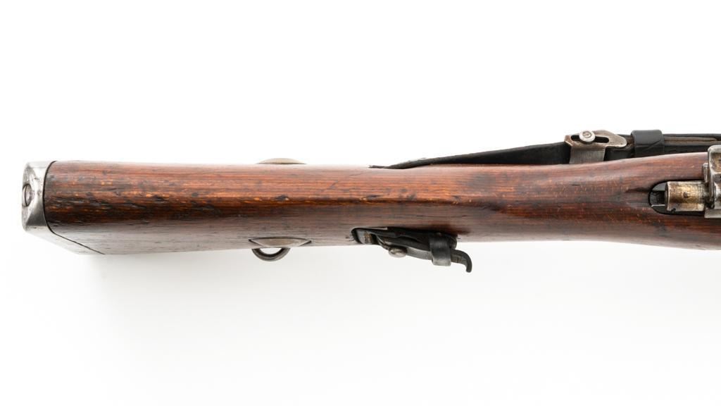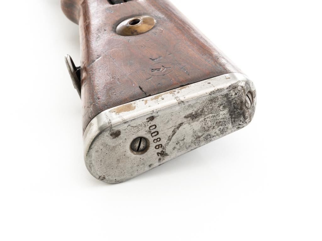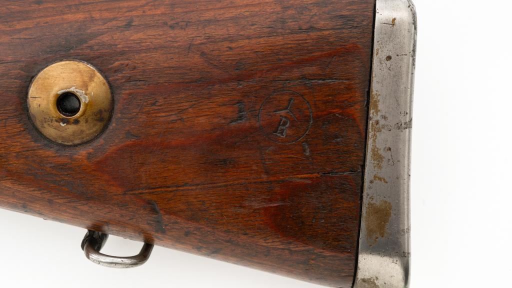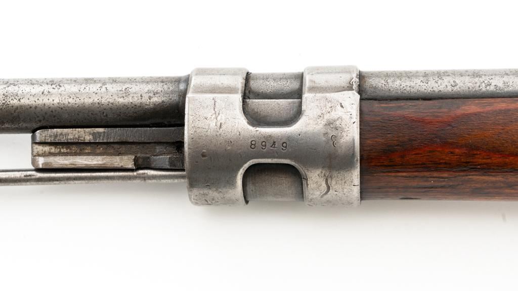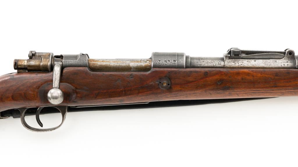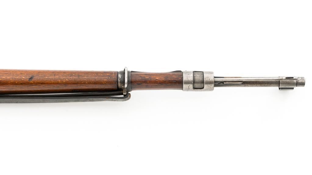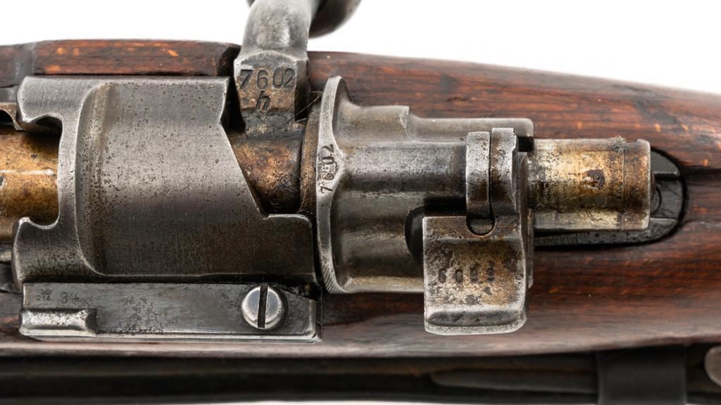 Iraq Marked Gustloff-Werke Kar 98k Mauser Bolt Action Rifle, #3006H, 8x57mm cal., 23.6" barrel, blued finish, laminated stock with handguard and cupped buttplate. Sights include a dovetailed inverted-"V" front with attached hood and adjustable tangent rear with "V"-notched groove, graduated to 2000 meters. Includes a steel cleaning rod and black leather sling. Sling is in fair condition, showing age and wear. Top of the receiver ring is marked "337/1940", right side is stamped with "(eagle)/749" inspection marks. There are intact "(eagle/swastika)" firing proofs on left side of the receiver and barrel. Top of the barrel is also stamped "G190". There are Iraqi triangle "Jeem" property marks stamped on top of the barrel shank and receiver and "RY" is stamped on left side of the buttstock. Numbers do not match. No visible import marks. An extra sling loop has been welded to the underside of the rear barrel band and an oversize sling loop fitted to the underside of the buttstock. Condition overall is good, with the metal mostly cleaned bright, showing areas of moderate pitting across the receiver and barrel. Wood has a few delamination cracks, typical marks from handling and use, with an old added coat of finish. Action operates smoothly. Bore rates fair overall with visible rifling. Est.: $500-$800. (C&R)