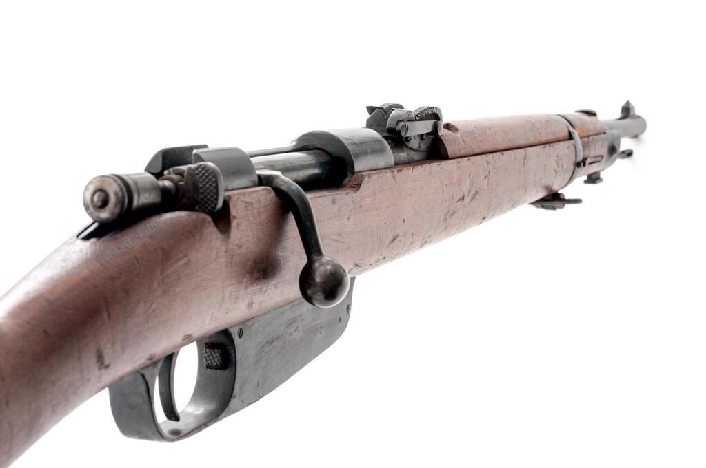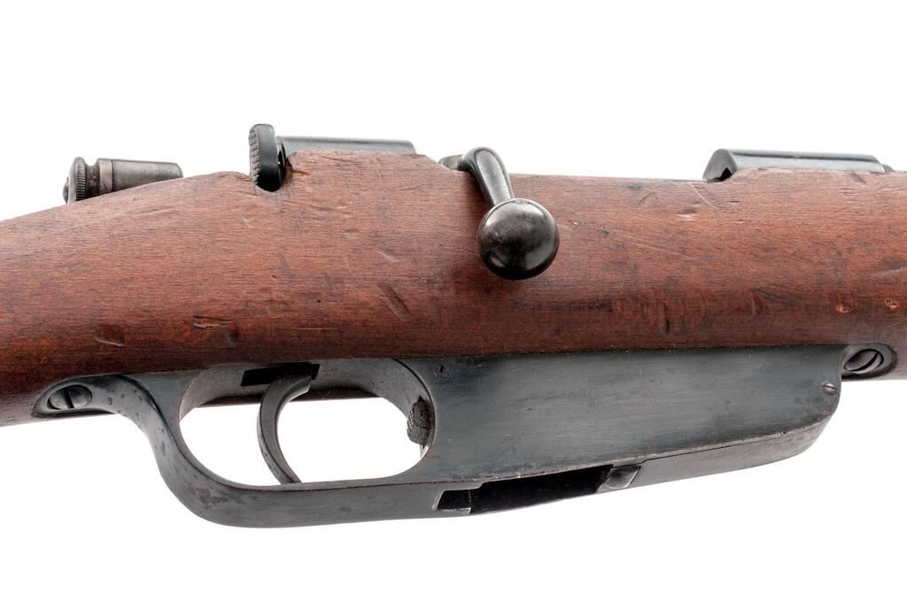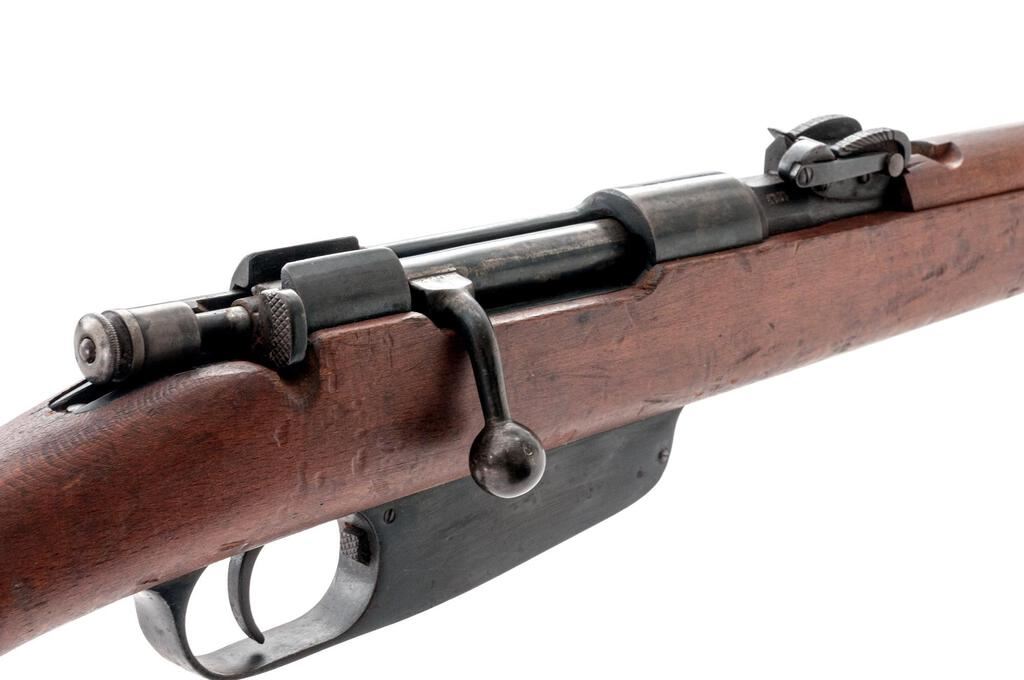 Italian Model 1891 Moschetto Carcano Bolt Action Carbine, #AG2667, 6.5x52mm, 17.7" barrel, blued finish, hardwood stock set, inverted "V" front sight and adjustable leaf rear sight with "V" notch. Underside of stock cut for bayonet blade, and front band has small tab on top to secure hand guard. Cleaning rod is mounted under the barrel. Marked on top of barrel flat "BRESCIA", and "1917" on the right side. Left-side forend stamped with boxed "Op" mark; left-side buttstock stamped with cartouche over "REPARAZIONE 1938" repair mark ahead of matching stamped serial number. Mismatched number stamped on top of bolt handle. Condition overall is very good with the metal retaining approx. 80% finish, showing a mottled appearance to the receiver ring and patinaed parts. Wood is very good with overall handling marks to the even colored finish. Action operates smoothly; bore has darkening in the grooves with frosting forward of the chamber that may clean better. No visible import marks. Est.: $400-$600. (C&R)