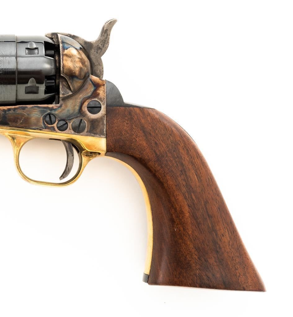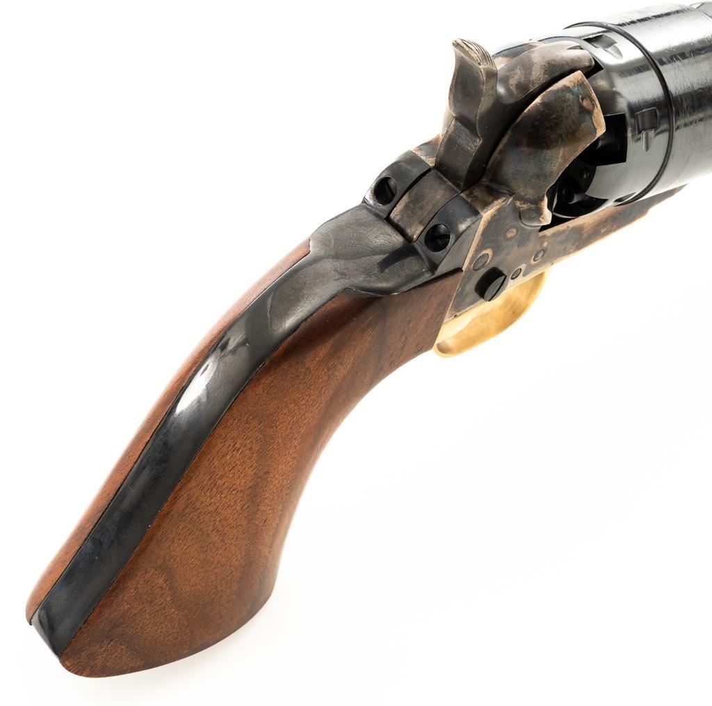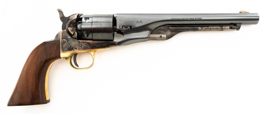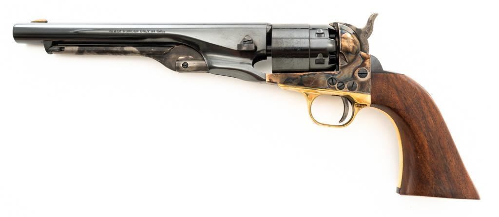 Italian Pietta 1860 Army Steel Frame Single Action Black Powder Percussion Revolver, #P71014, .44 Cal., 8" round barrel, blue and color case hardened finish with a steel frame, brass trigger guard, smooth hardwood one-piece grip, brass blade front sight, "V"-notch rear sight located on the hammer, 6-shot rebated roll engraved cylinder. Marked "MADE IN ITALY" on the right side of the barrel. Revolver is in excellent overall condition, retaining approx. 99%+ blue finish on the barrel and steel backstrap. Nipples and hammer face show no use with all safety pins intact. Grips are in excellent condition with attractive figure. Action is crisp. Bore is bright with excellent rifling. Est.: $200-$400. (No FFL Required)