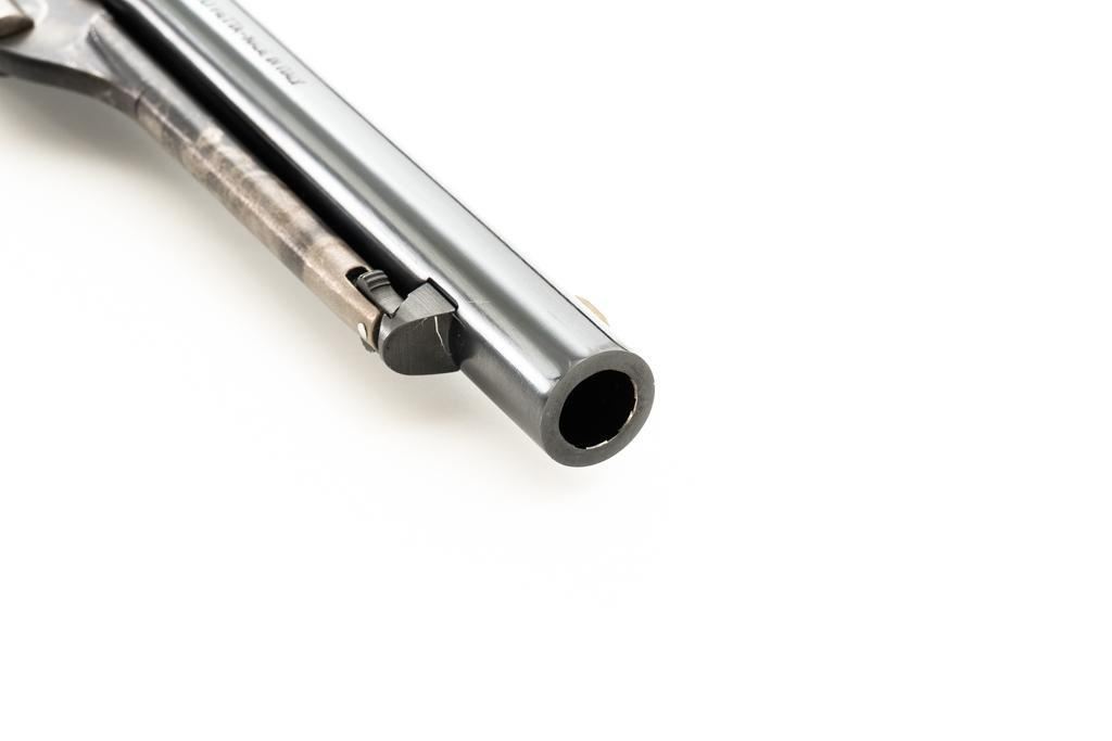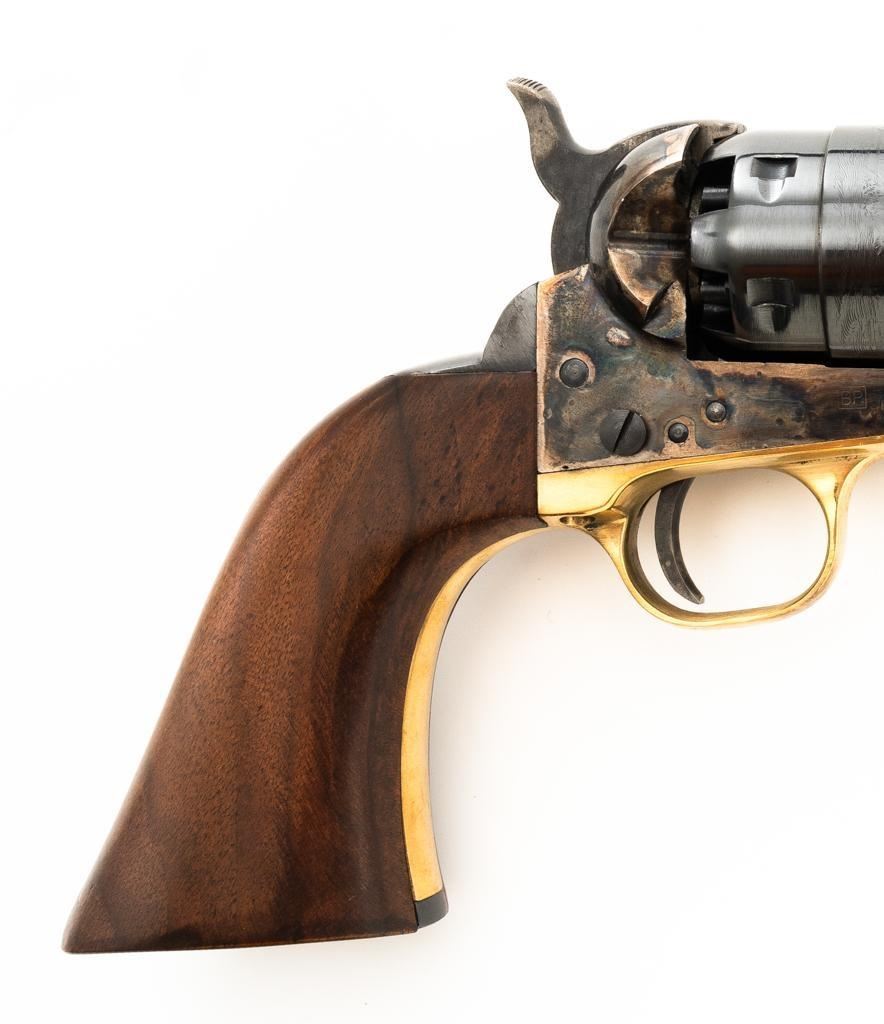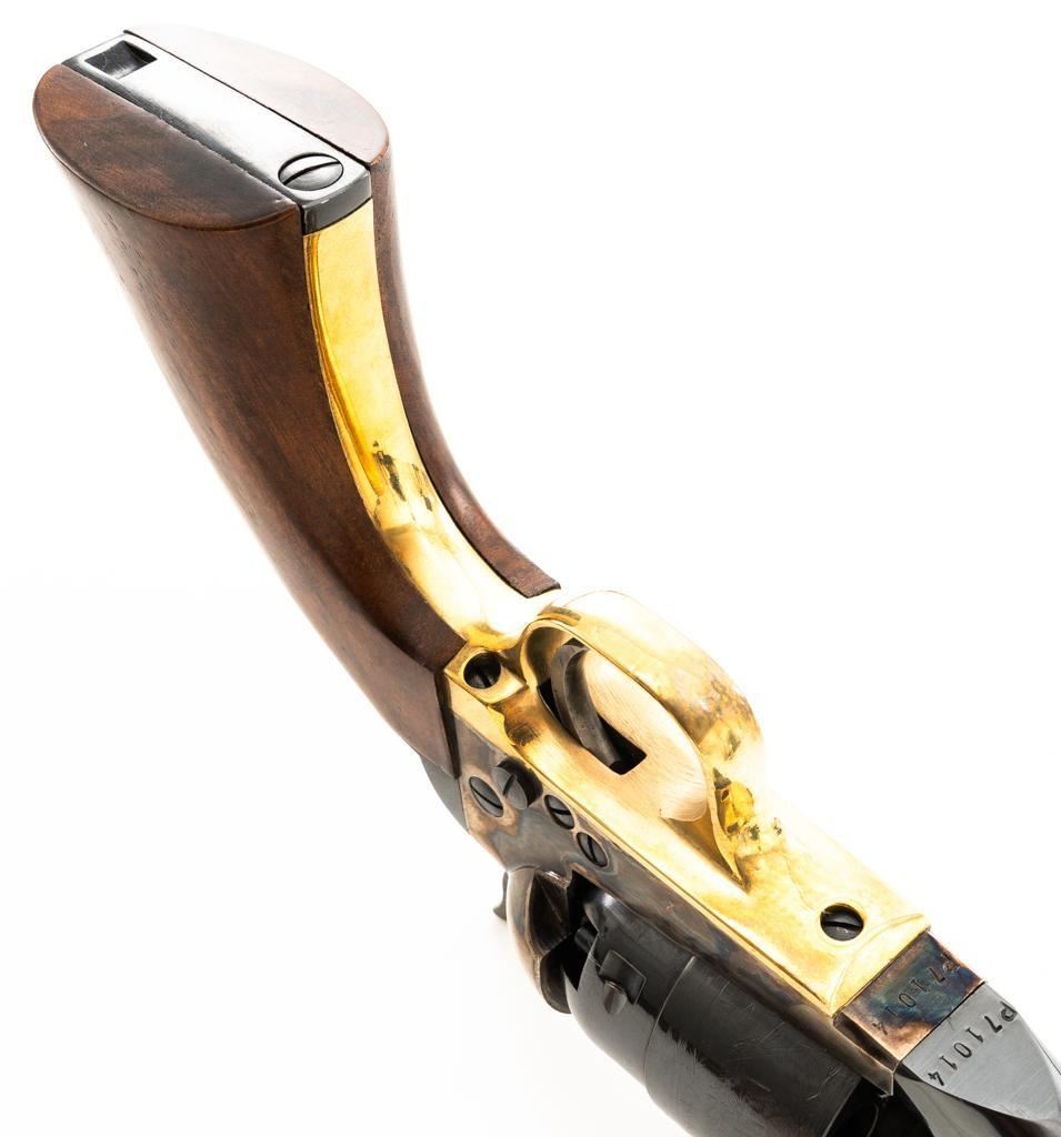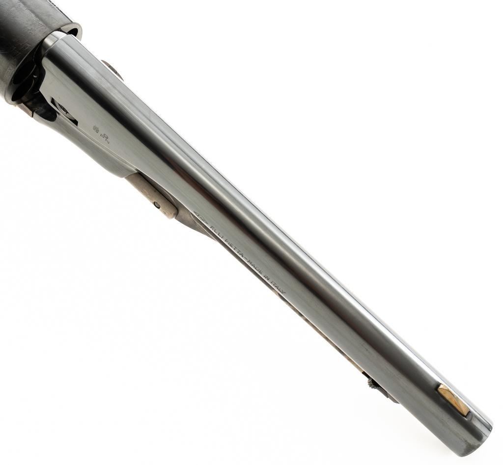 Italian Pietta 1860 Army Steel Frame Single Action Black Powder Percussion Revolver, #P71014, .44 Cal., 8" round barrel, blue and color case hardened finish with a steel frame, brass trigger guard, smooth hardwood one-piece grip, brass blade front sight, "V"-notch rear sight located on the hammer, 6-shot rebated roll engraved cylinder. Marked "MADE IN ITALY" on the right side of the barrel. Revolver is in excellent overall condition, retaining approx. 99%+ blue finish on the barrel and steel backstrap. Nipples and hammer face show no use with all safety pins intact. Grips are in excellent condition with attractive figure. Action is crisp. Bore is bright with excellent rifling. Est.: $200-$400. (No FFL Required)