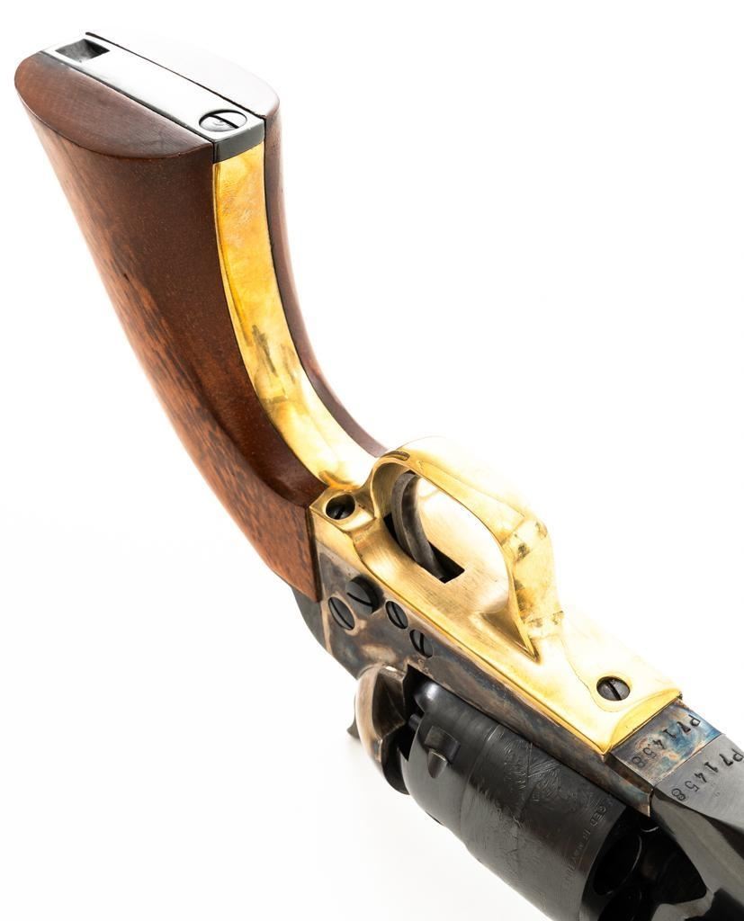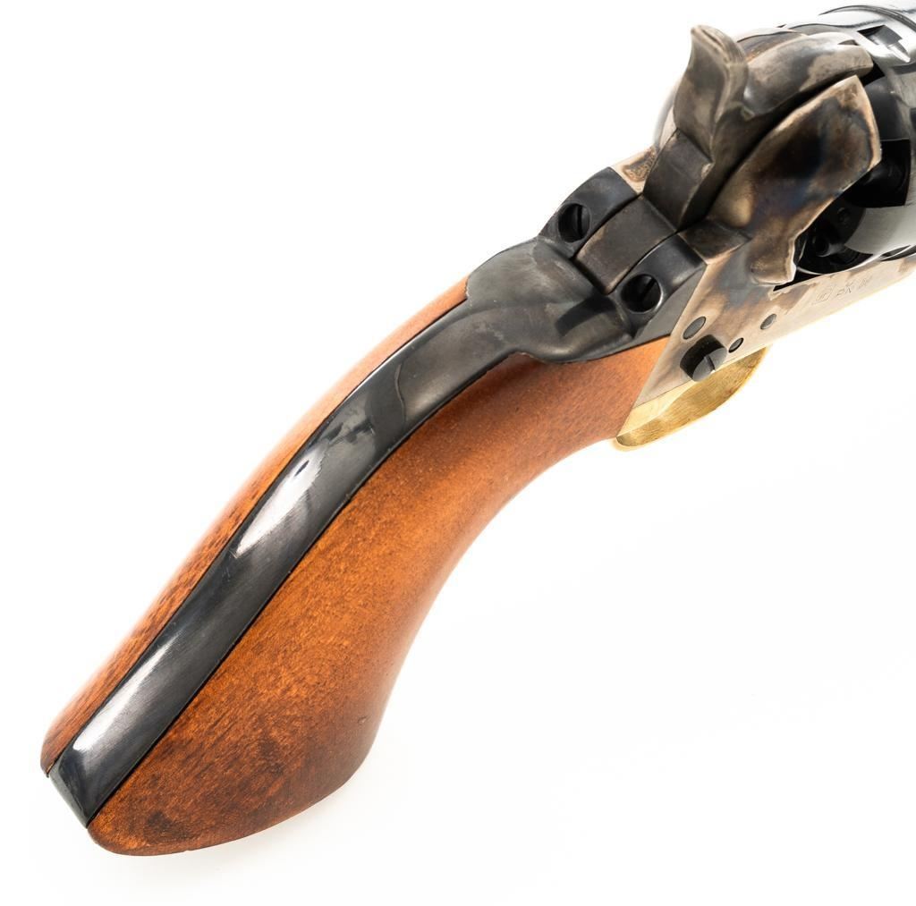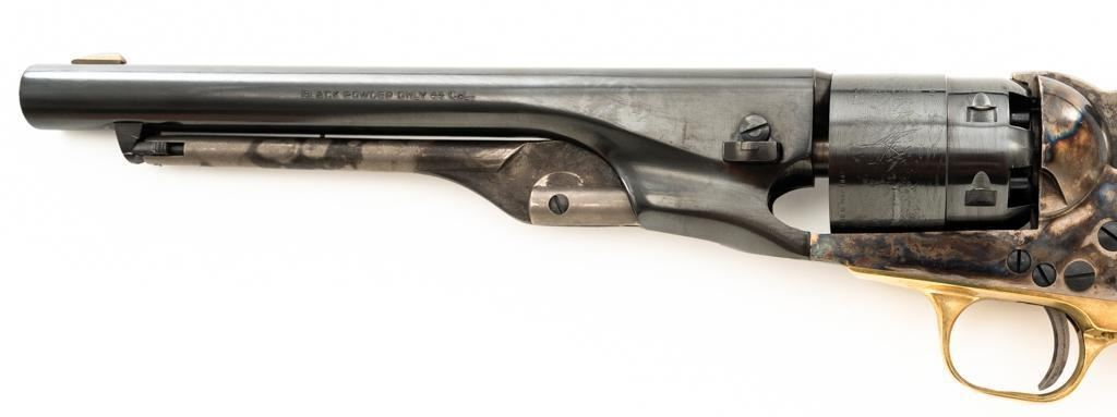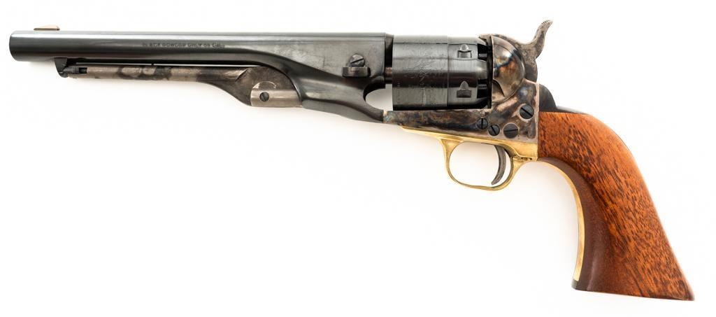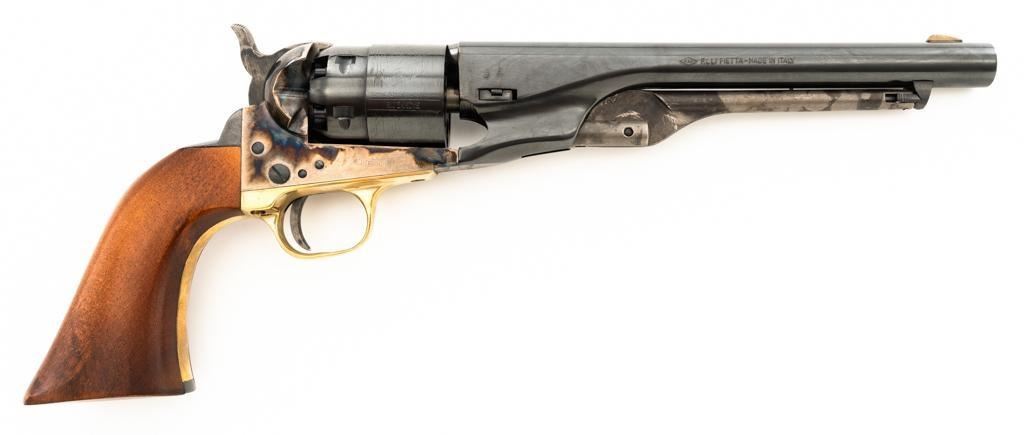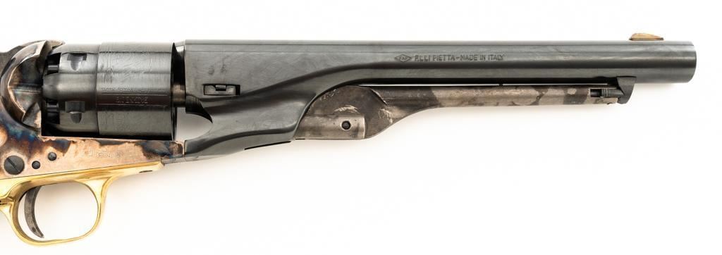Italian Pietta 1860 Army Steel Frame Single Action Black Powder Percussion Revolver, #P71458, .44 Cal., 8" round barrel, blue and color case hardened finish, brass trigger guard, smooth hardwood one-piece grip, brass blade front sight, and "V"-notched rear sight located on the hammer. Marked "MADE IN ITALY" on the right side of the barrel. Revolver is in excellent overall condition, retaining approx. 98%-99% blue finish on the barrel and steel backstrap. Nipples and hammer face show no use with all safety pins intact. Grips are in excellent condition. Action is crisp and cycles smoothly. Bore is bright with excellent rifling. Est.: $200-$400. (No FFL Required)