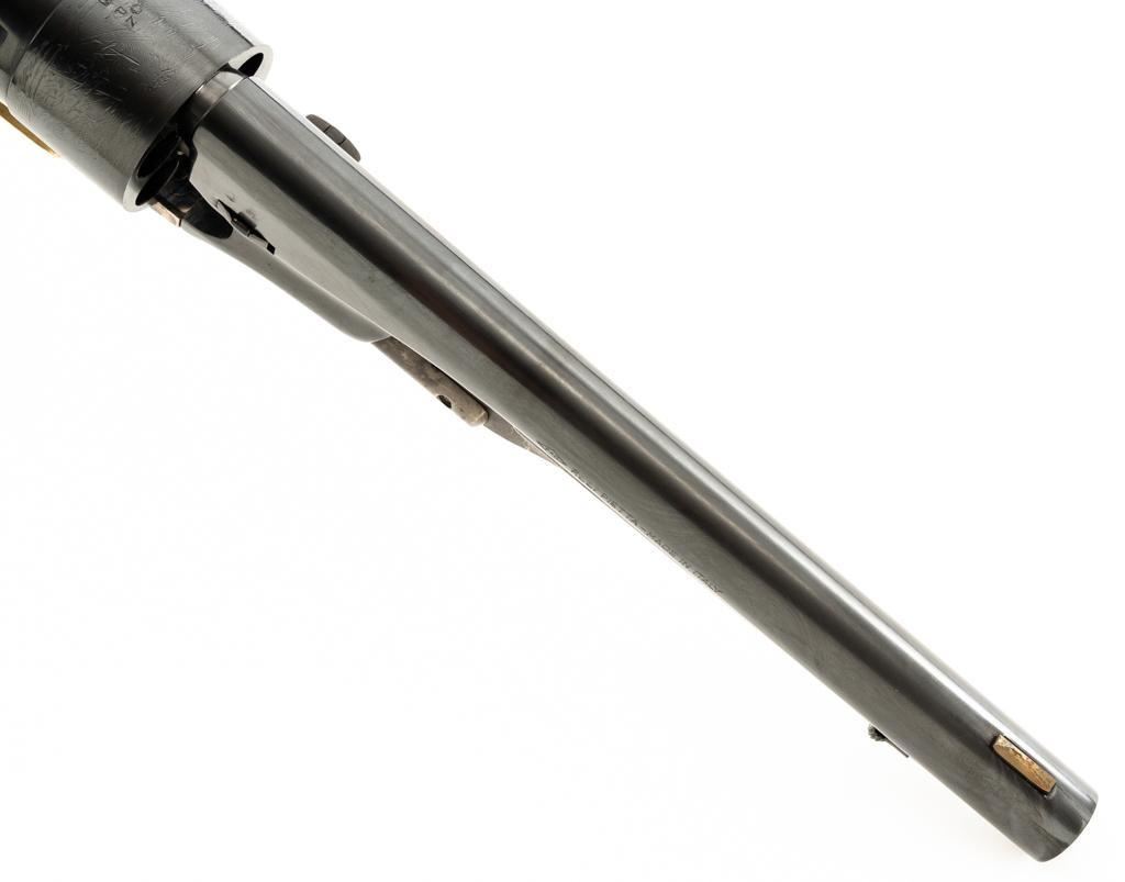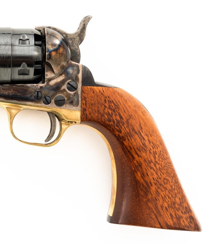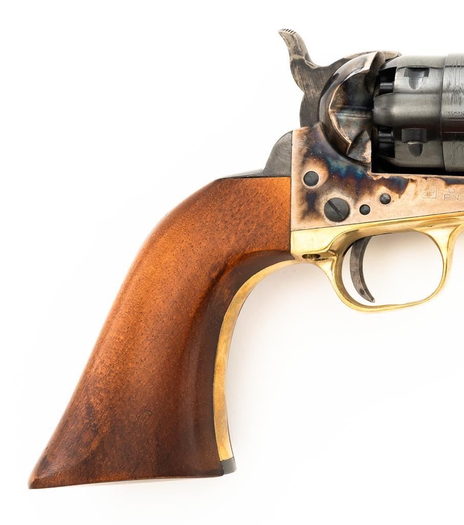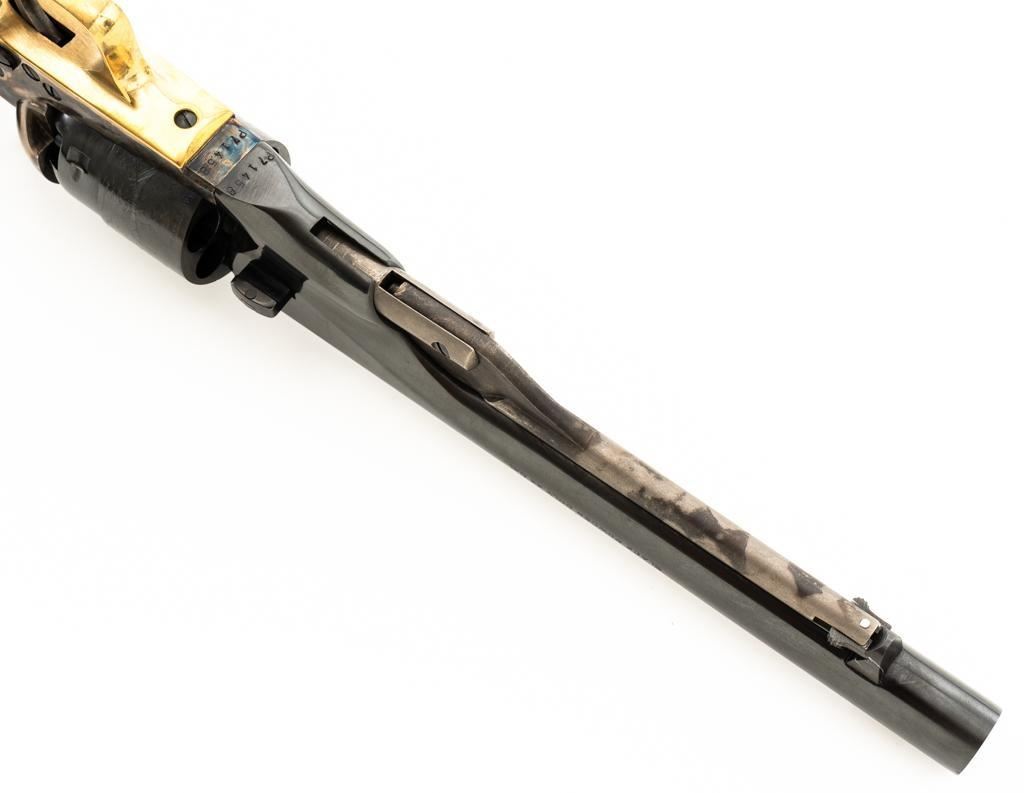 Italian Pietta 1860 Army Steel Frame Single Action Black Powder Percussion Revolver, #P71458, .44 Cal., 8" round barrel, blue and color case hardened finish, brass trigger guard, smooth hardwood one-piece grip, brass blade front sight, and "V"-notched rear sight located on the hammer. Marked "MADE IN ITALY" on the right side of the barrel. Revolver is in excellent overall condition, retaining approx. 98%-99% blue finish on the barrel and steel backstrap. Nipples and hammer face show no use with all safety pins intact. Grips are in excellent condition. Action is crisp and cycles smoothly. Bore is bright with excellent rifling. Est.: $200-$400. (No FFL Required)