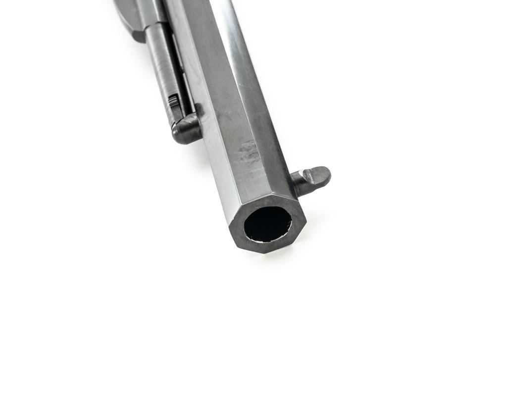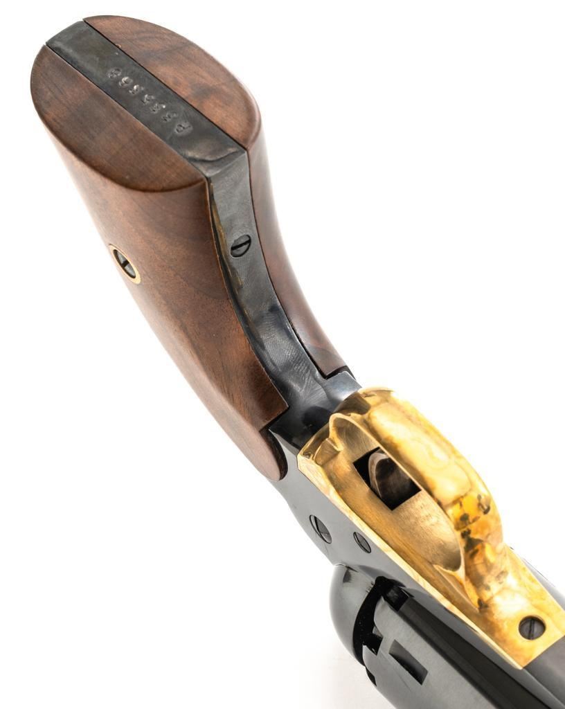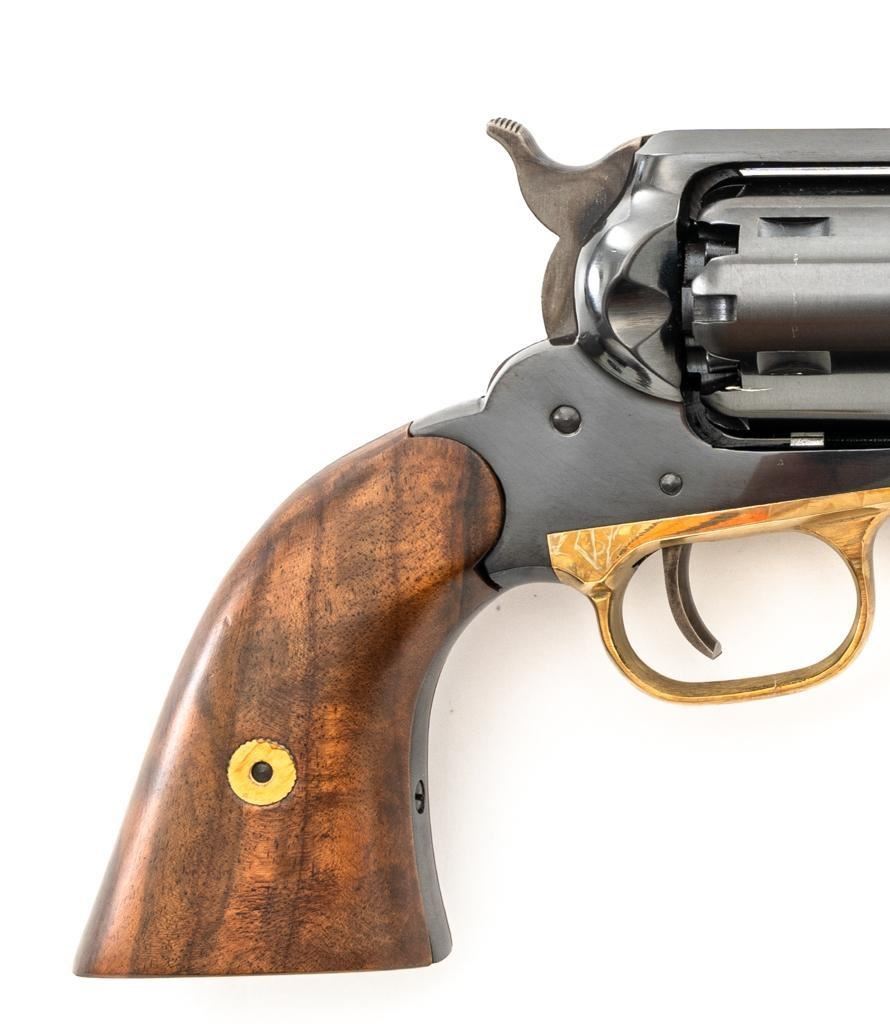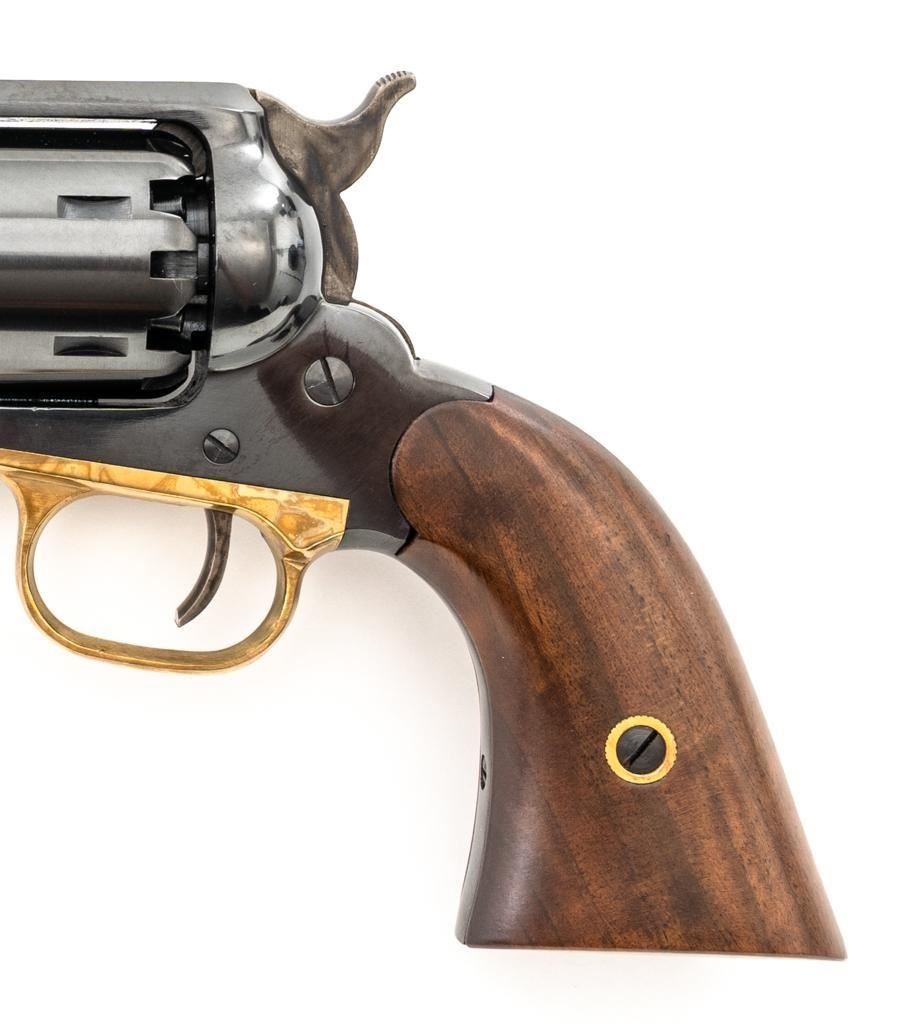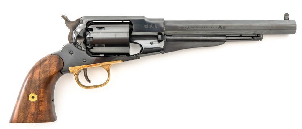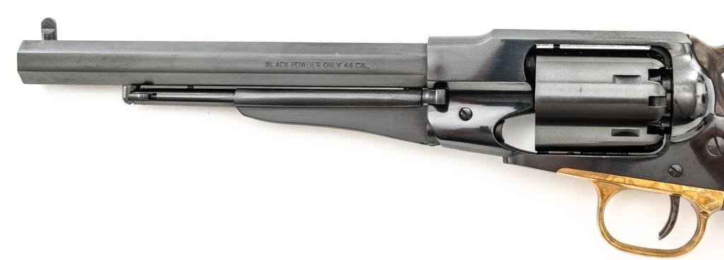 Italian Pietta Remington Model 1858 Black Powder Percussion Revolver, #R335368, .44 cal., unfluted 6-shot cylinder, 8" octagon barrel, blue finish, brass trigger guard, color case hardened hammer and trigger, smooth hardwood two-piece grips, flattened pin front sight, and fixed square-notch rear sight. Marked "MADE IN ITALY" on right side of the barrel. Revolver is in excellent overall condition, retaining approx. 98%-99% factory finish, showing little use. Grips are in excellent condition. Action is crisp. Bore is mirror bright with excellent rifling. Est.: $200-$400. (No FFL Required) (Consecutive to the next lot.)