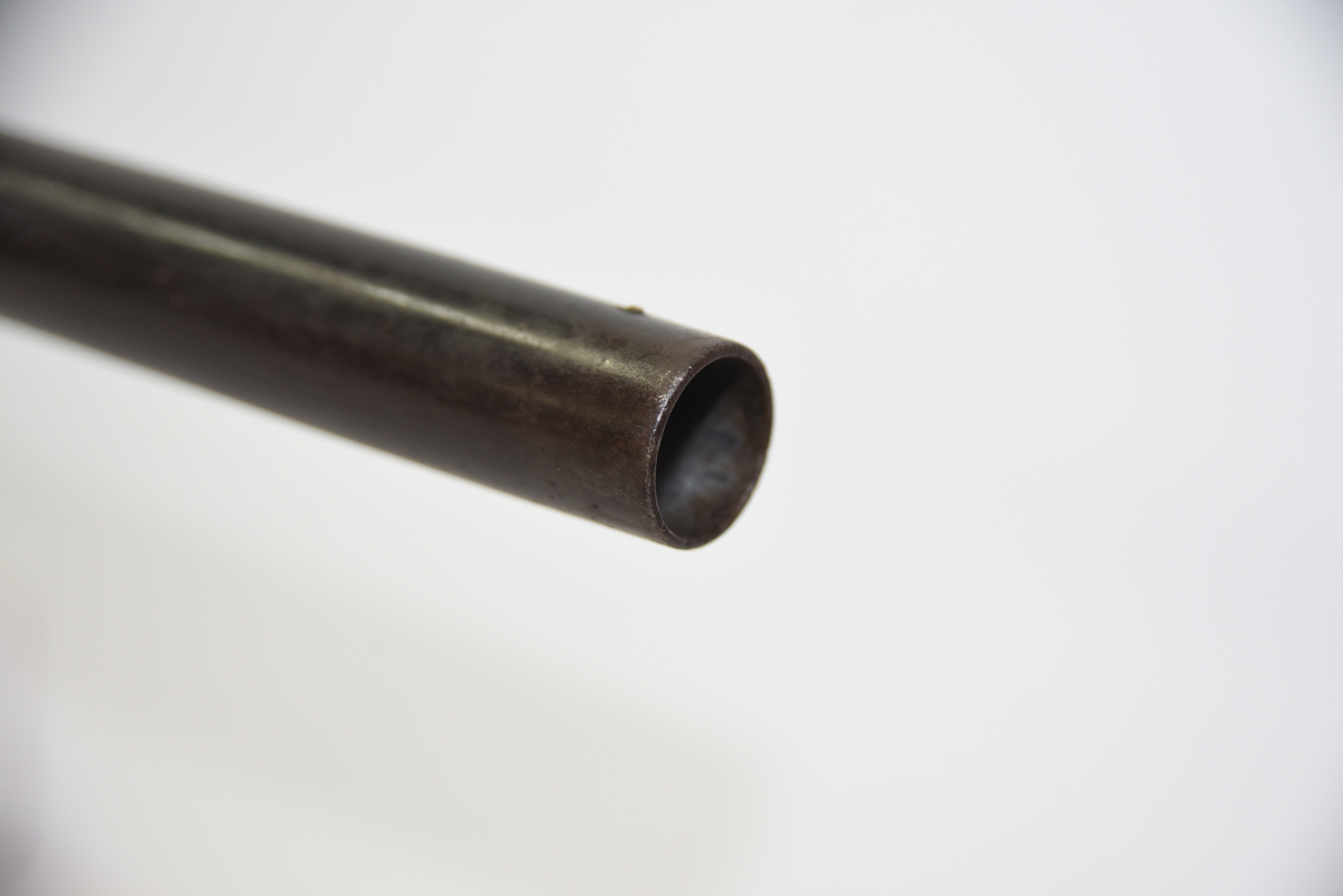Metal finish shows lots of patina, scratches, scuffs, finish wear, front sight bead is missing; condition is less than fair.