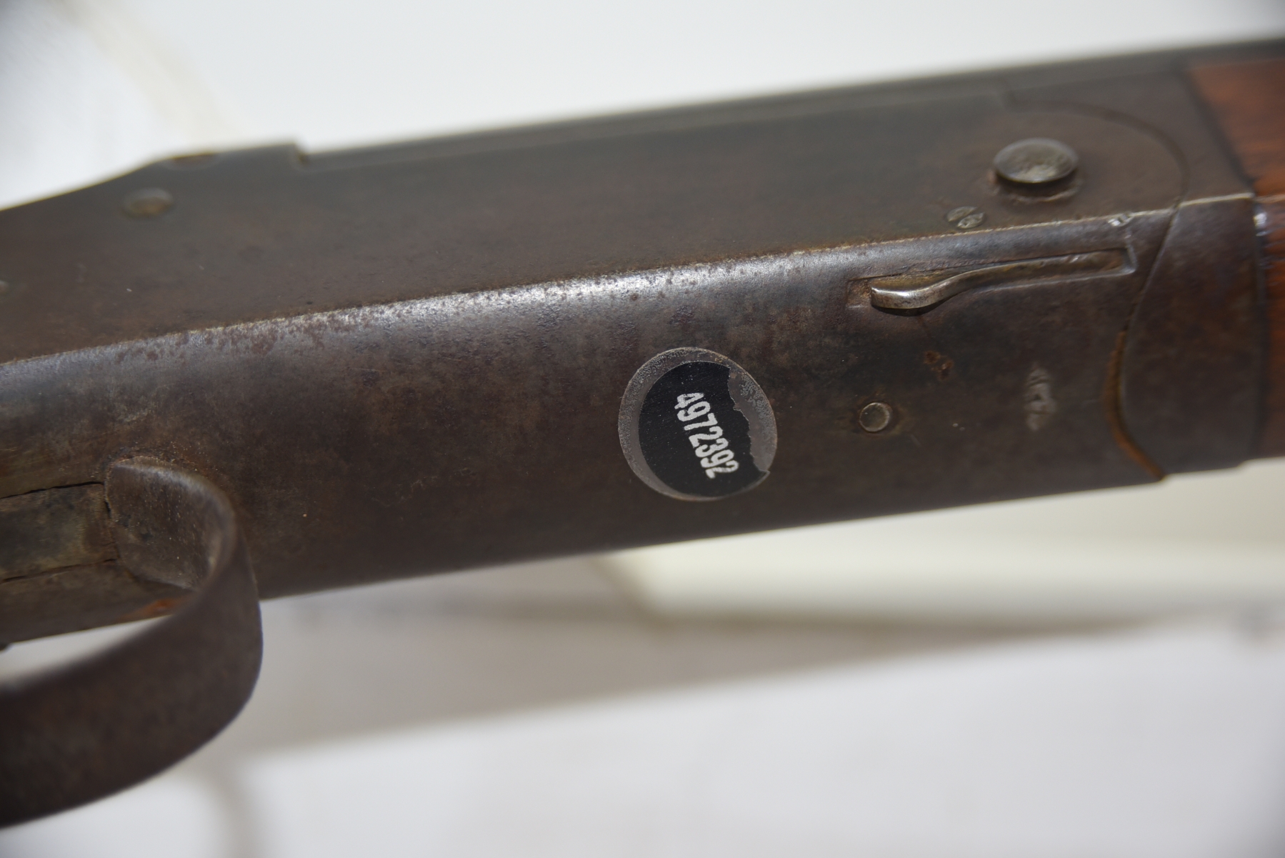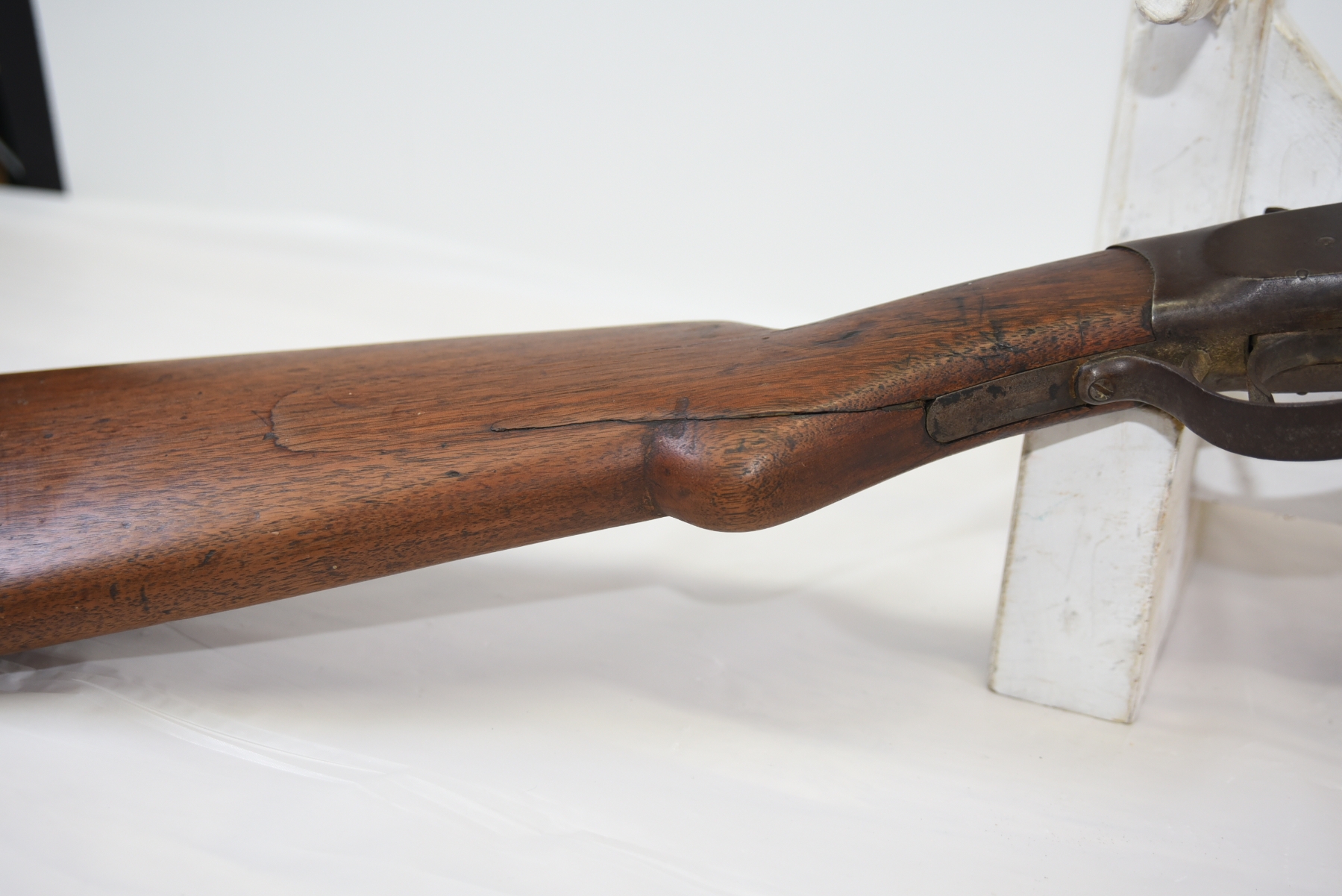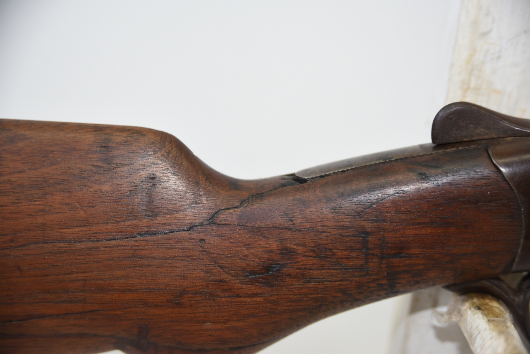Wood stock shows cracks in the rear stock, some cracks in the forearm, there are scratches, scuffs, chips; condition is poor.