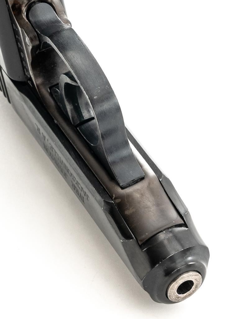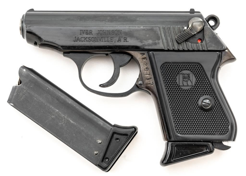 Iver Johnson Model TP Series 22 Semi-Automatic Pistol, #AE29717, .22 LR cal., 2.9" barrel, blue finish, checkered plastic two-piece "owls head" wraparound grips, low profile blade front and fixed square-notch rear sights, ringed hammer, hammer block safety, heel magazine release, and includes two (2) 7-round blue steel magazines with finger extensions. Mfgd circa 1982-1989. Pistol is in fine overall condition, retaining approx. 95%-96% factory finish, with scattered light scuffs and scratches, particularly along the slide. Trigger guard shows light edgewear. Factory markings are clear. Grips are in excellent condition. Action functions well. Bore is fine with well-defined rifling. Est.: $150-$300. (Modern/PPT)