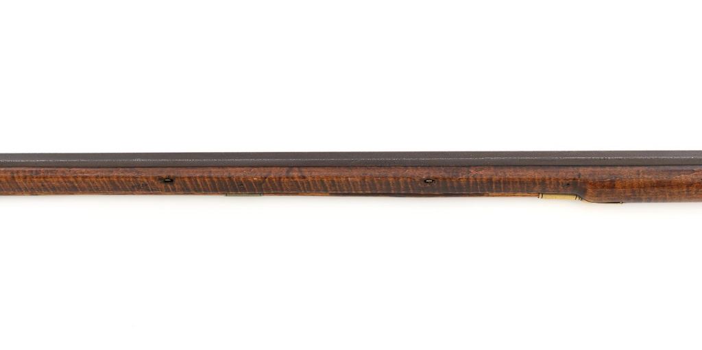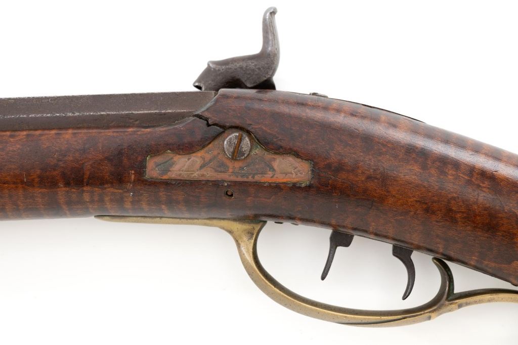J.E. Harder Marked Full-Stock Pennsylvania Black Powder Percussion Muzzle Loading Rifle, #NVSN, .36 cal., 39" octagon barrel, metal with dark patina, faux tiger striped maple full-length stock with brass hardware, dovetailed German silver blade front sight, fixed "U"-notch rear sights, double set triggers in exaggerated brass trigger guard with finger rest, and full-length wooden ramrod. Barrel is marked "J E HARDER" on the top flat near the breech. Rifle is in very good overall condition, with the metal surfaces having a dark patina, showing intermittent light to moderate pitting along the length of the barrel. Side plate was likely color case hardened with crude "J" shaped scratches and simple light engraving to the hammer. There is corrosion and pitting around the nipple and barrel, due to firing and powder exposure. Stock is near fine with faux tiger striping, fading in areas. Brass hardware displays a pleasing patina, including the lightly engraved patch box with stylized finial. Stock has numerous indentations, scratches, and wood loss around the nipple from firing and exposure. Action and double set triggers function. Bore is dark. Jacob E. Harder was a noted gunsmith in the Clearfield/Lock Haven, PA area beginning in 1846, after a six year apprenticeship with the Bartlett Bros in New York. J.E. Harden & Son were still building rifles into the 1890s. Est.: $700-$900. (Antique)