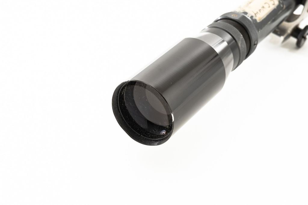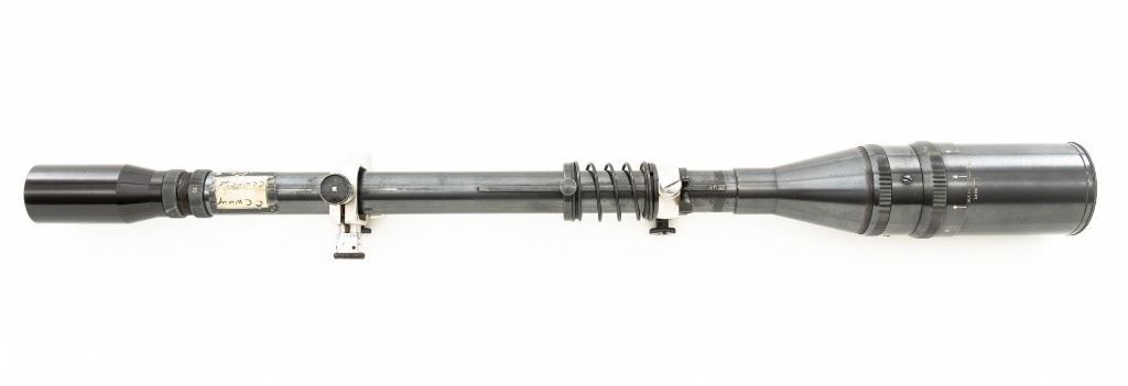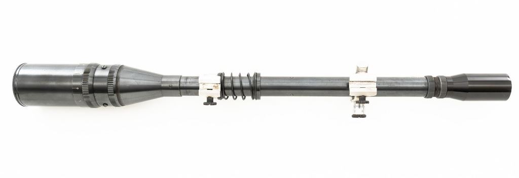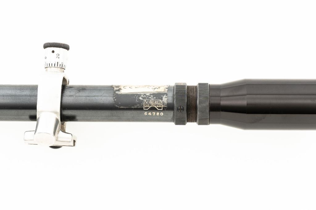 J Unertl 2" Ultra Varmint Rifle Scope with Calibrated Head, #64780, 1" tube, blued finish, 24" length, 2" objective with fine crosshair reticle. Includes rear three-point mount with micrometer click adjustments, front mount, recoil spring, and front lens cap. Scope is in very good condition, showing some minor handling marks, and scattered lights scratches. Finish has begun to fade in some areas, mainly on the tube. Optics are bright and clear, all adjustments turn freely. Est.: $500-$700.