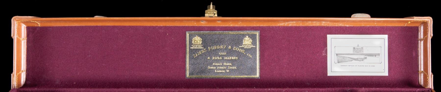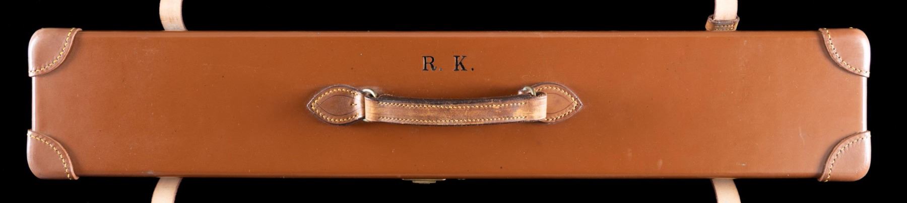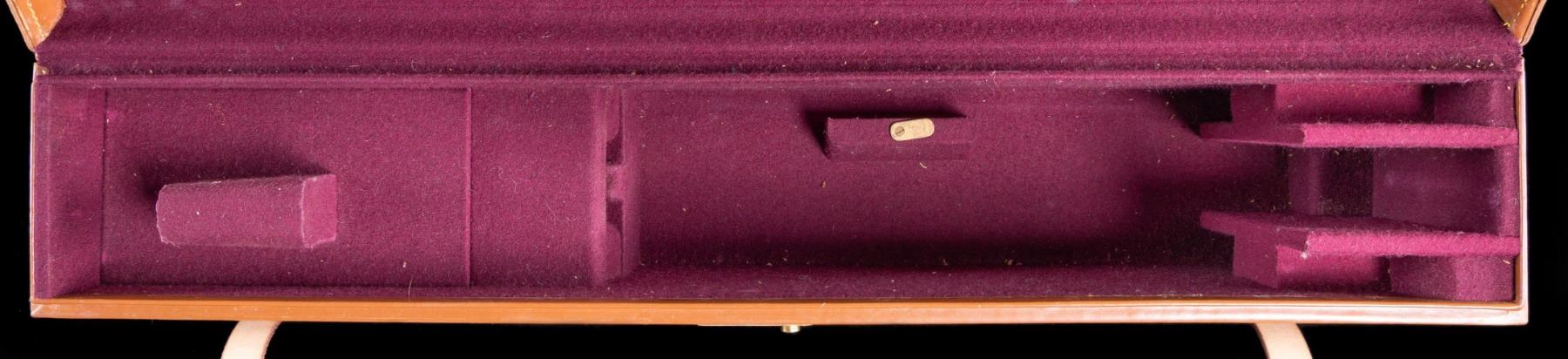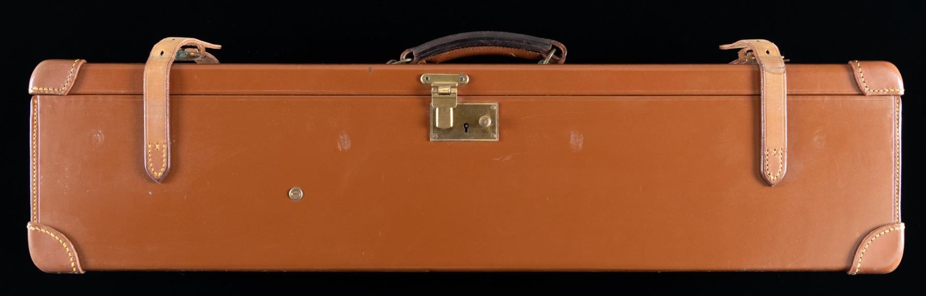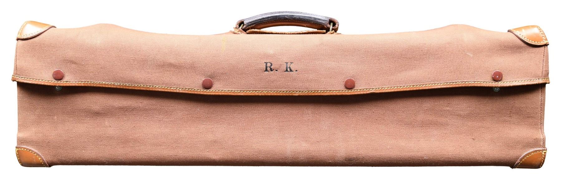 Approx. 31" x 8" x 6" Brown leather motor case for shotgun w/ brown canvas cover with leather corners & reinforcements. Case has 2 fastening straps & 1 carrying strap. Red velour fitted interior has James Purdey & Sons label on lid. Case is able to hold buttstock 20" from buttplate to tip of receiver. Top portion is able to hold 27" or 28" barrels. CONDITION: case in very good lightly worn condition showing verdigris on strap buckles & light marks. Canvas cover has 2 large tears around top back reinforcements. PROVENANCE: from the renowned collection of quality sporting arms from Lewis Drake together with inventory of Lewis Drake Associates. (02-23560/MD). $300-450.