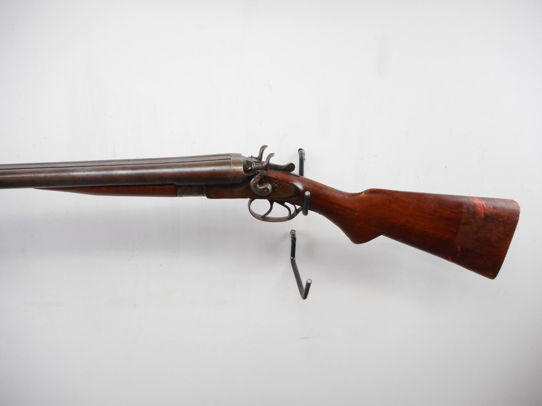 JANSSEN AND SONS, MODEL: SIDE BY SIDE HAMMERGUN, CALIBER: 12GA 2 3/4", BORE FAIR, PITTED. FIXED IC AND IM CHOKES. BRASS BEAD, BARRELS LOOSE ON FACE, SIDE PLATES, WITH EXTERNAL HAMMERS MISSING ONE SCREW, FIRING PIN RETAINER IS BROKEN. SMOOTH TWO PIECE WOOD STOCKS, PISTOL GRIP, MISSING BUTT PLATE. METAL FINISH SILVER GREY WITH LIGHT RUST SPECKLES AND WEAR. STOCKS SHOW DINGS, SCRATCHES AND WEAR. , ACTION: HINGE SIDE BY SIDE - SHOTGUN, BARREL LENGTH: 30", CONDITION: 2/10, SERIAL # 1811, CLASS: CANADIAN NON RESTRICTED CLASS