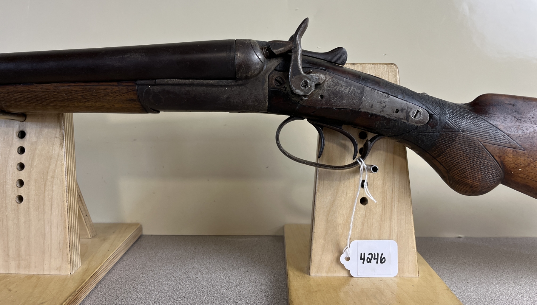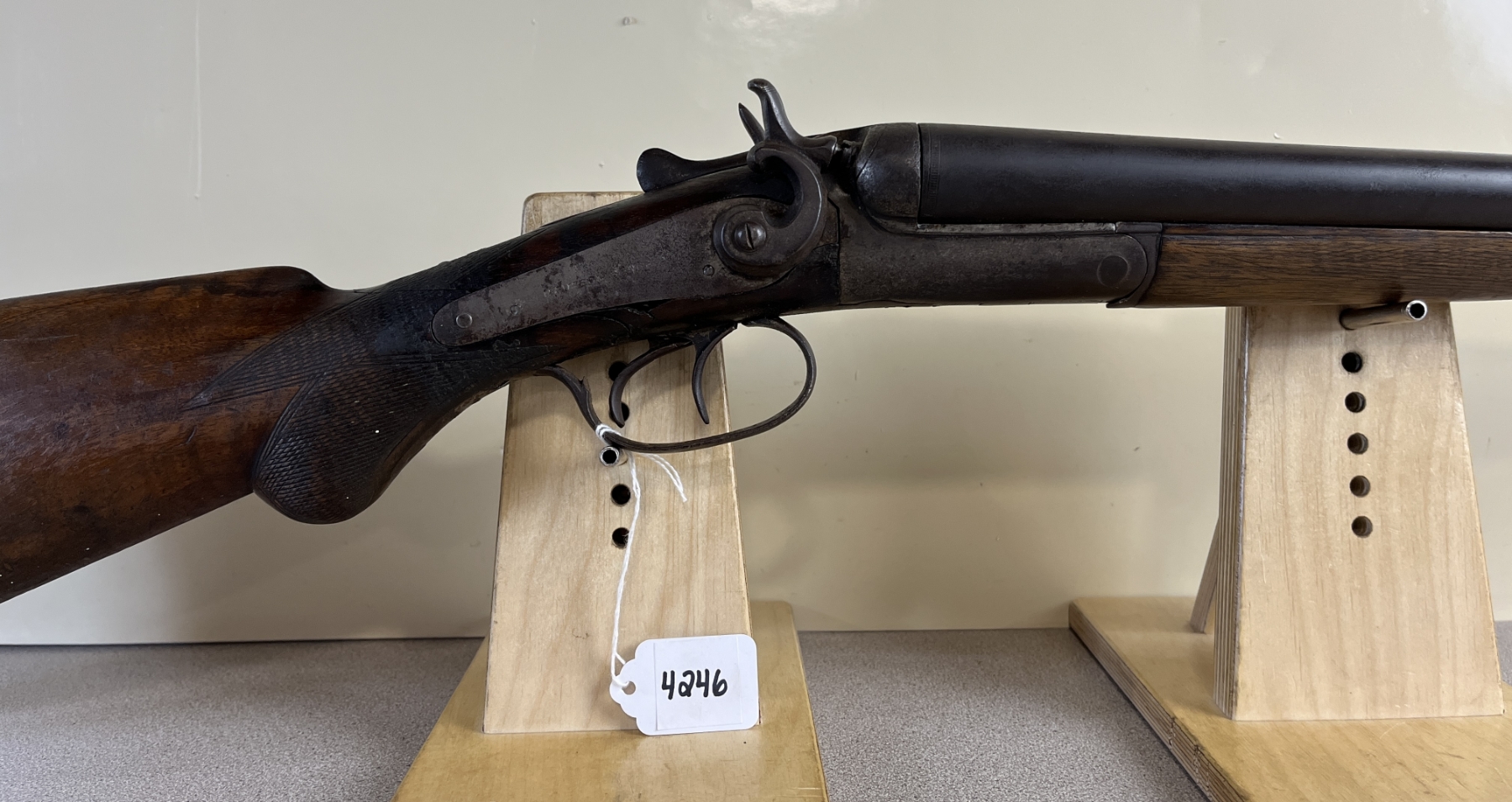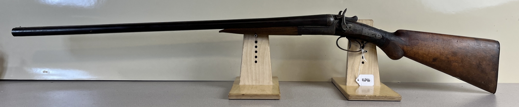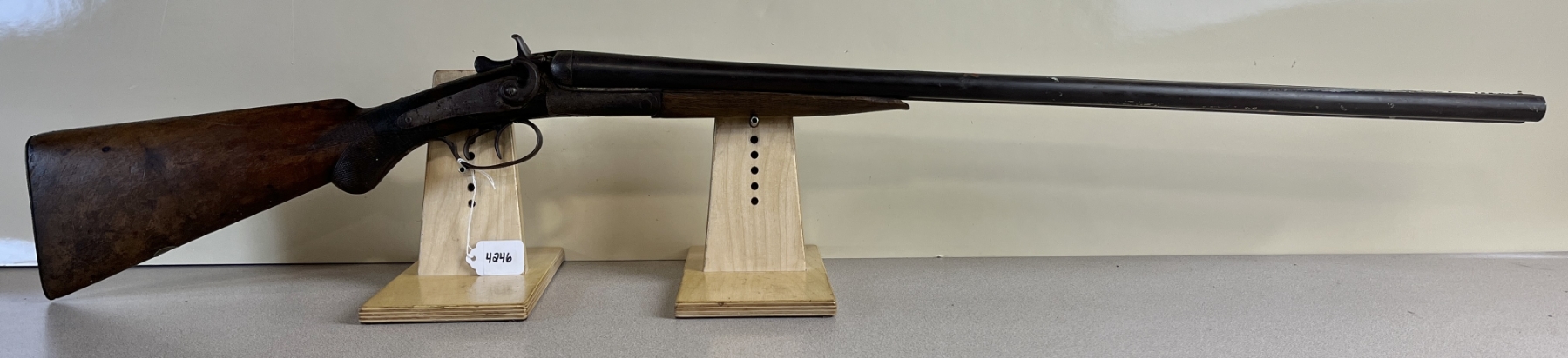 CONDITION: P-F OVERALL F BORE. NOTE MAJOR REPAIRED CRACK AT WRIST. SHOWS APPROX 3MM PLAY IN THE ACTION. SPECS: 30IN SXS BBLS, CHOKED IC BY MOD. EXTRAS: NONE. S/N: 7323