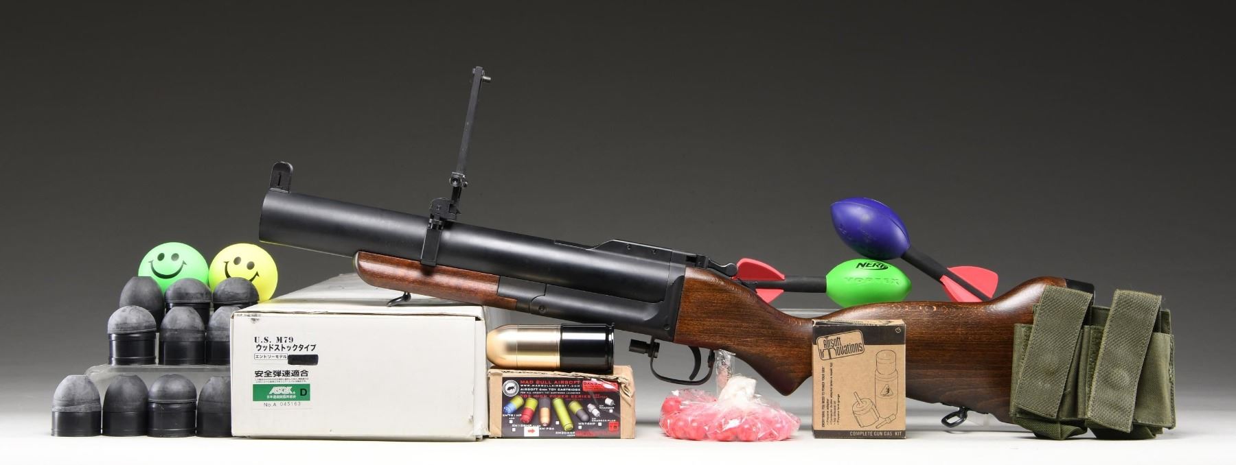 LAUNCHER. Mfg. by the Japan Amusement Gun Association for Craft Apple Works. Box has # A 045163. Replica of Vietnam era Grenade Launcher w/ black plastic 13 7/8" bore & hardwood stock. UNATTACHED ACCESSORIES: factory box. Additional accessories box including Craft Apple Works M79 operator's manual, 4 Mad Bull Air soft XM-BP4 toy cartridge, 1 nylon pouch, 4 rubber balls, 3 Nerf darts, sling, ball of red paint balls, 11 rubber projectiles, homemade ramrod, CD & Airsoft Innovations complete gun gas kit. CONDITION: near excellent overall showing minimal wear. (02-24530/MD). NON-GUN. $50-100.