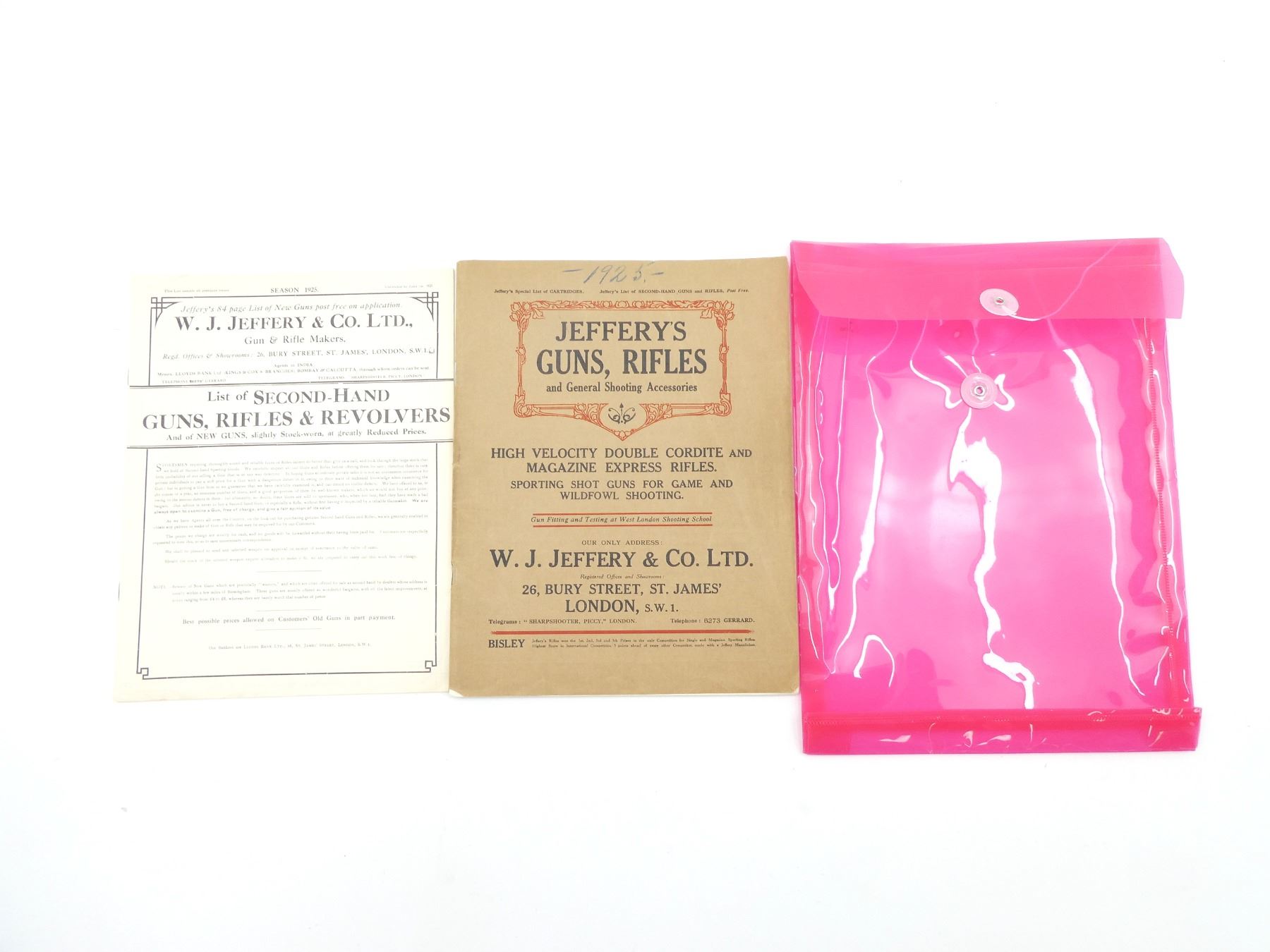 LOT INCLUDES; (1) "JEFFERY'S GUNS, RIFLES AND GENERAL SHOOTING ACCESSORIES", BY W.J. JEFFERY & CO LTD., SOFT COVER, DATED 1925 & (1) "LIST OF SECOND-HAND GUNS, RIFLES & REVOLVERS", BY W.J. JEFFERY & CO. LTD., SOFT COVER, DATED 1925. SEE PHOTOS.