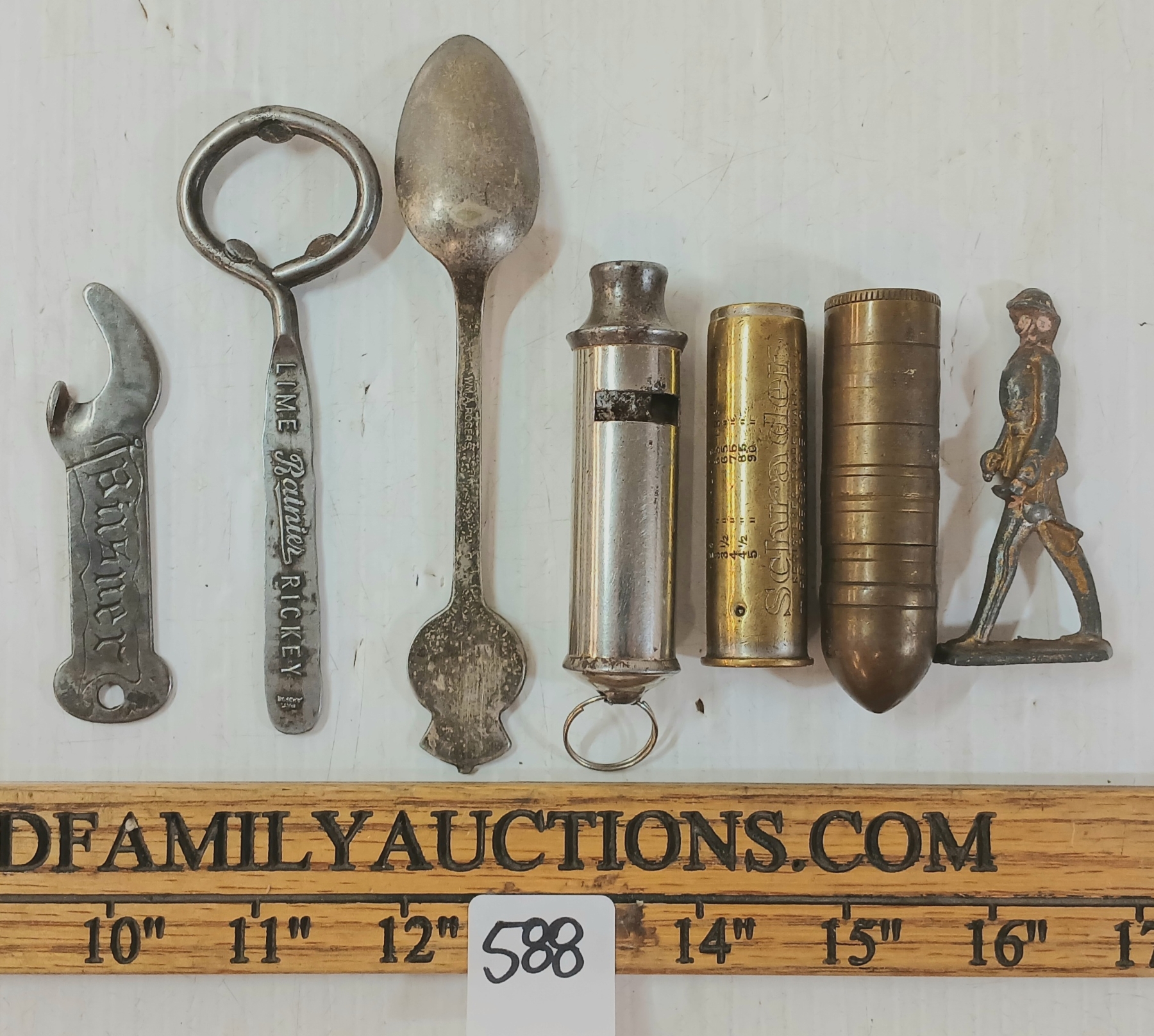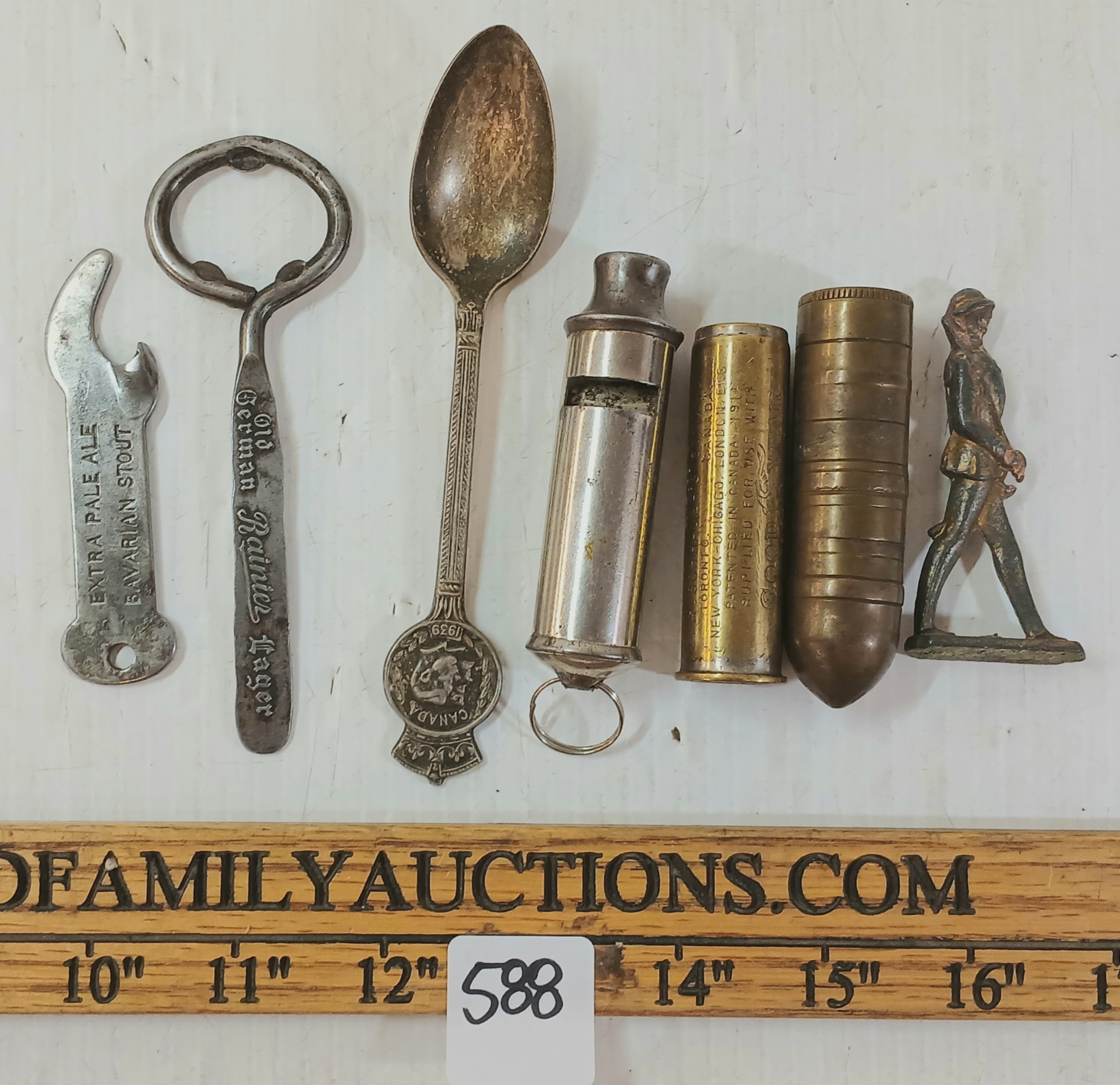 JOB LOT - KASCHIE TRENCH ART LIGHTER, WHISTLE, SILVER PLATED CDN SPOON, LEAD SOLDIER, ETC