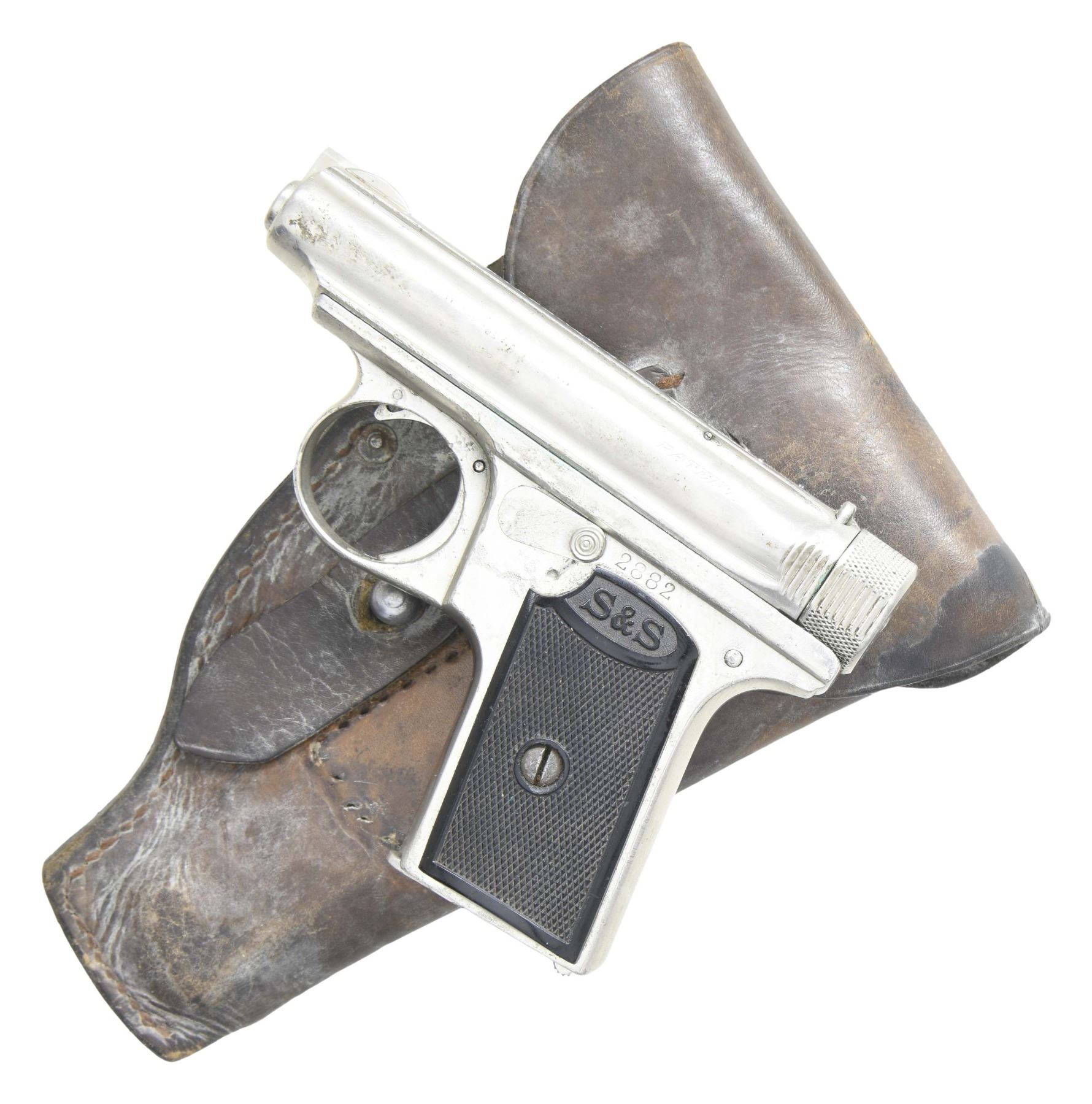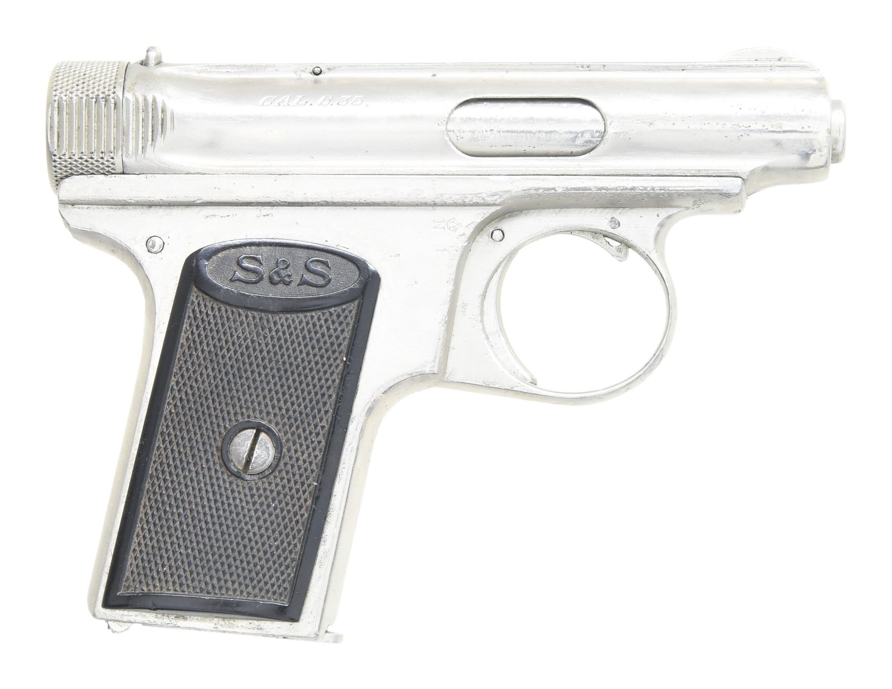 Cal. 6.35mm (25 ACP). S# 2882. Bbl 2 1/2". Round blade front sight. U-notch rear sight. Reapplied chrome finish. Checkered black rubber grips with "S&S" monograms. MAGS: 1-6 rd. with reapplied chrome finish. UNATTACHED ACCESSORIES: leather holster in worn condition with scattered staining, flaking & crazing. CONDITION: grips show scattered checkering wear & handling marks. Metal retains most of this reapplied chrome finish with several patches of finished over pitting, dings & some flaking along the edges. Action functions properly when hand cycled. Bore shows scattered light pitting & frosting. (25-2668/MJC). CURIO. $200-400.