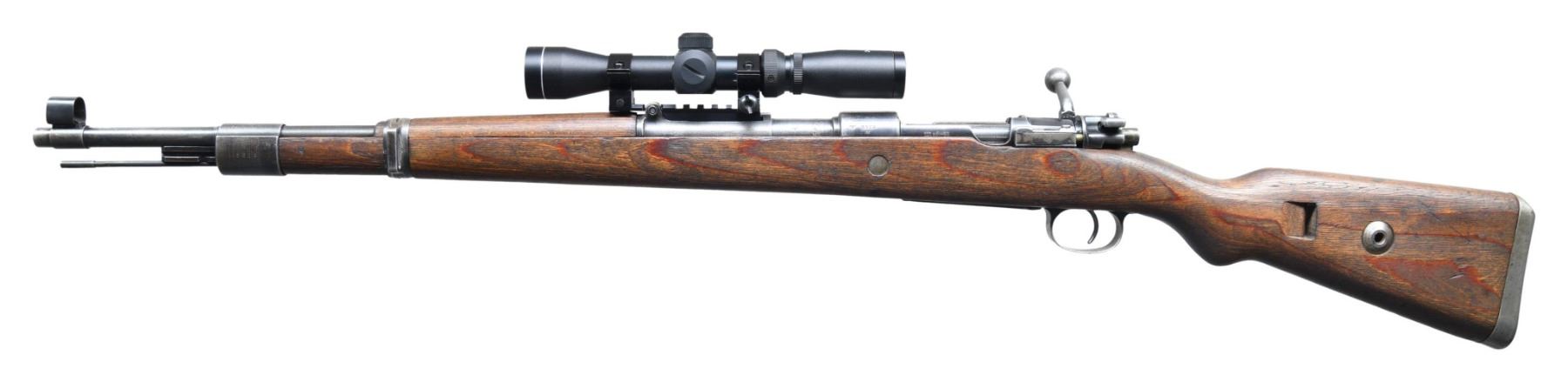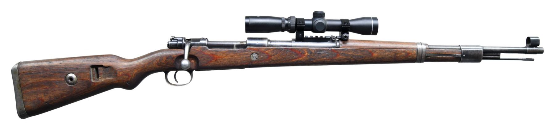 Cal. 8mm Mauser. S# 3639m. Bbl. 23 1/2". Post front sight with hood. Rear sight removed & AIM 2-7x power scope mounted on rear sight base. Scope has good optics & duplex crosshair reticle. Bolt parts are mismatched but other visible numbered parts are matching to receiver. Receiver top has "ce43" script marking denoting mfr. by JP Sauer in 1943. Blued finish. Laminated stock set with left side sling provisions & faint eagle "H" (Heer) marking. CONDITION: stock appears lightly sanded with added dark oil finish, scattered dings & handling marks. Metal retains 30% original blue with overall fading to gray, a couple moderate tool marks on rear of bbl & some light oxidation. Action functions properly when hand cycled. Worn bore with scattered grease & oxidation. (25-965/MJC). CURIO. $300-500.