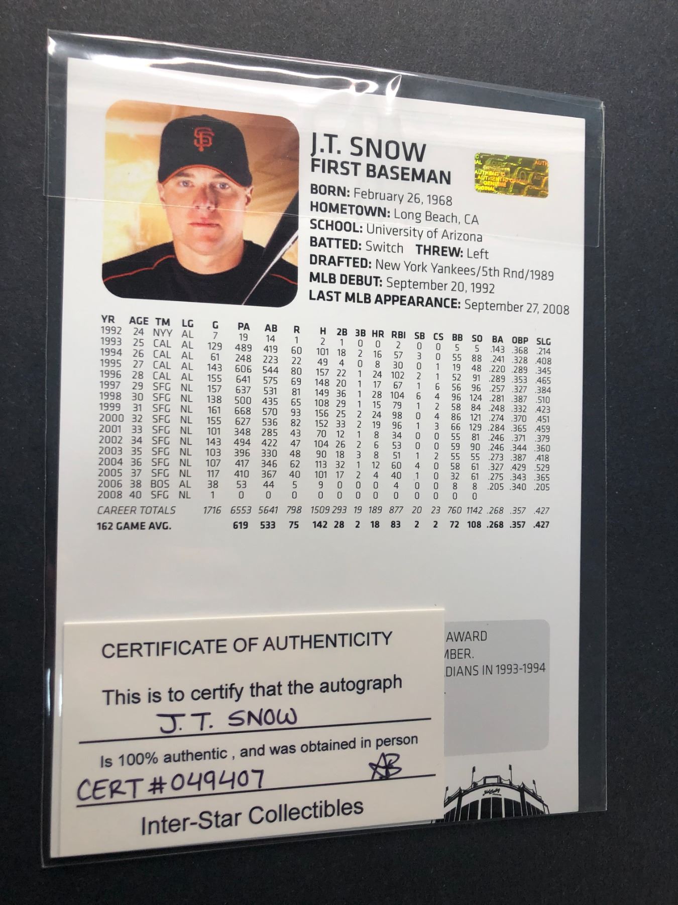 JT Snow AUTOGRAPHED 5x7 Card - Angels