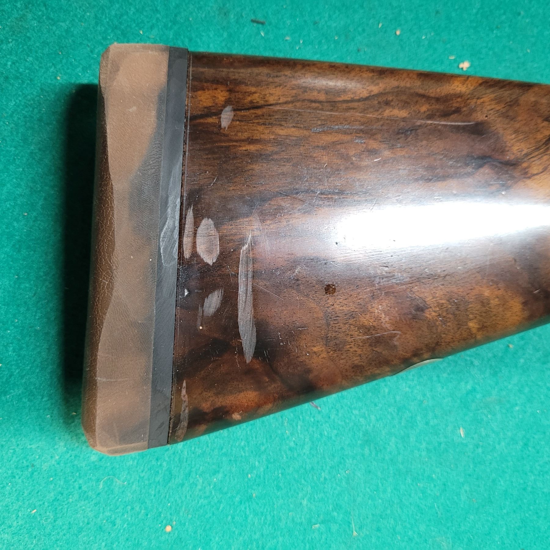 Unfortunately the highly figured walnut stock has seen some damage from a poor recoil pad installation. There are several shallow gouges near the recoil pad.