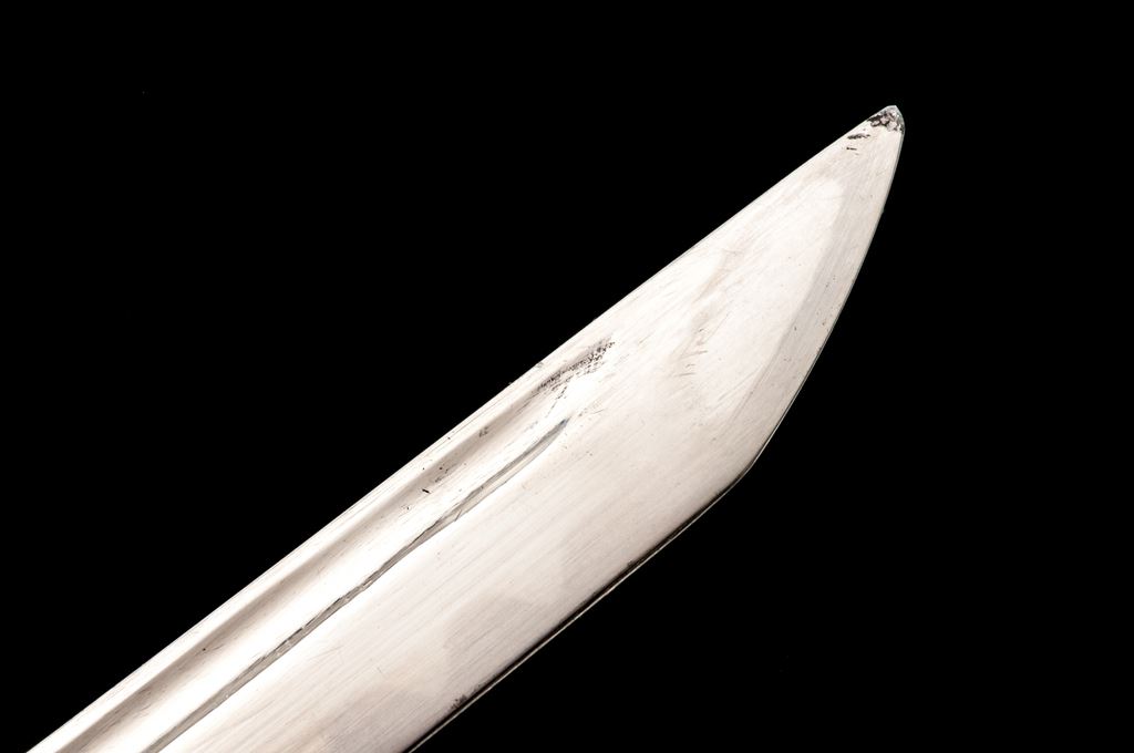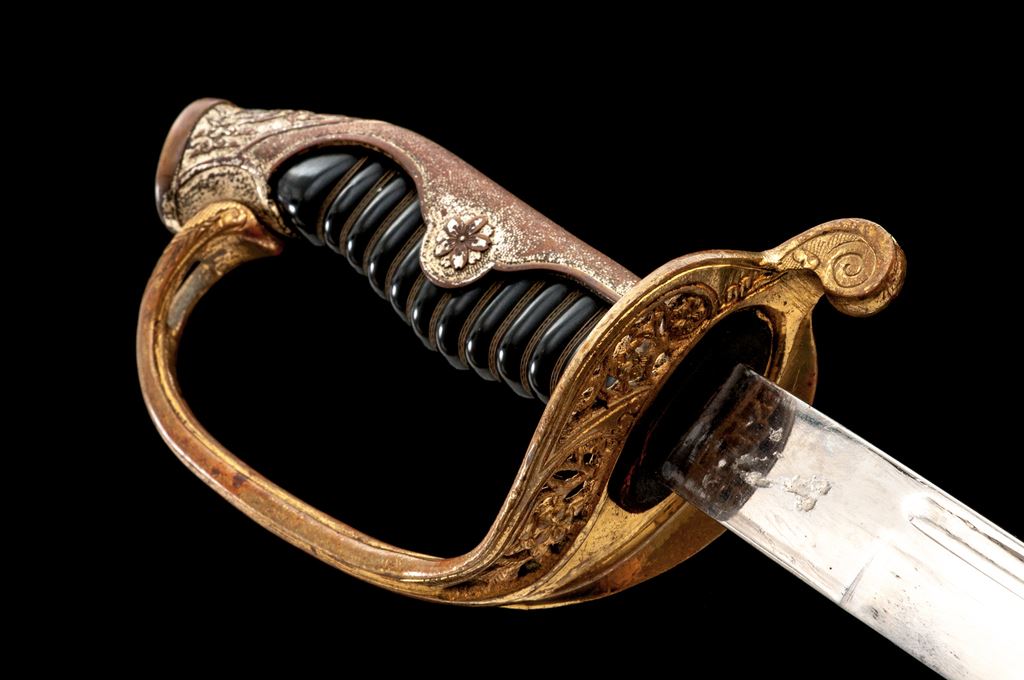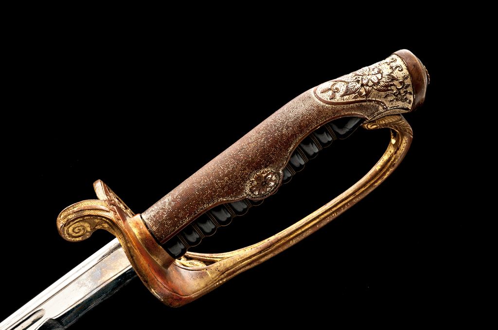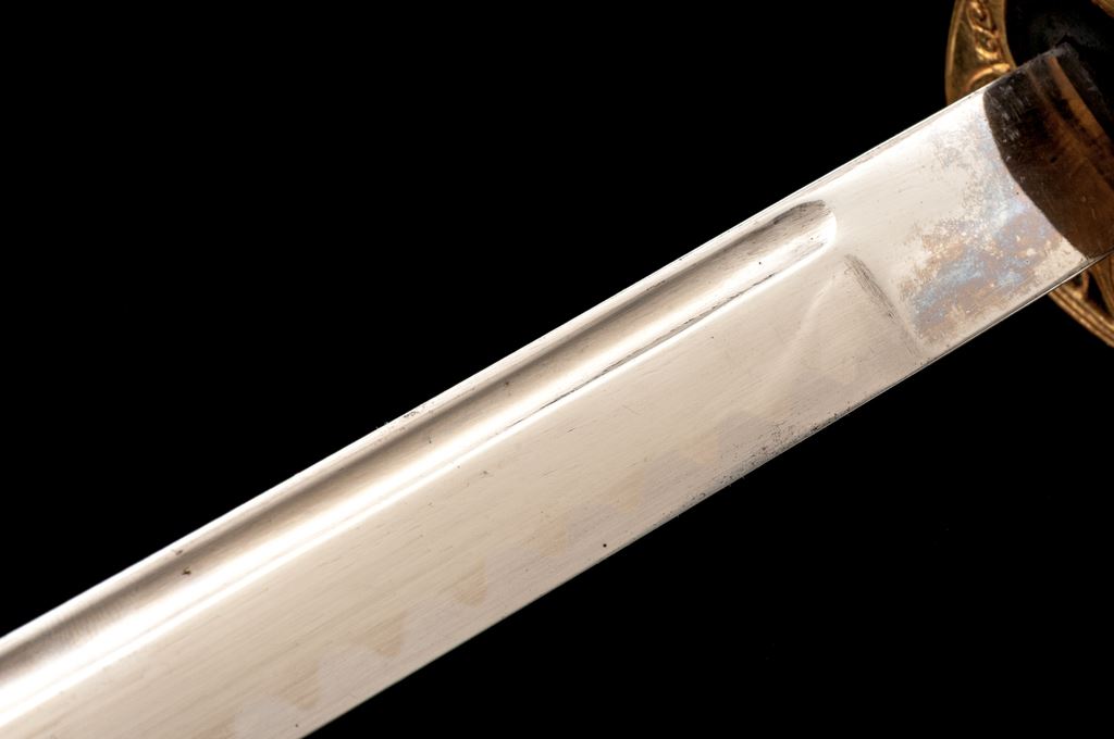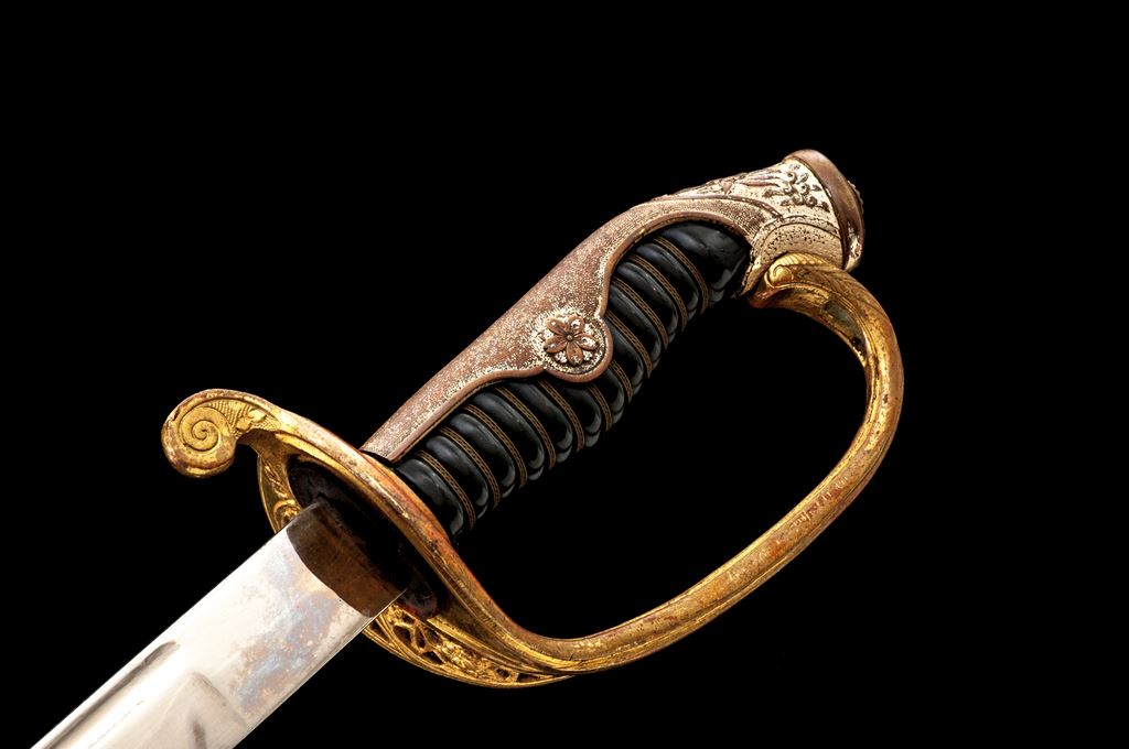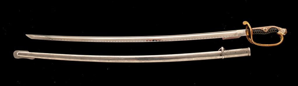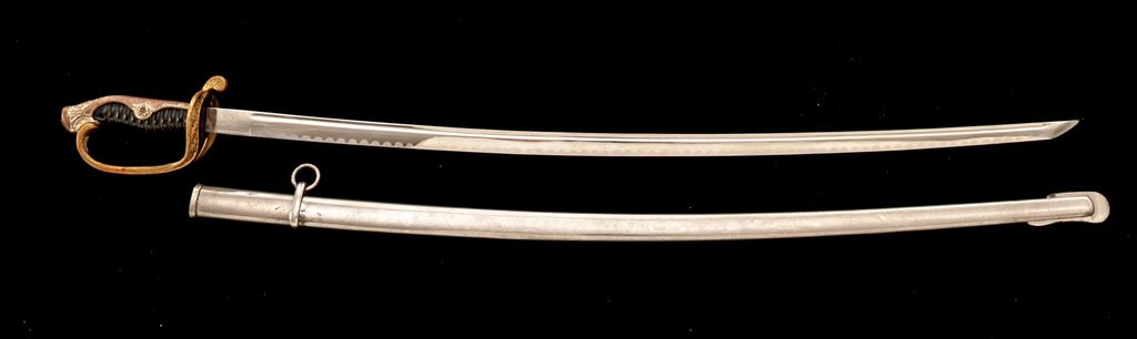 Japanese Military Parade or Dress Sword, with Scabbard, nickel-plated 32.5" blade is unmarked, with a bright nickel finish, wavy false temperline, and blood groove; original leather blade washer is present. Hilt is gold gilt over brass, with a stippled backstrap, having floral decorations at the top and cherry blossoms on either side in the middle. Guard has pierced floral decorations and a long thin knuckle bow. Grip is black composite material with triple wire wrapping. Scabbard is nickel-plated steel with one hanging ring. Condition is very good, the blade is very nice with just a few light scratches from use, and old grease residue that should clean well. Hilt shows wear to the gold gilt finish, especially around the inside base of the guard, sides of the knuckle guard, and backstrap. Hilt is a bit loose on the blade tang and has movement. Composite grip has two tight hairline cracks at the top near the pommel fitting. Wire wrapping is all intact and tight. Scabbard has two tiny dings, wear to the nickel plating on the drag and a small dent in the edge, scattered light rust, scratches overall, and is missing the retaining screw for the mouth insert at the top. Overall a nice example and a fairly large size. Est.: $200-$300.
